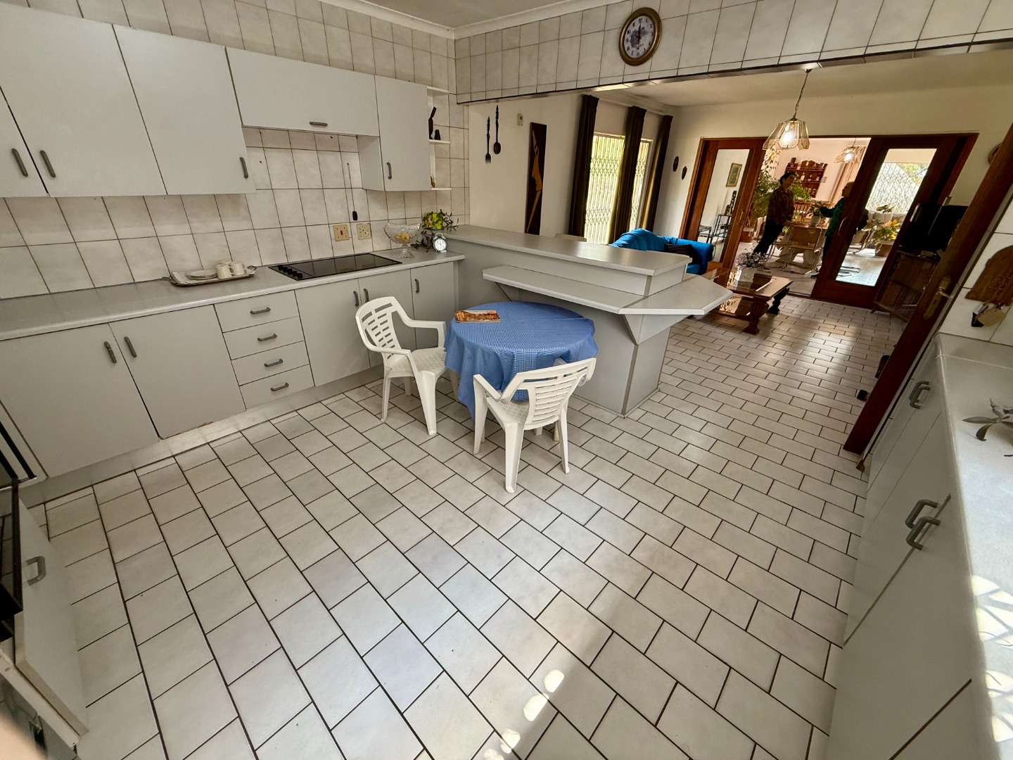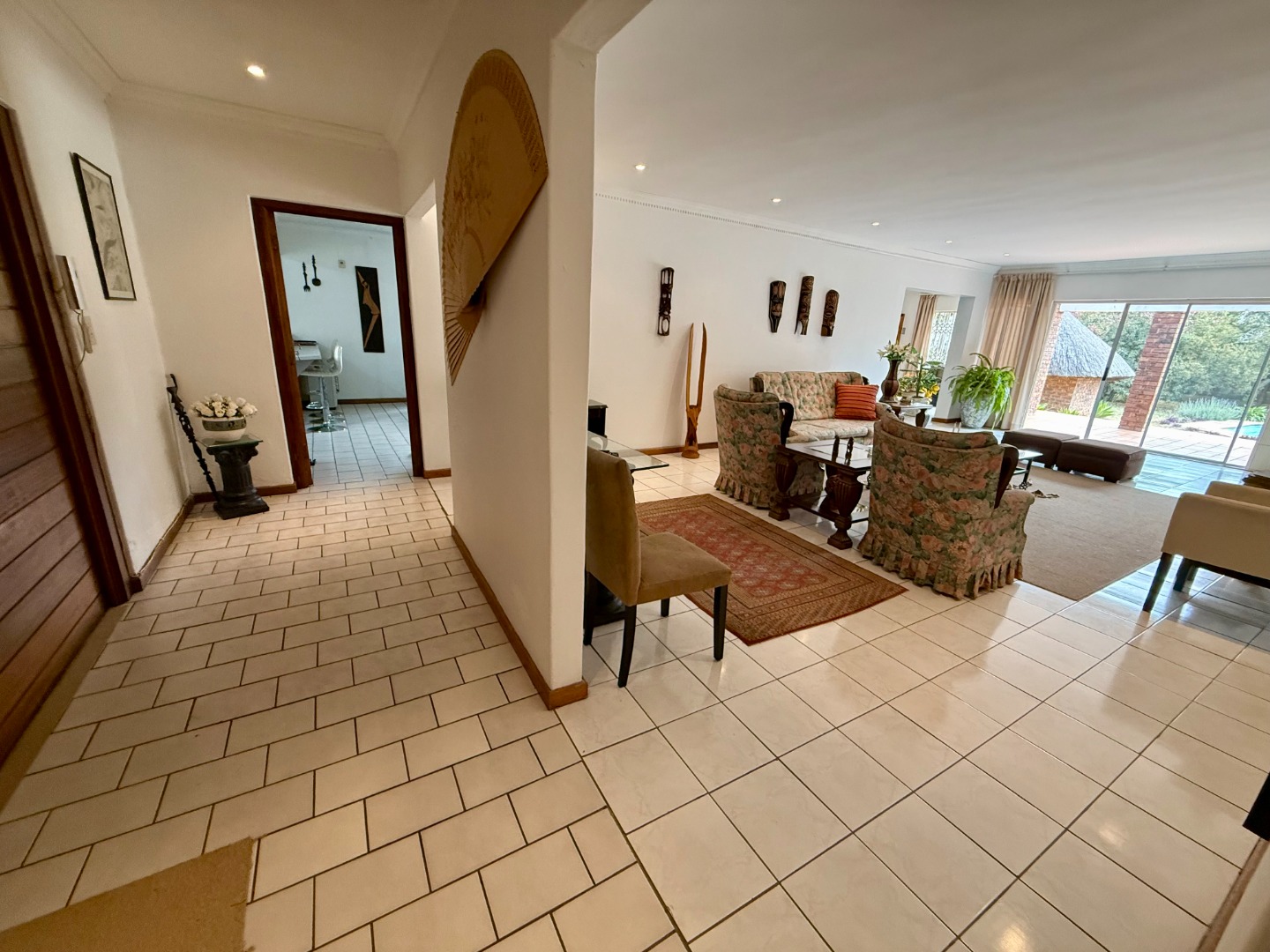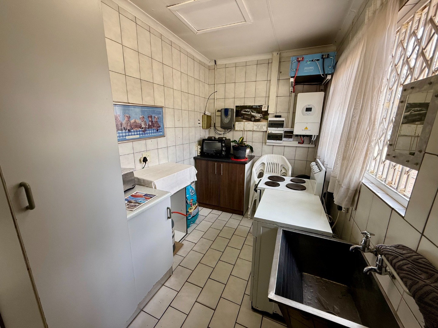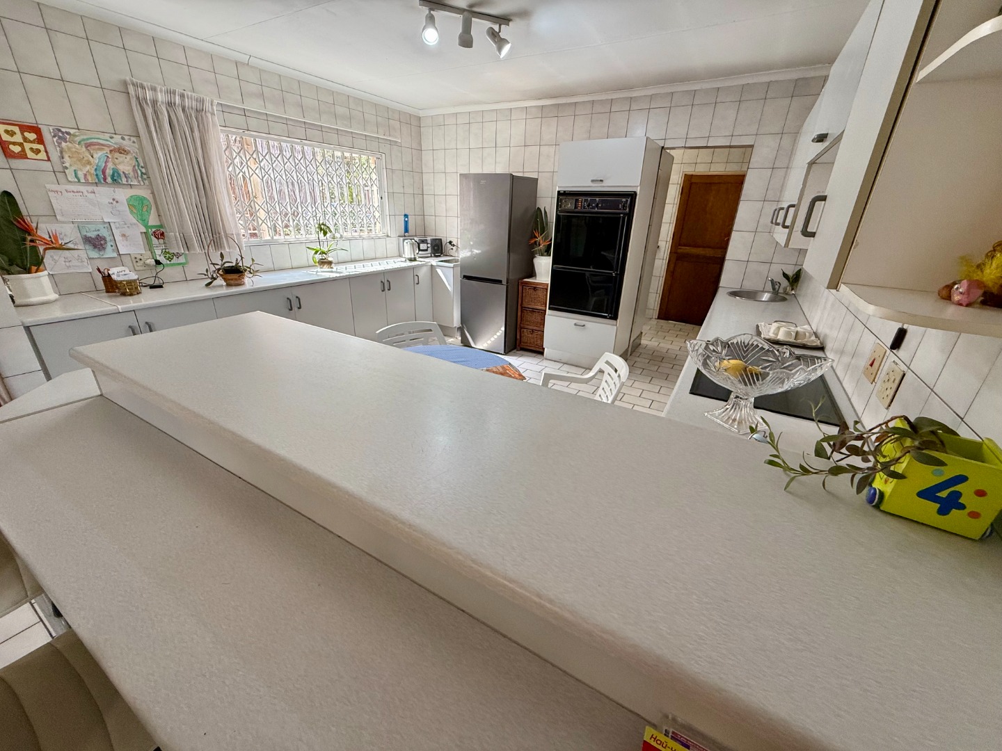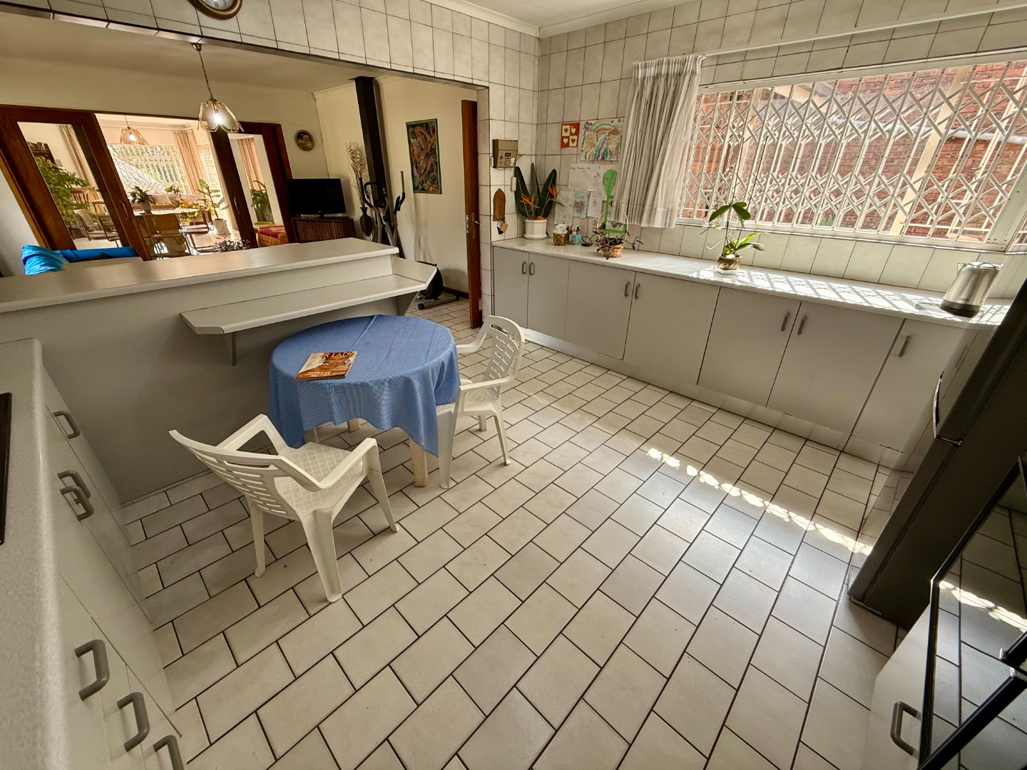 Attached to this lounge is your dining room fitted with a fireplace and this room runs open-plan with your stunning kitchen that features a scullery fitted with an inverter to keep your home running during loadshedding.