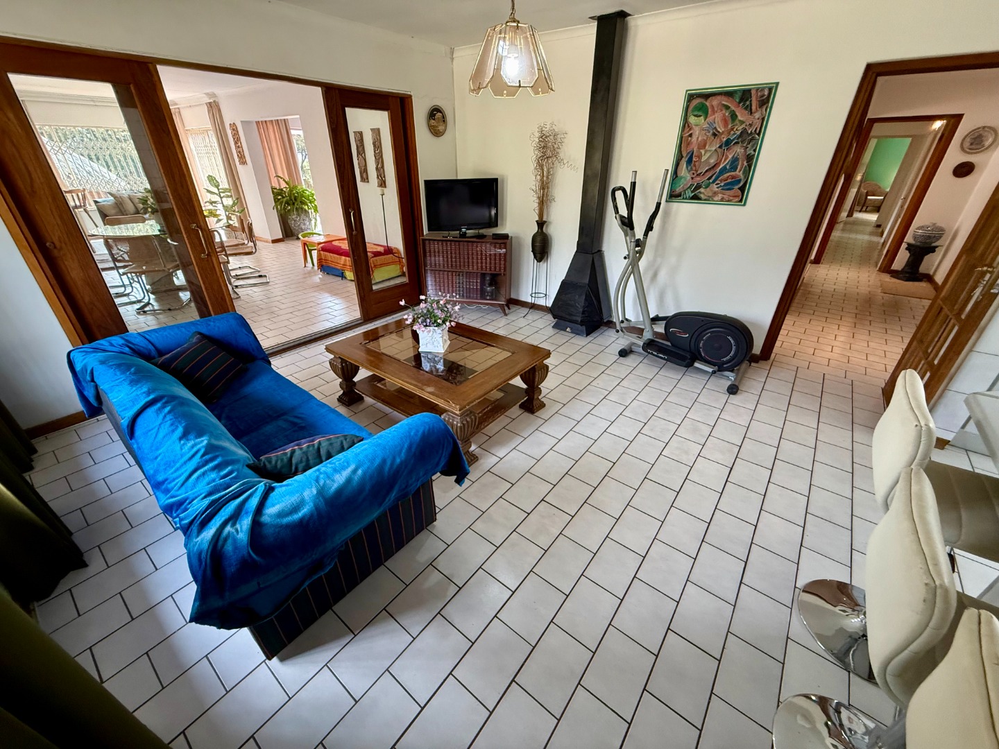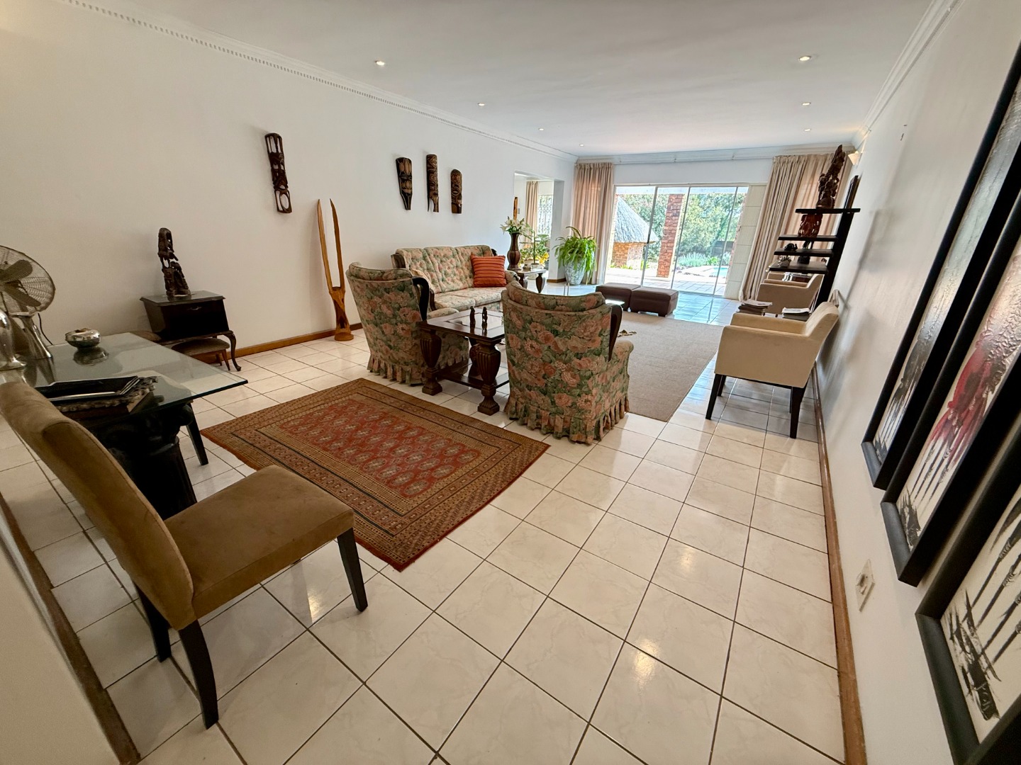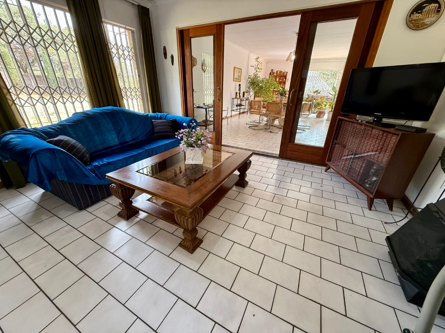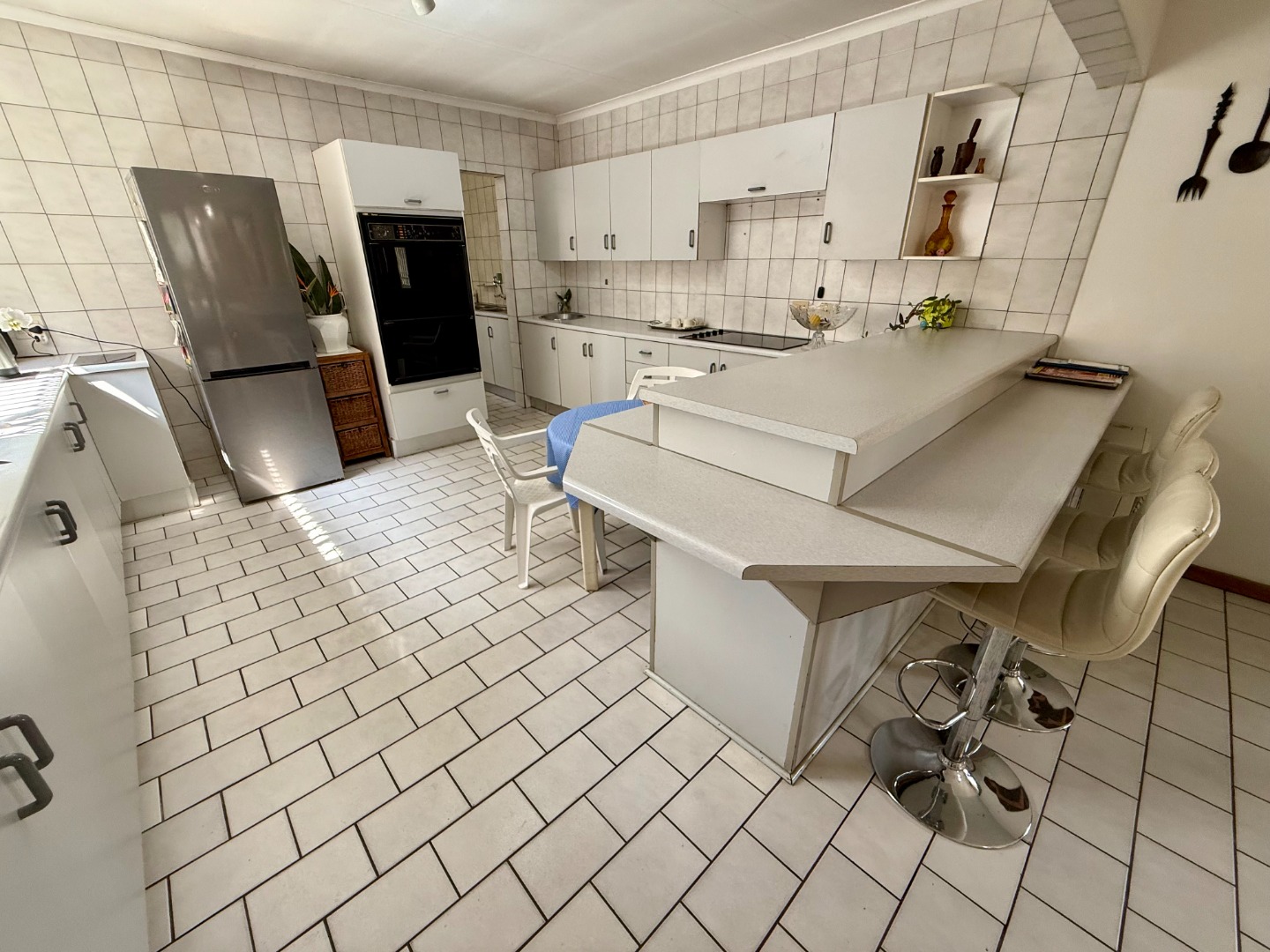 Attached to this lounge is your dining room fitted with a fireplace and this room runs open-plan with your stunning kitchen that features a scullery fitted with an inverter to keep your home running during loadshedding.