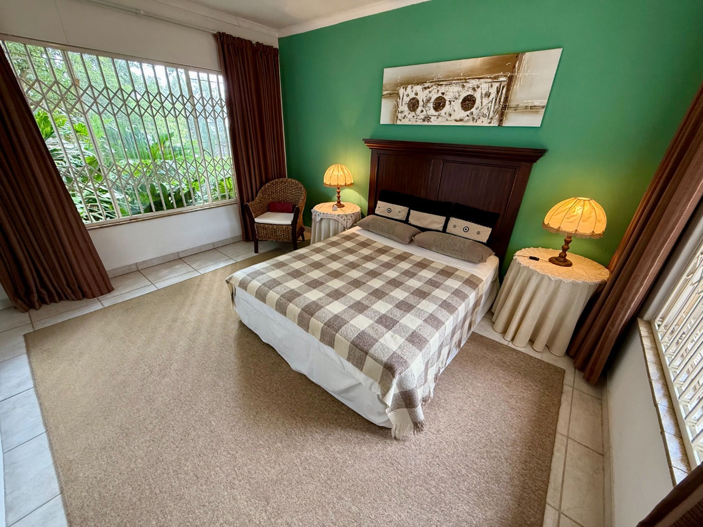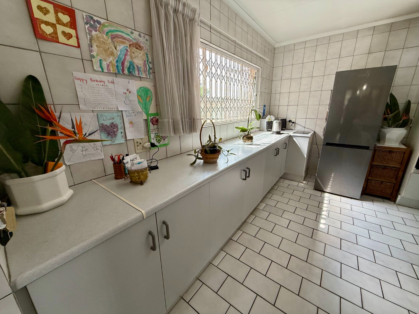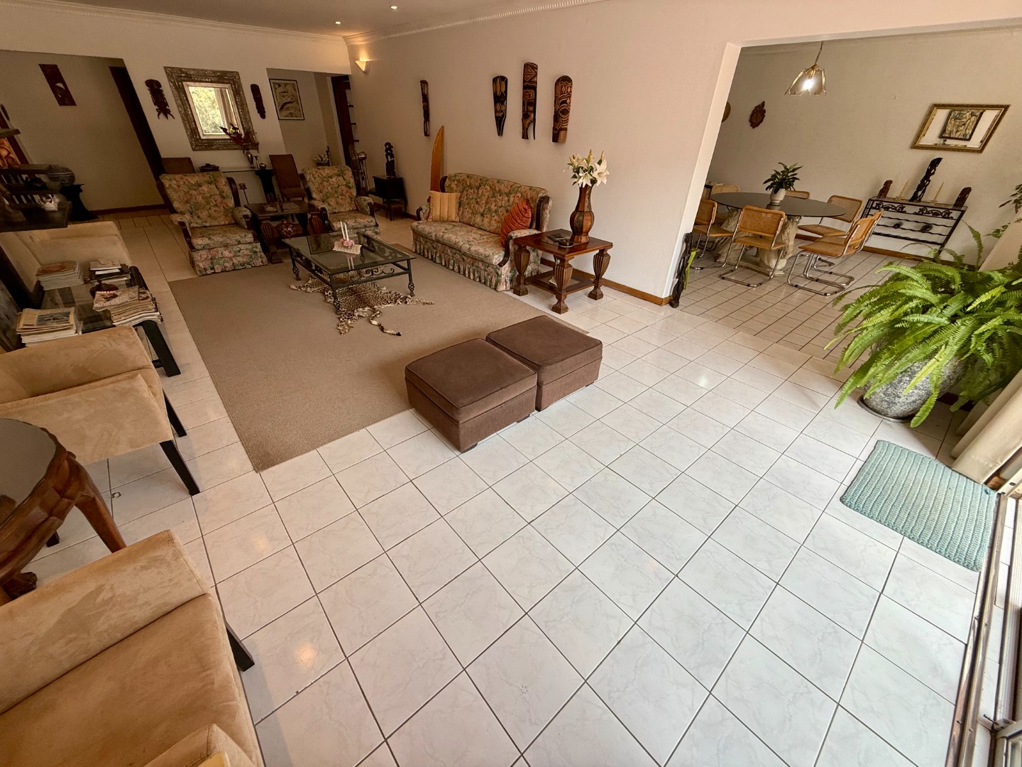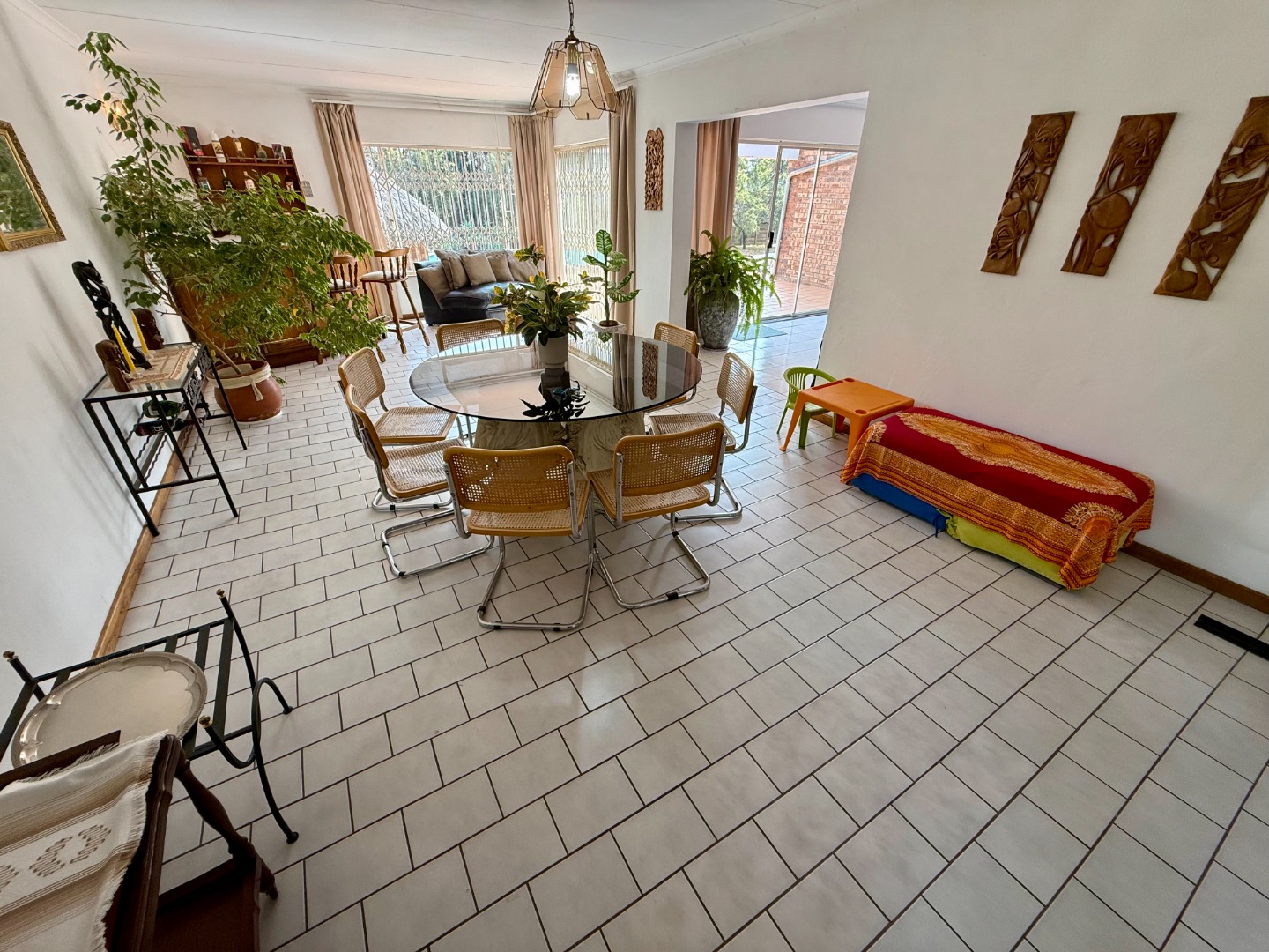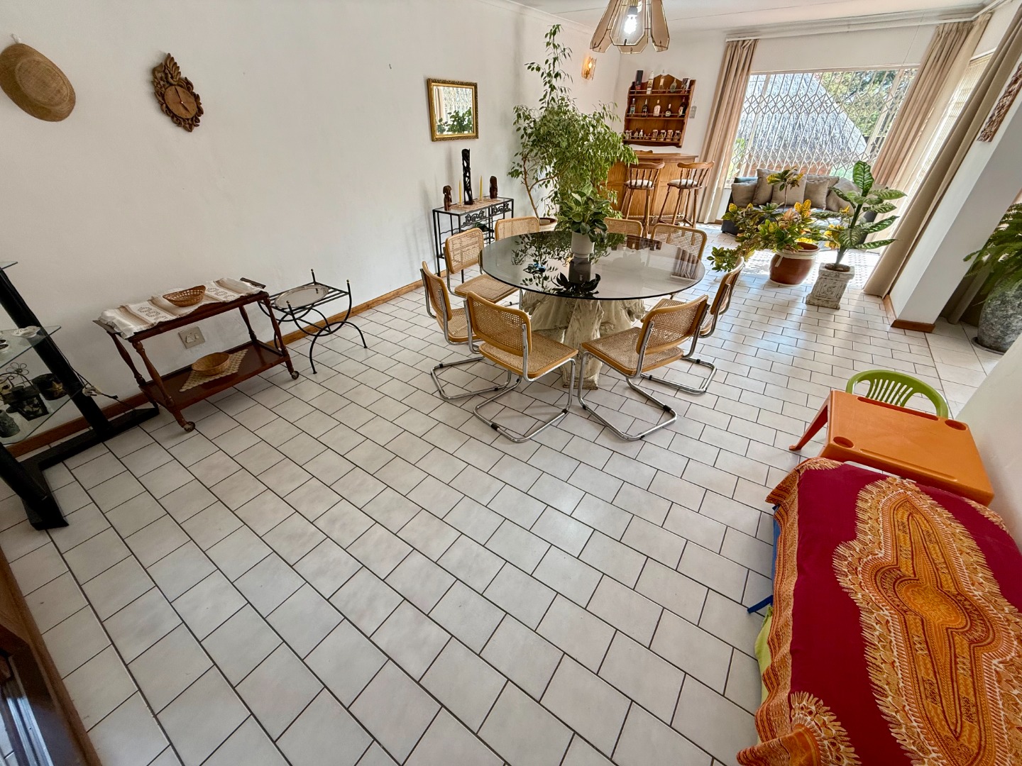 Attached to this lounge is your dining room fitted with a fireplace and this room runs open-plan with your stunning kitchen that features a scullery fitted with an inverter to keep your home running during loadshedding.