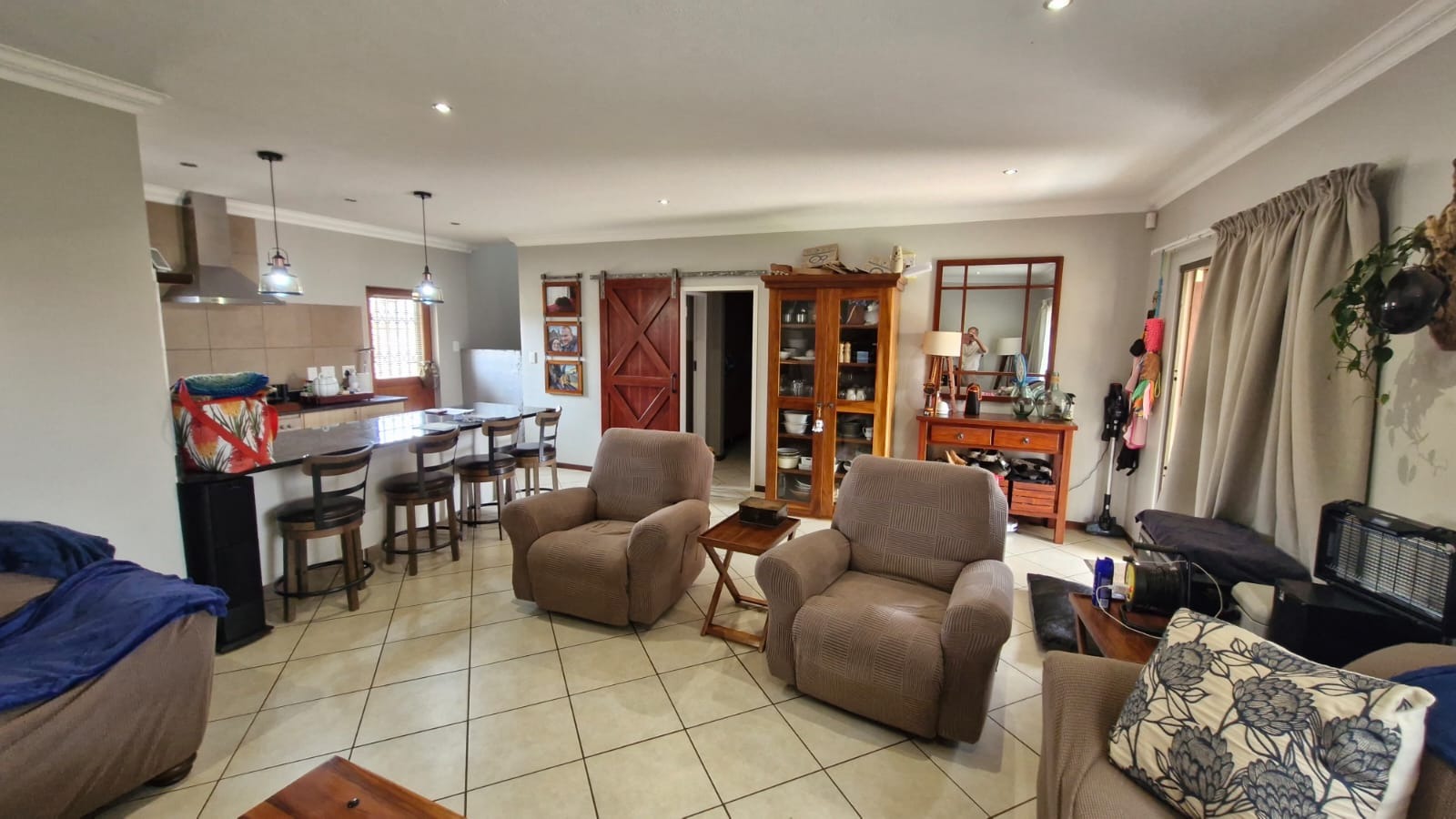 This modern two-story home presents an attractive exterior with a well-maintained garden and paved patio, perfect for outdoor enjoyment. Inside, discover a spacious open-plan living and kitchen area, featuring tiled flooring throughout. The modern kitchen boasts a large island with bar seating, elegant granite countertops, stylish pendant lighting, and light wood cabinetry. Unique barn doors add character, while 3 air conditioning unit ensures comfort through out the house.