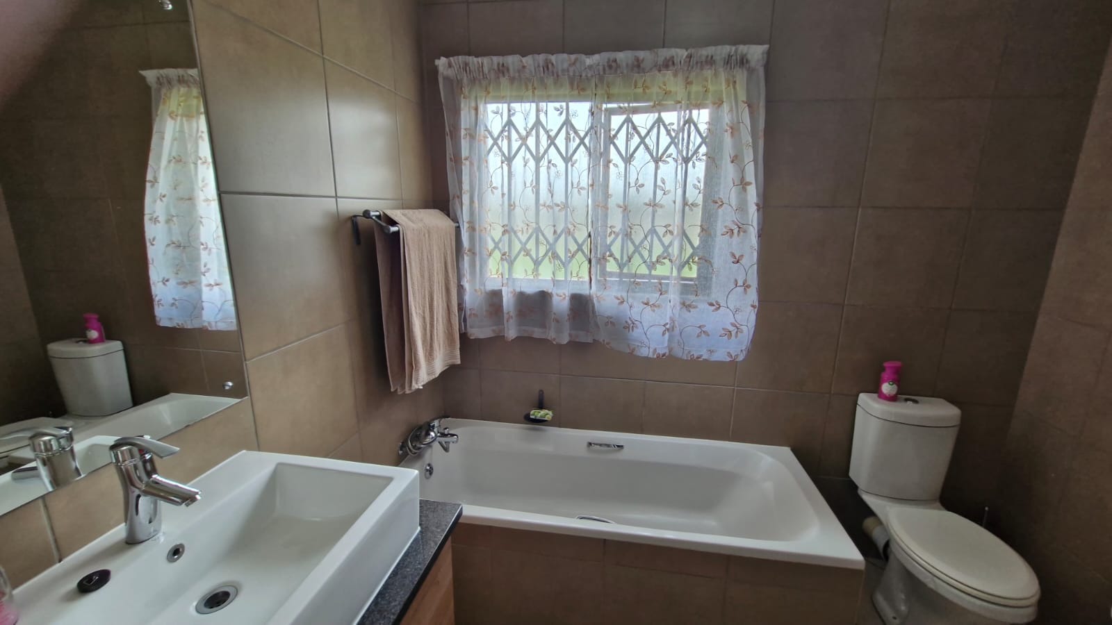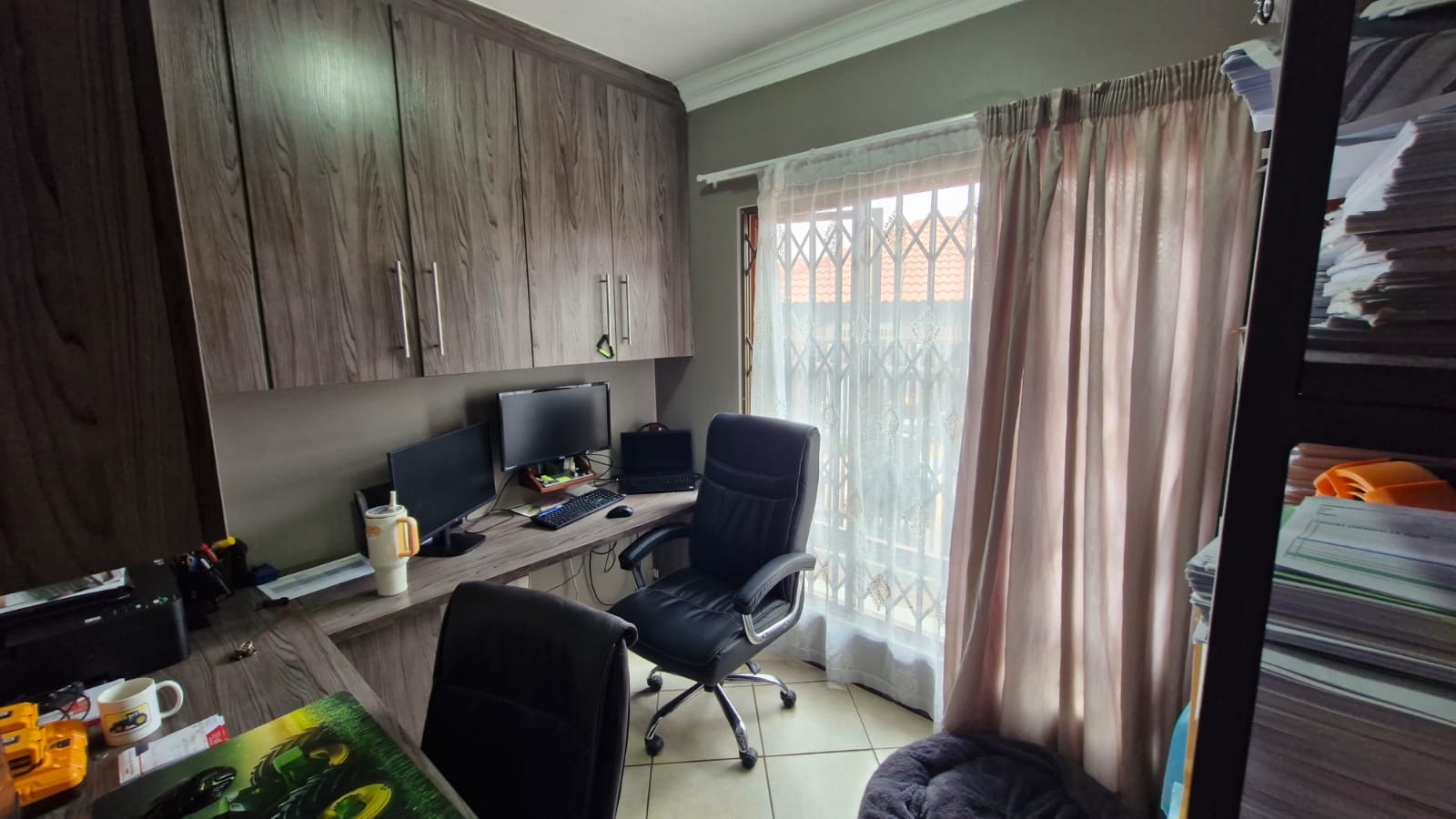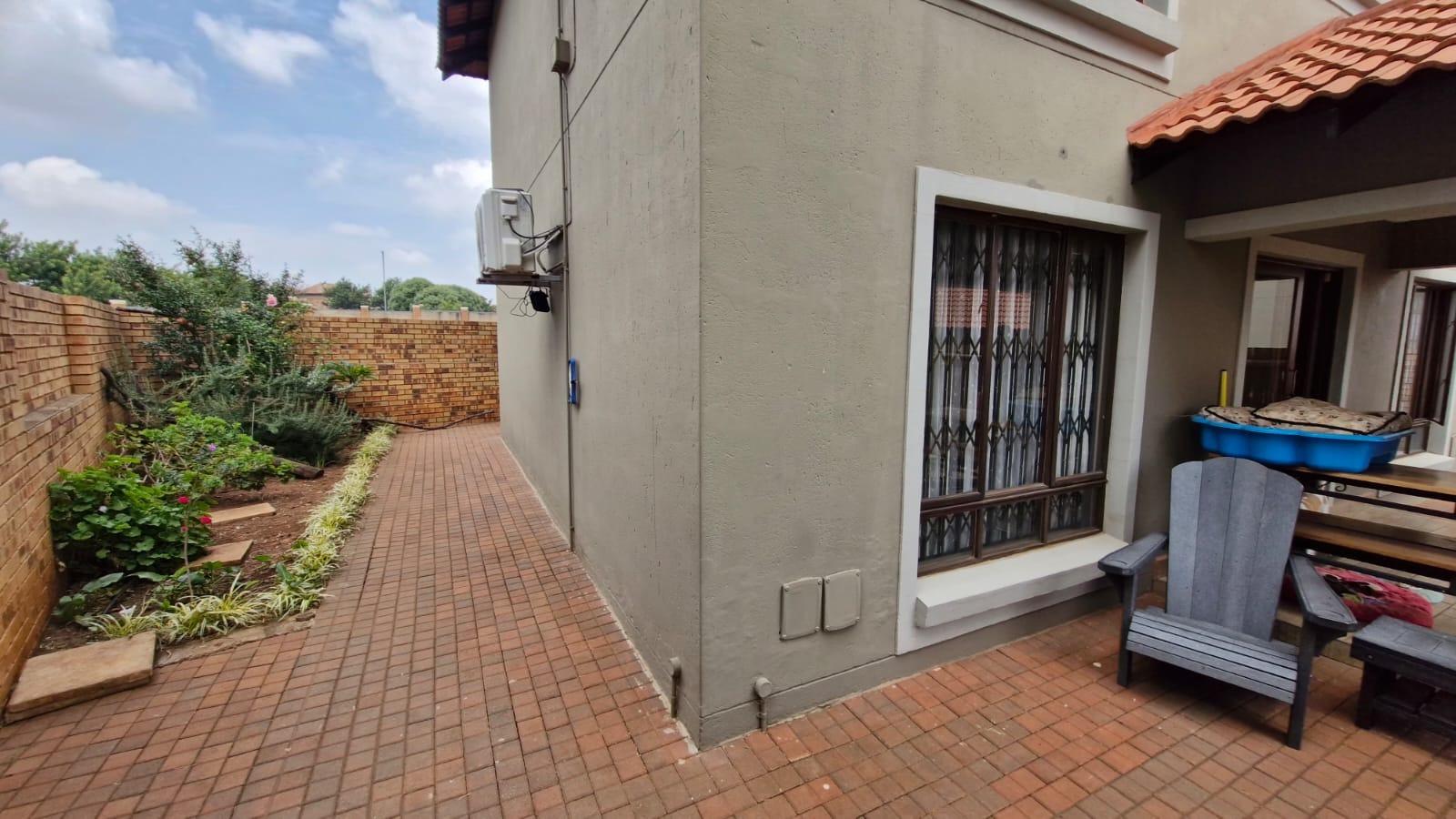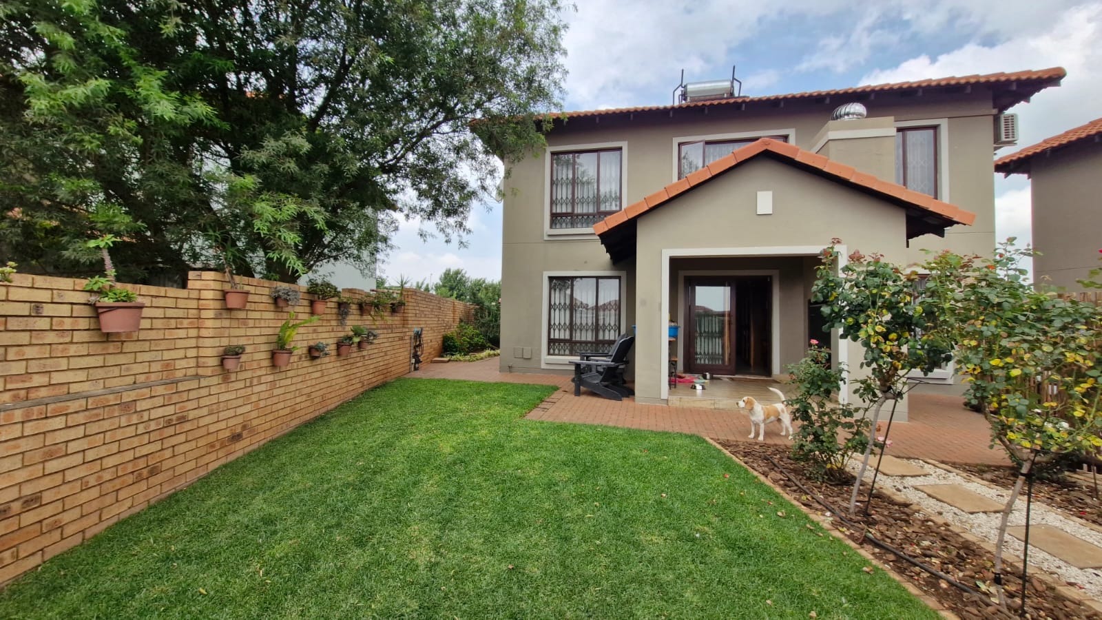 The residence comprises three comfortable bedrooms and 2.5 bathrooms, including a private ensuite and a guest toilet. A dedicated study provides an ideal space for work or hobbies. Outside, a private patio with a built-in braai is perfect for entertaining, complemented by a well-kept garden with an irrigation system.
