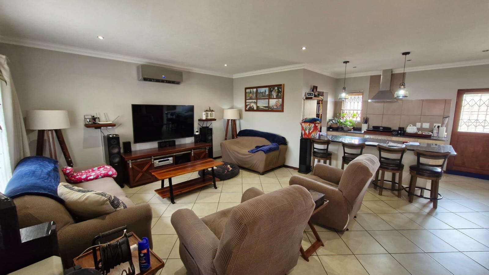 This modern two-story home presents an attractive exterior with a well-maintained garden and paved patio, perfect for outdoor enjoyment. Inside, discover a spacious open-plan living and kitchen area, featuring tiled flooring throughout. The modern kitchen boasts a large island with bar seating, elegant granite countertops, stylish pendant lighting, and light wood cabinetry. Unique barn doors add character, while 3 air conditioning unit ensures comfort through out the house.