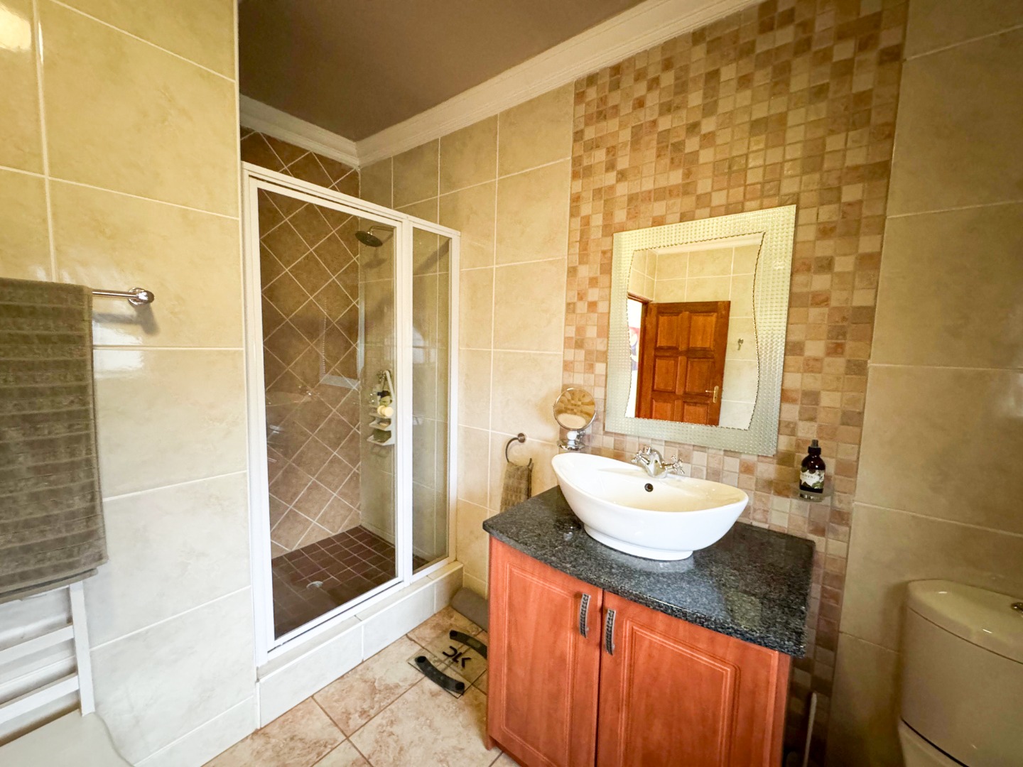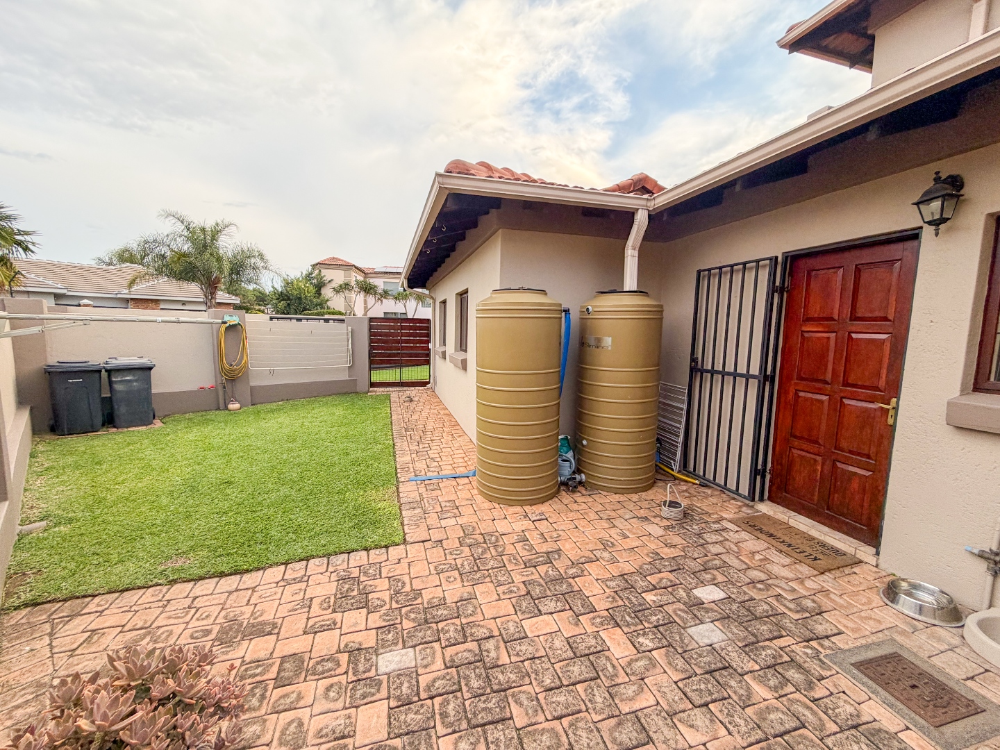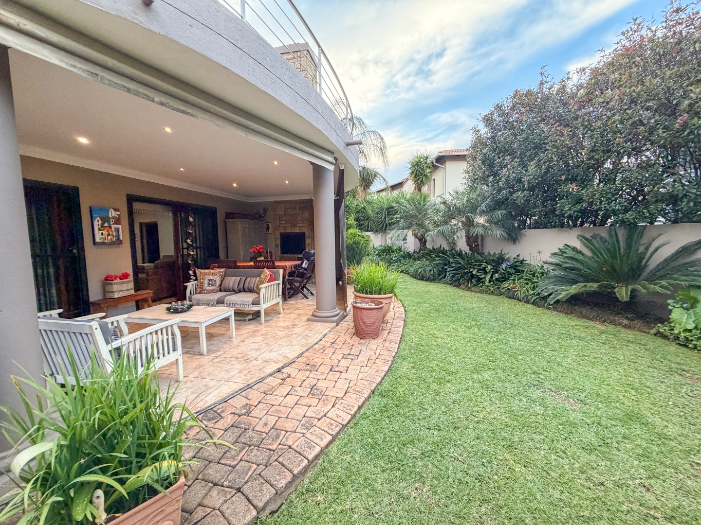 Discover an unparalleled lifestyle within the esteemed Raslouw Manor security estate in Centurion, South Africa. This magnificent residence, boasting a generous 329 sqm under roof on a 614 sqm erf, immediately captivates with its sophisticated kerb appeal. The meticulously maintained exterior features elegant stone cladding, warm terracotta roof tiles, and a lush, manual irrigated garden, complemented by a spacious paved driveway leading to a double automated garage with charming wooden doors.