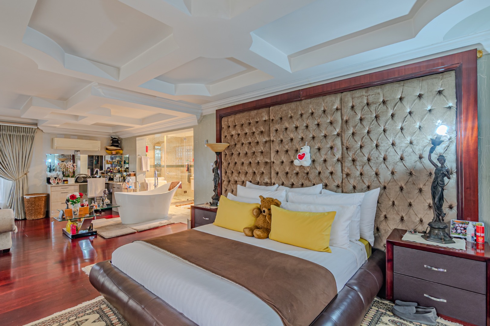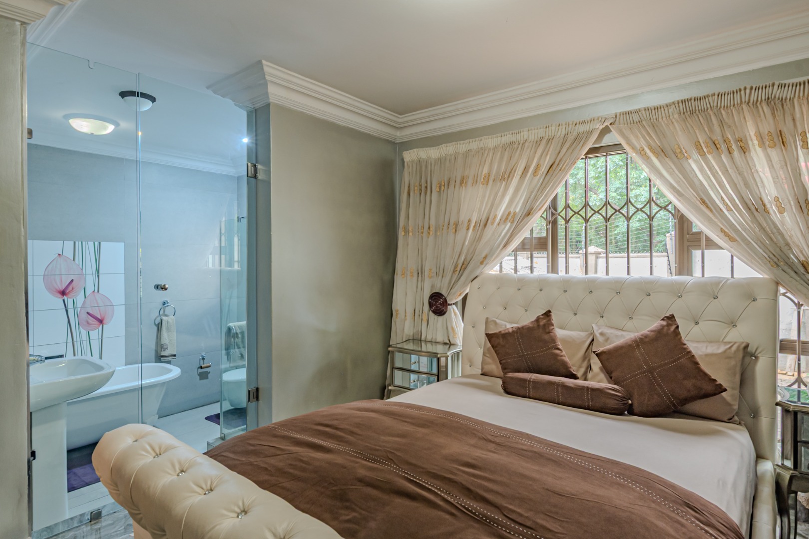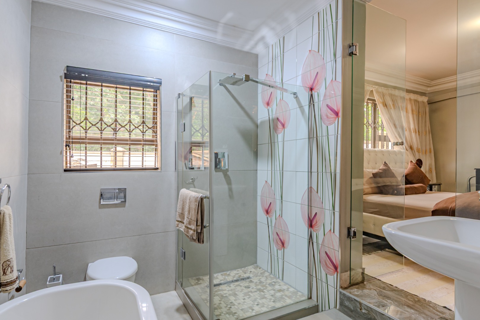 The magnificent en-suite bathroom is a true statement of refined living, showcasing a beautifully crafted freestanding bath that serves as the centerpiece