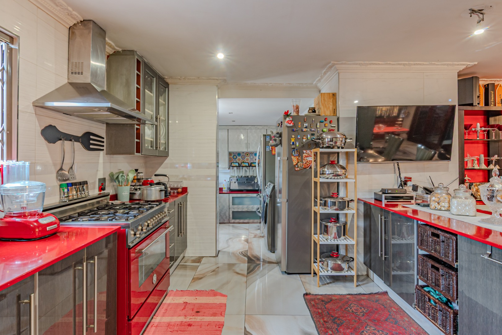 The gourmet kitchen stands as the true centerpiece of the home, thoughtfully designed to blend luxury with functionality. It is fully equipped with custom-crafted cabinetry, and generous preparation space, making it ideal for both everyday cooking and hosting with ease. A separate scullery and pantry enhance convenience and organization, keeping the main kitchen pristine and uncluttered.
