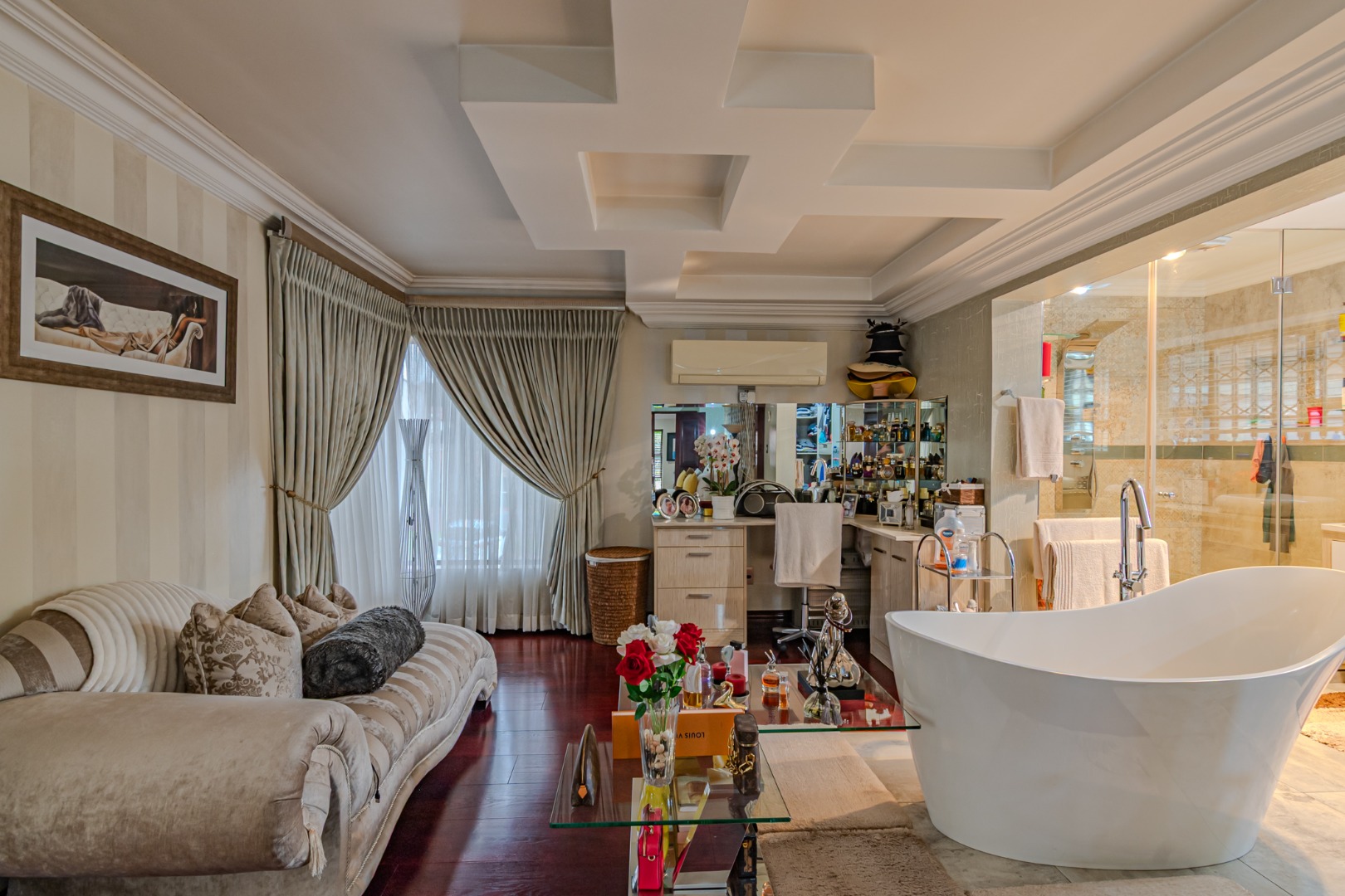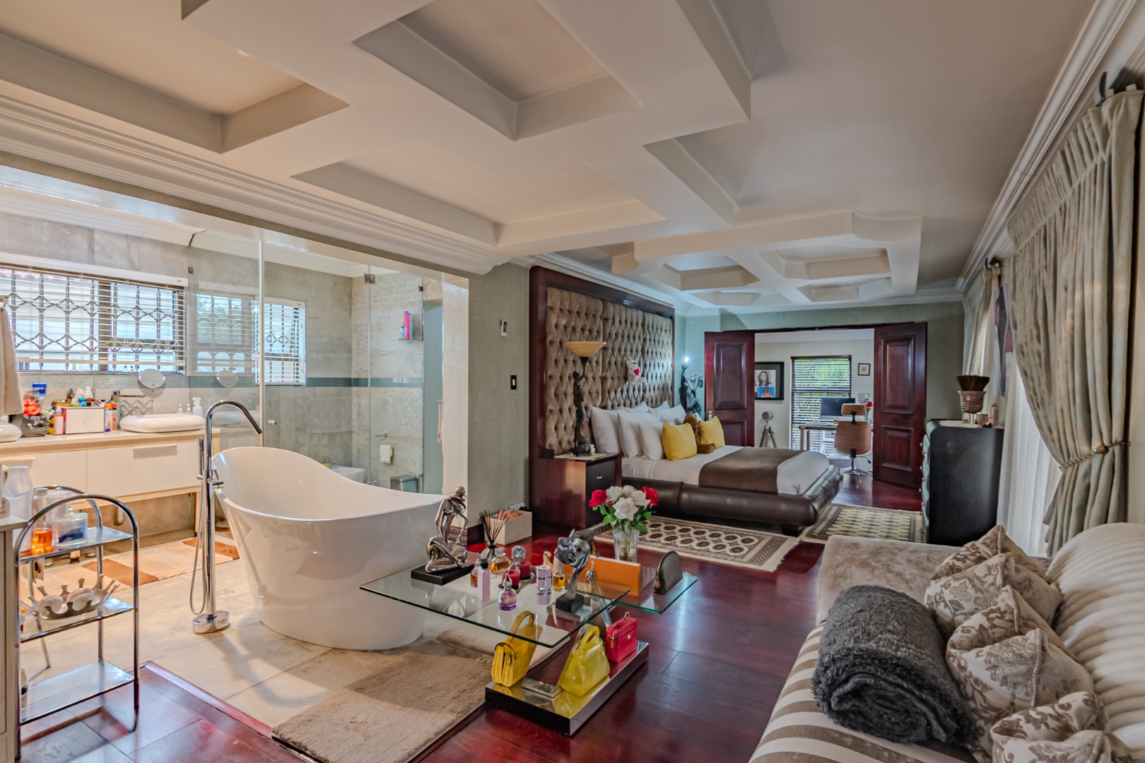 This impressive retreat includes an exclusive pajama lounge, creating a tranquil space to relax and unwind in complete privacy.
