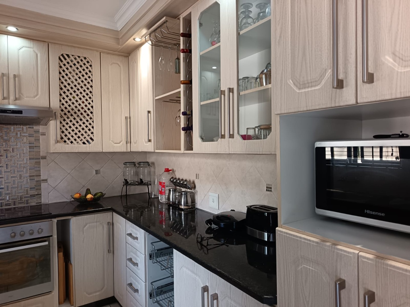 · The kitchen is fitted with sleek, modern vinyl-covered cabinetry that offers a clean, streamlined look while being both durable and easy to maintain. These stylish cupboards are paired with elegant granite countertops, adding a touch of sophistication and luxury to the space. The kitchen is further complemented by a built-in electric oven and stove, double kitchen sinks, making food preparation and clean-up effortless, with a well-sized pantry. Together, these features create a practical and well-equipped kitchen.