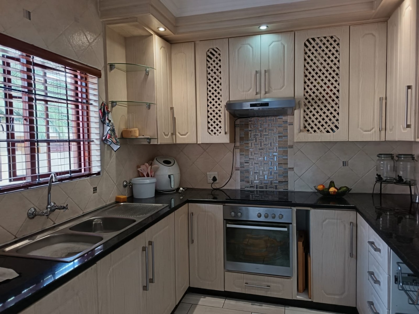 · The kitchen is fitted with sleek, modern vinyl-covered cabinetry that offers a clean, streamlined look while being both durable and easy to maintain. These stylish cupboards are paired with elegant granite countertops, adding a touch of sophistication and luxury to the space. The kitchen is further complemented by a built-in electric oven and stove, double kitchen sinks, making food preparation and clean-up effortless, with a well-sized pantry. Together, these features create a practical and well-equipped kitchen.