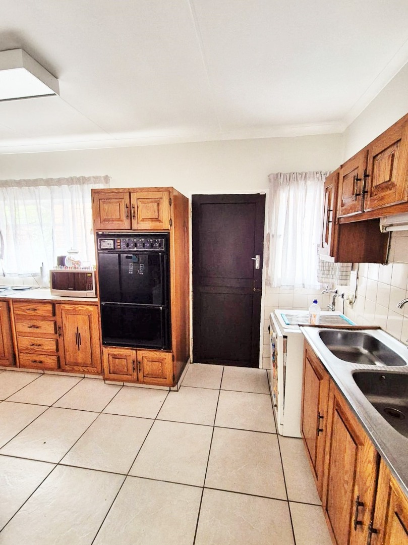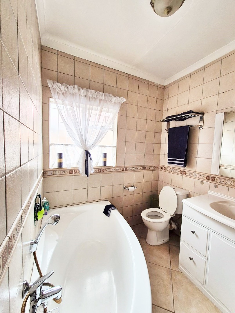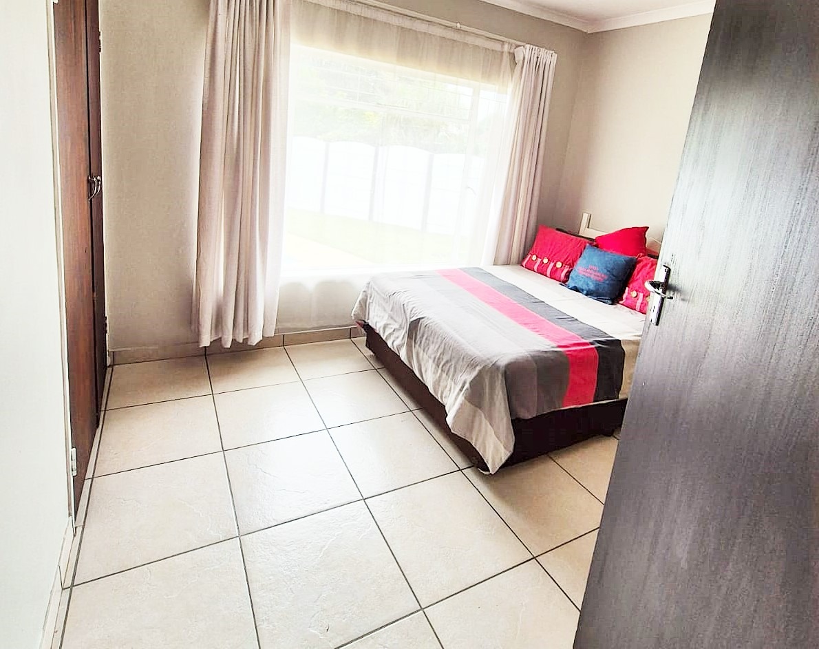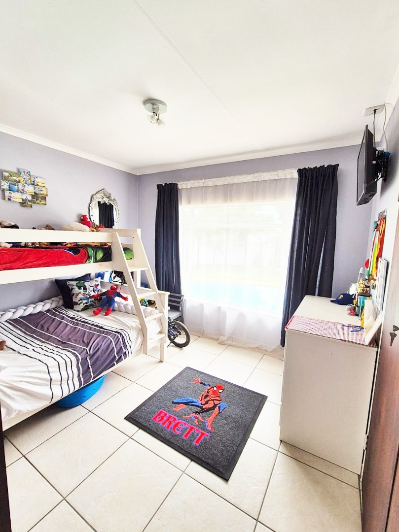 Accommodation comprises three bedrooms, with the main bedroom featuring an en-suite bathroom for added privacy. One bedroom is equipped with an air conditioning unit, and all benefit from natural light and tiled floors. The property's outdoor amenities are a highlight, featuring a large swimming pool, a spacious garden with mature trees, and a comfortable enclosed lapa with a built-in braai, ideal for outdoor entertaining. Paving around the pool area and a well-kept garden enhance the outdoor apearance.