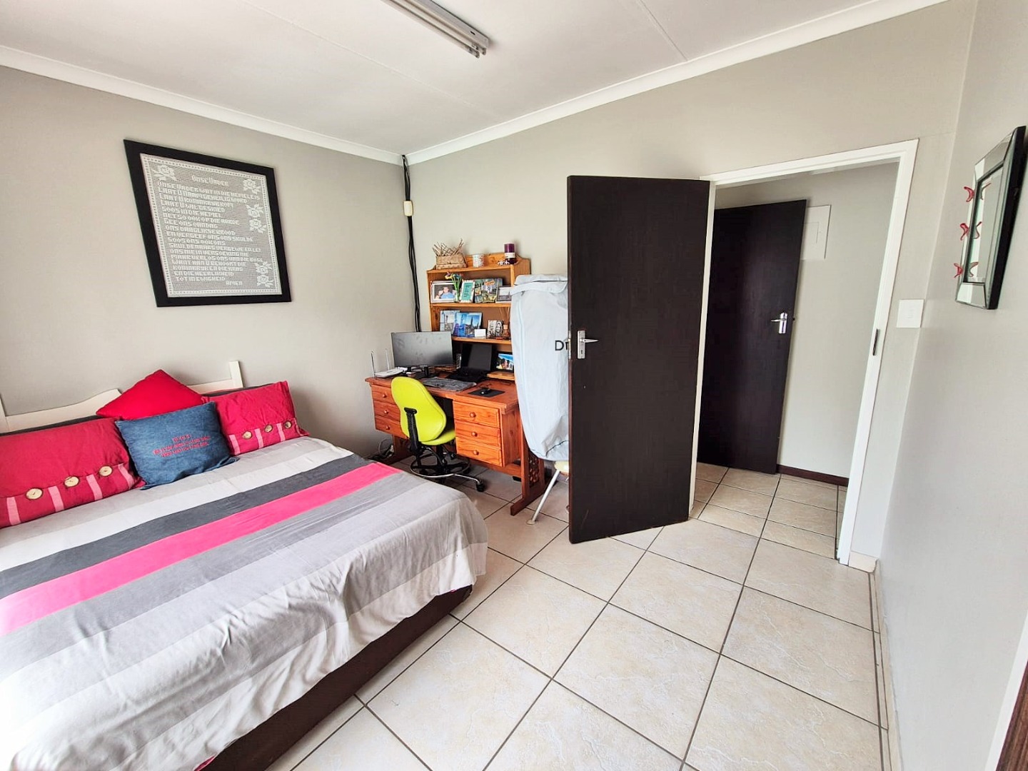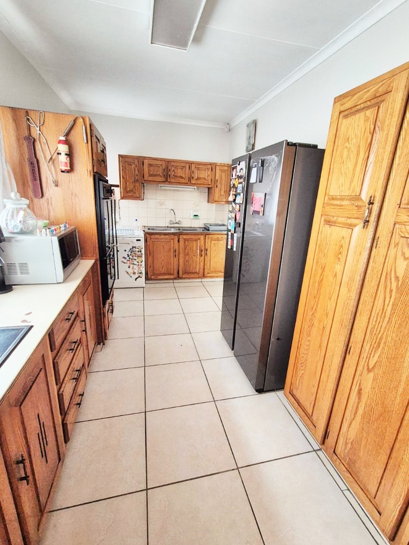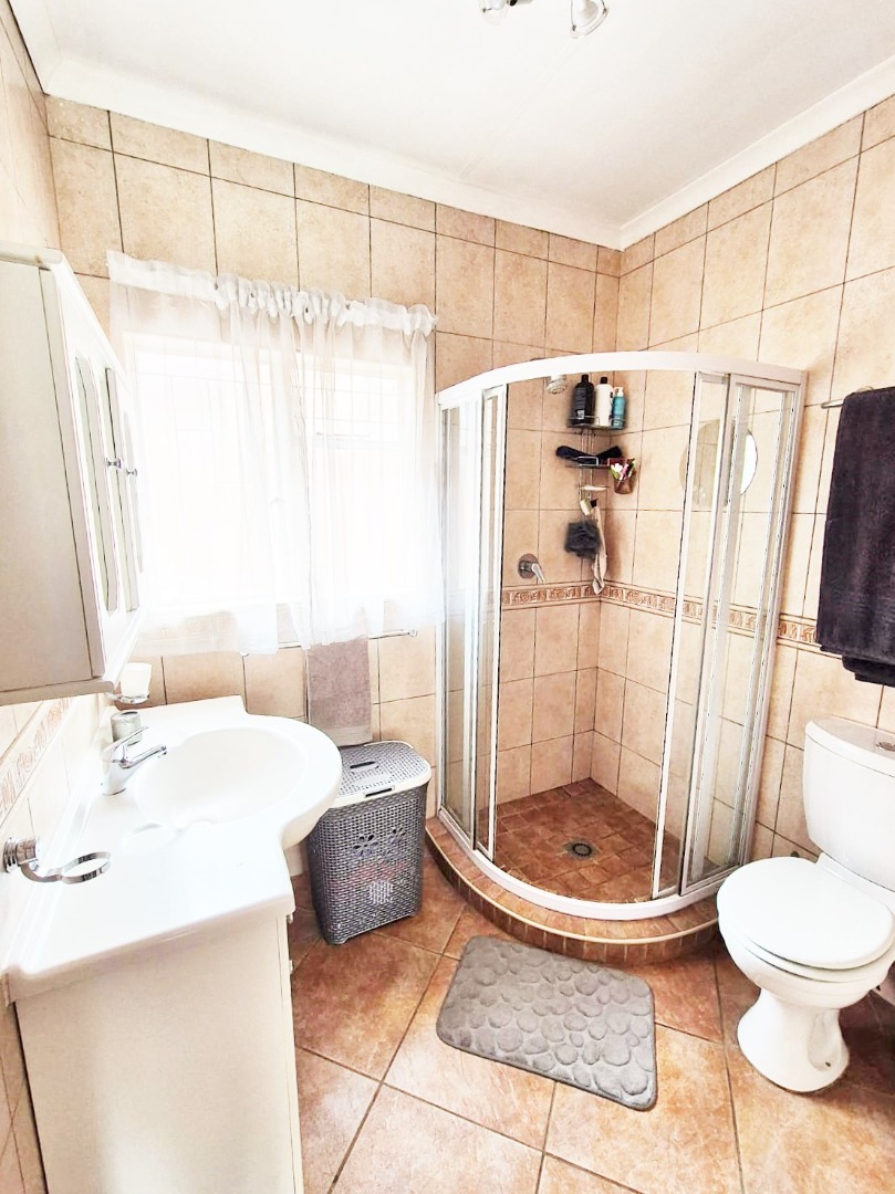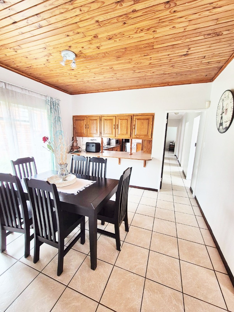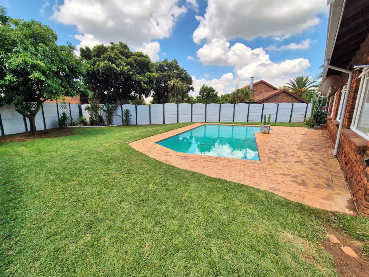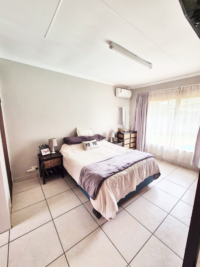 Accommodation comprises three bedrooms, with the main bedroom featuring an en-suite bathroom for added privacy. One bedroom is equipped with an air conditioning unit, and all benefit from natural light and tiled floors. The property's outdoor amenities are a highlight, featuring a large swimming pool, a spacious garden with mature trees, and a comfortable enclosed lapa with a built-in braai, ideal for outdoor entertaining. Paving around the pool area and a well-kept garden enhance the outdoor apearance.