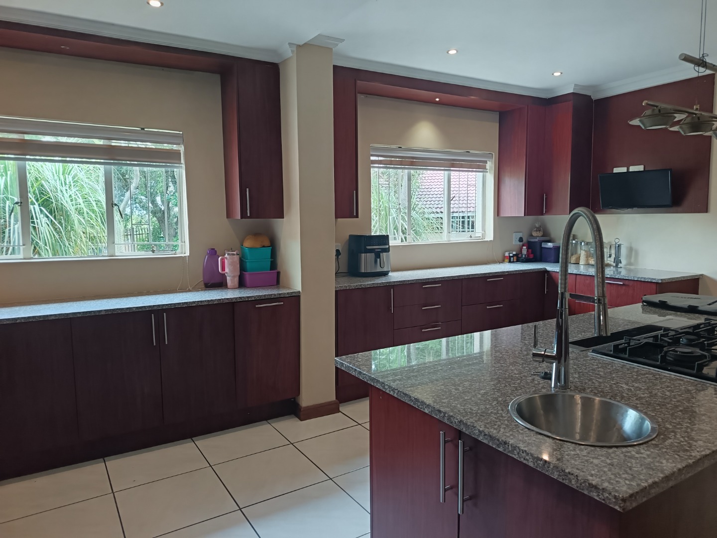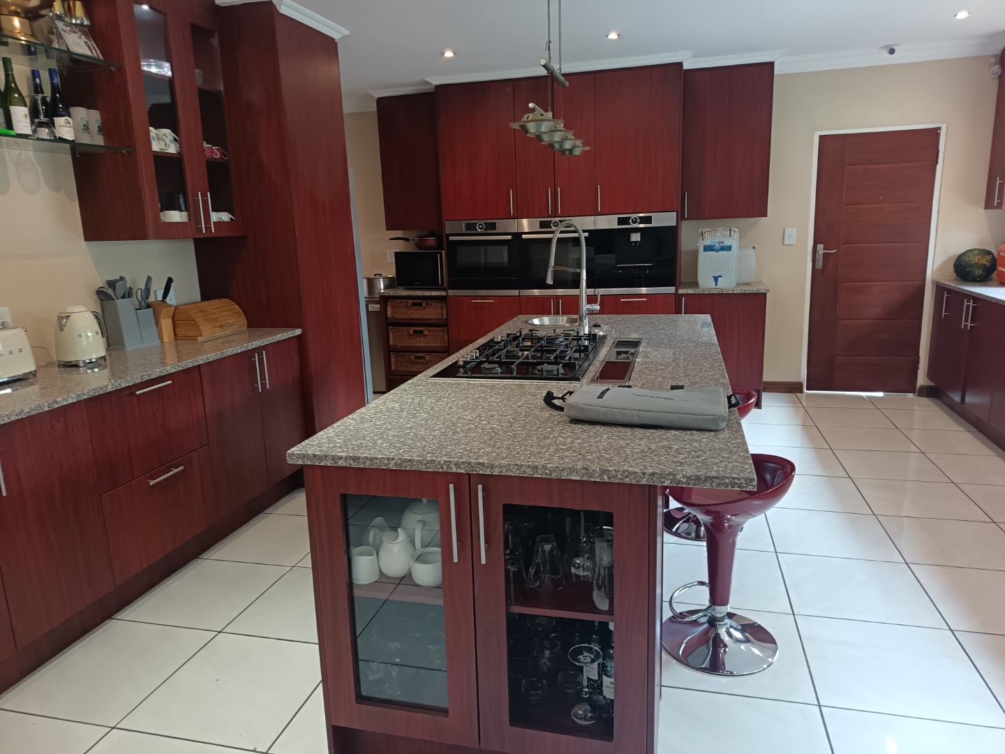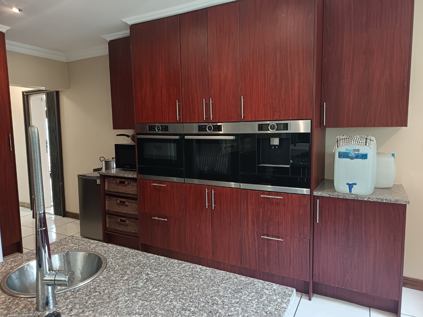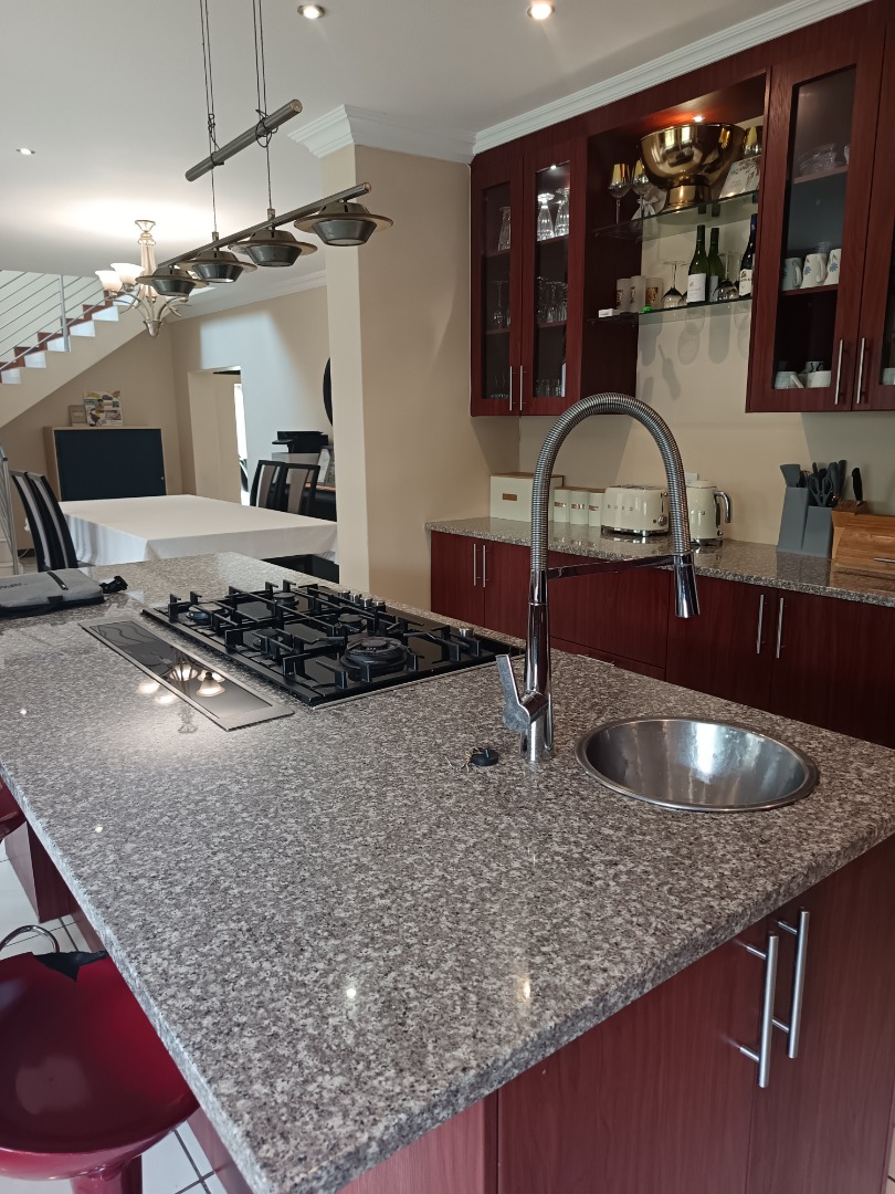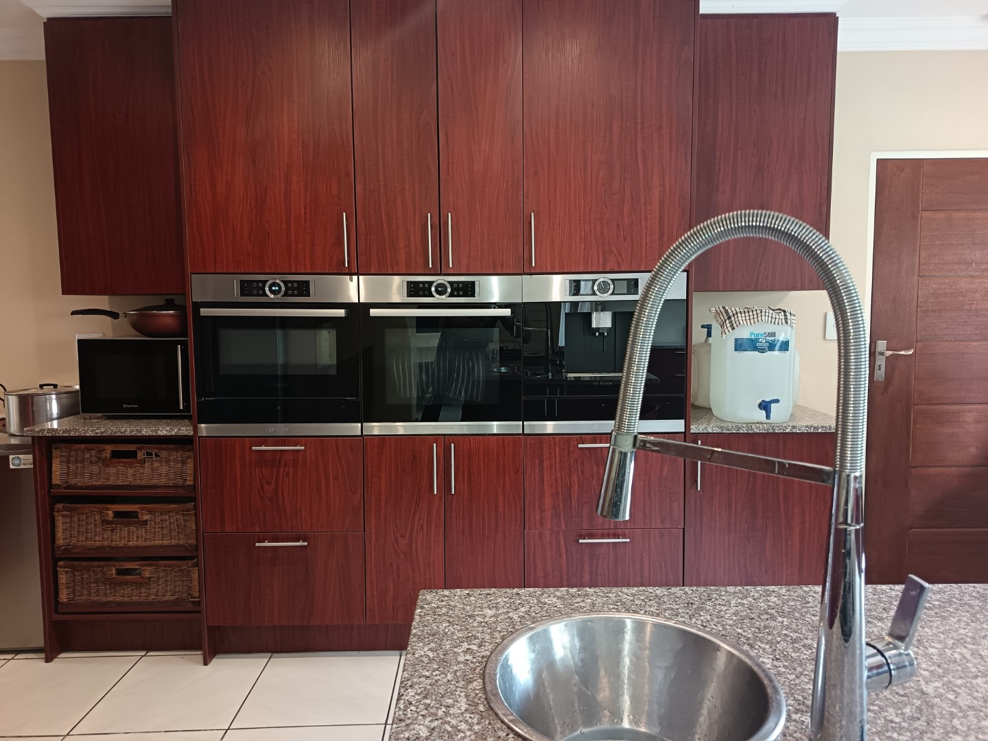 kitchen offers a gas hob with dual electric ovens, complemented by ample designer cupboards and granite countertops throughout. A double scullery and pantry with dedicated water points for appliances are tucked away from the main kitchen, keeping the heart of the home neat and clutter-free.
