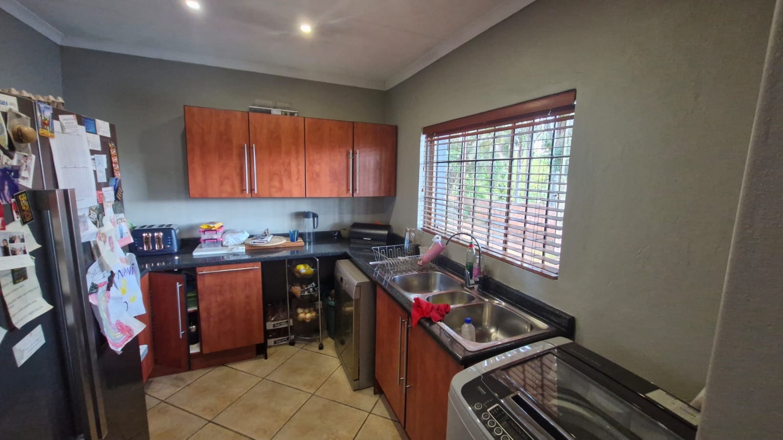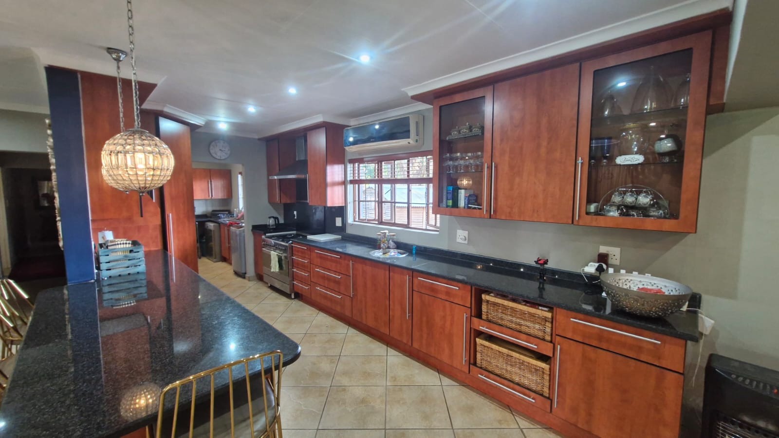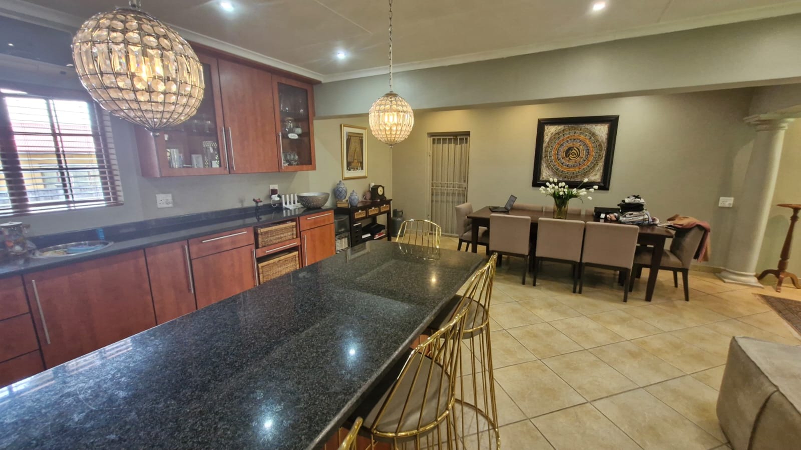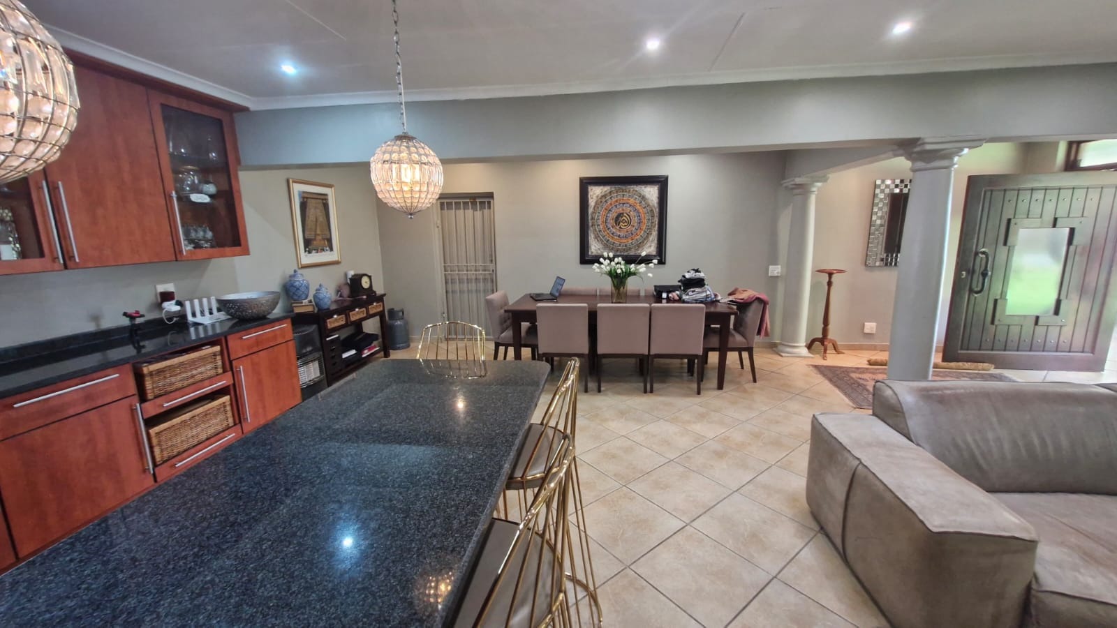 This inviting residential property in Valhalla, Centurion, offers a thoughtfully designed open-plan layout, seamlessly connecting the living, dining, and kitchen areas. The modern kitchen is a highlight, featuring extensive wooden cabinetry, sleek dark granite countertops, and a large breakfast bar with stylish pendant lighting, provides ample storage and a functional space for culinary pursuits, complemented by a dedicated pantry. Tiled flooring extends throughout these communal spaces, enhanced by abundant recessed lighting and natural light, creating a bright and welcoming atmosphere. A separate family TV room and a dedicated study provide additional versatile spaces.