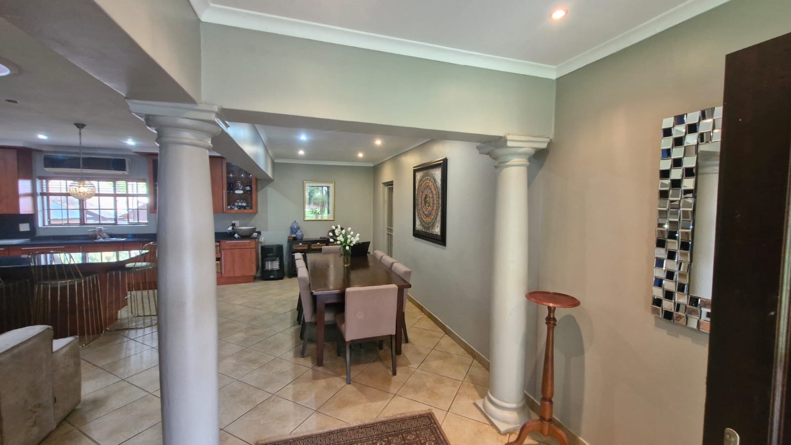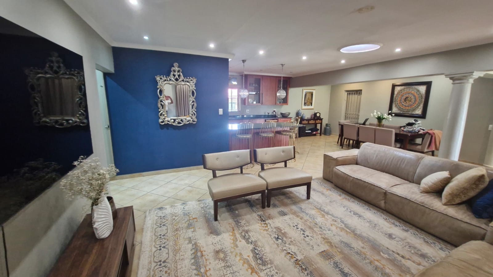 This inviting residential property in Valhalla, Centurion, offers a thoughtfully designed open-plan layout, seamlessly connecting the living, dining, and kitchen areas. The modern kitchen is a highlight, featuring extensive wooden cabinetry, sleek dark granite countertops, and a large breakfast bar with stylish pendant lighting, provides ample storage and a functional space for culinary pursuits, complemented by a dedicated pantry. Tiled flooring extends throughout these communal spaces, enhanced by abundant recessed lighting and natural light, creating a bright and welcoming atmosphere. A separate family TV room and a dedicated study provide additional versatile spaces.