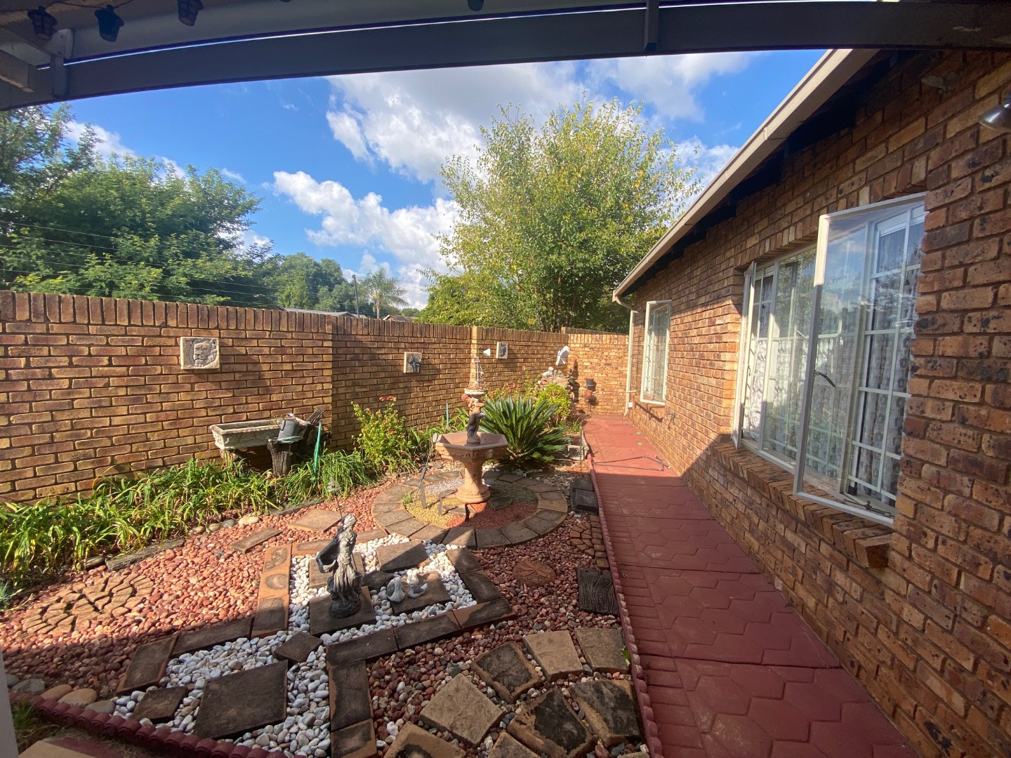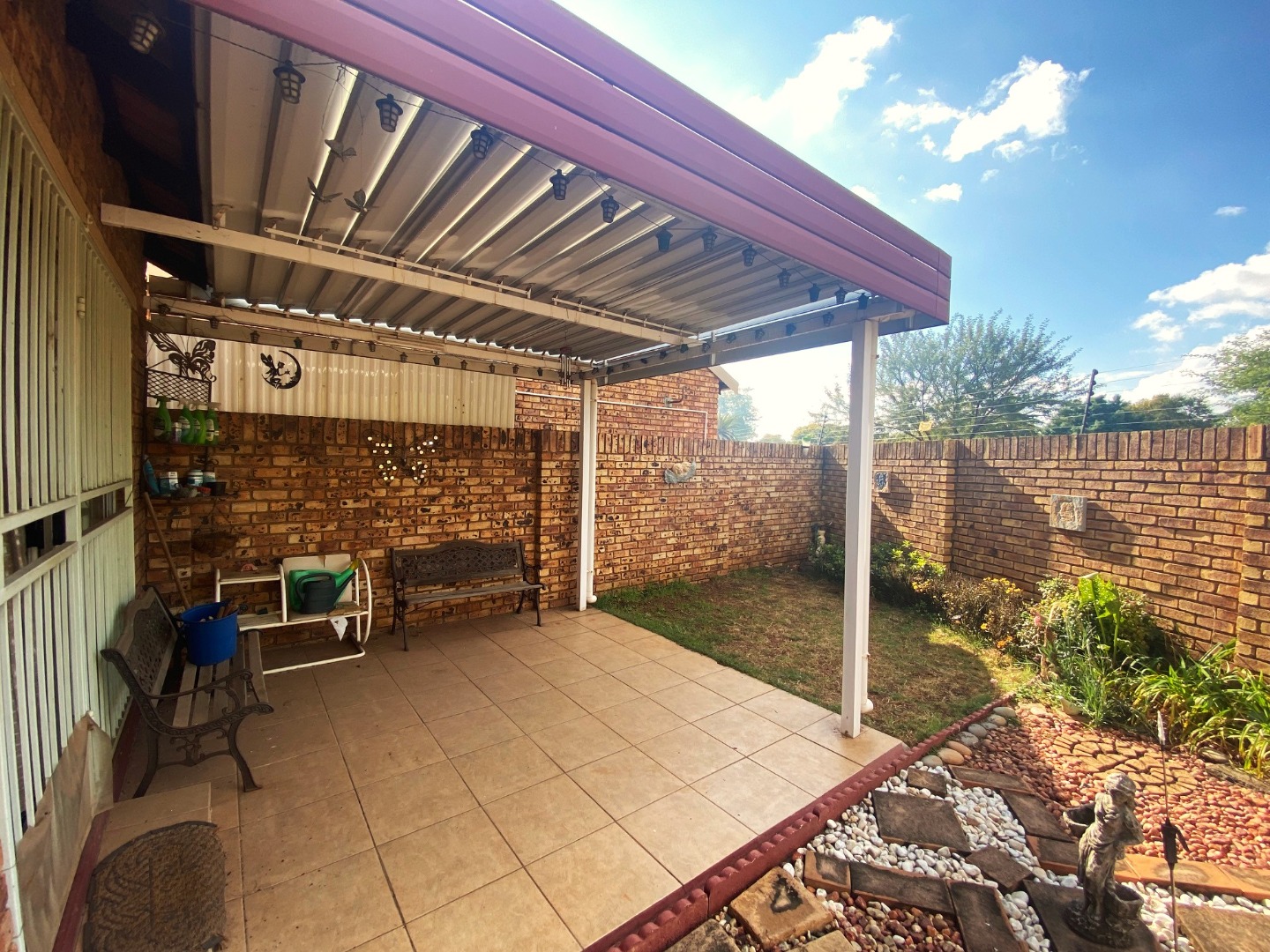 Covered patio with a tranquil Zen-style garden, ideal for outdoor dining or relaxation