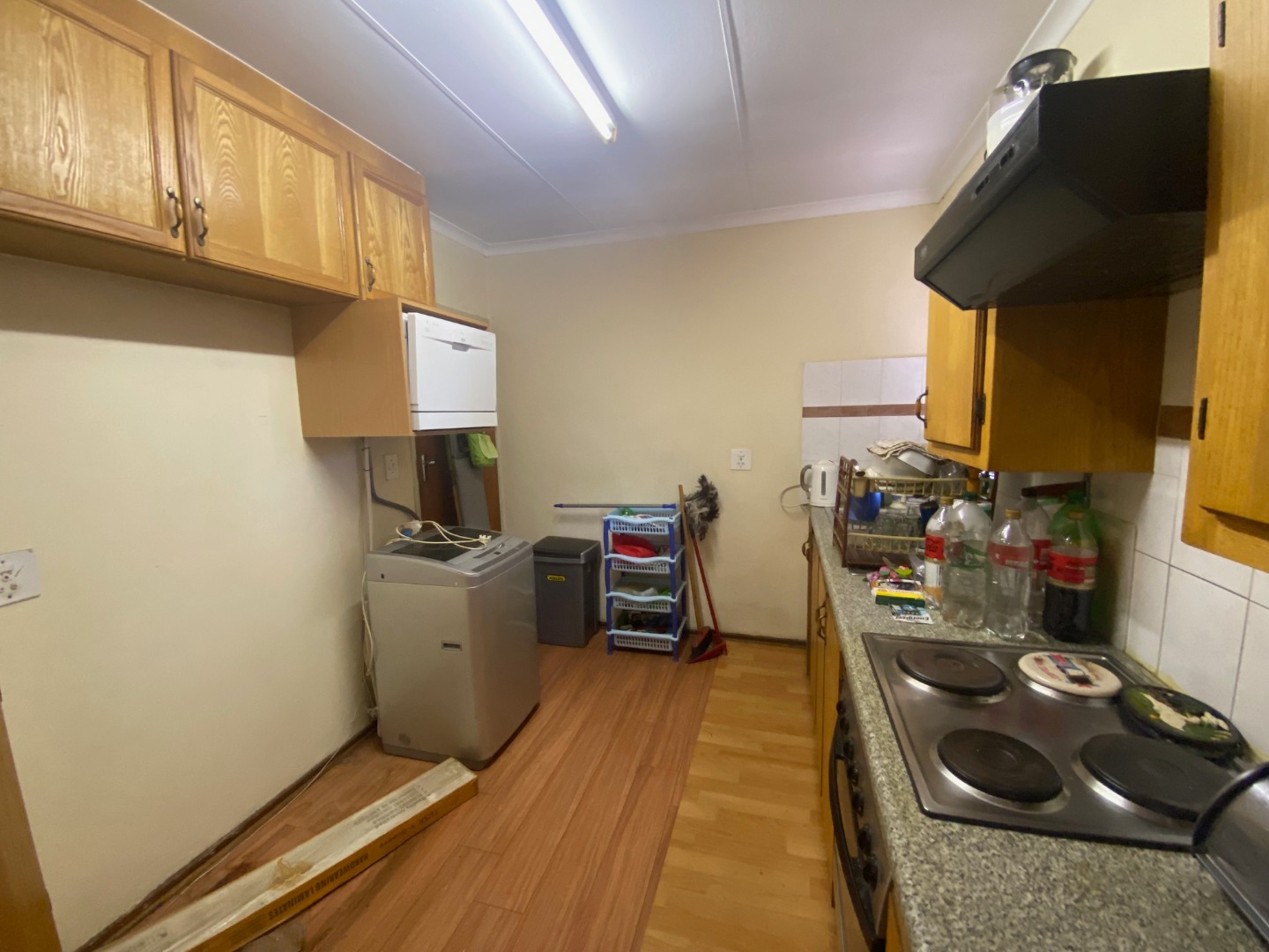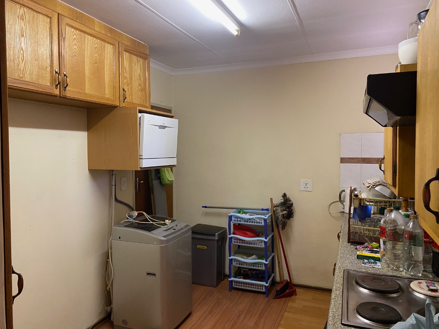 Modern kitchen with ample cupboard space, pantry, and ample room for a double-door fridge and washing machine