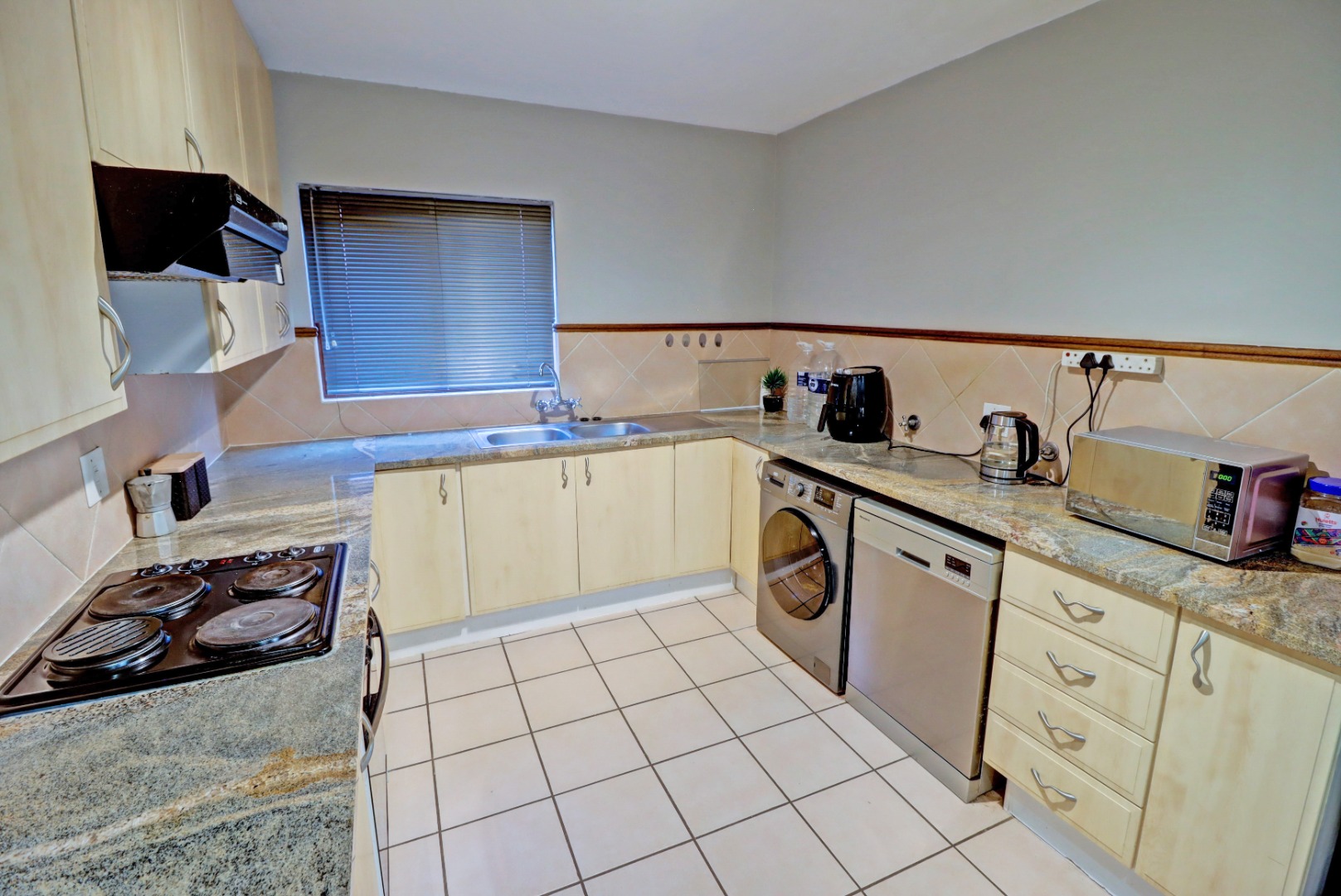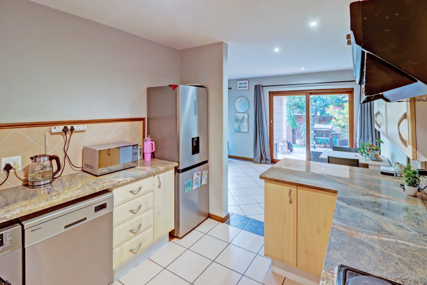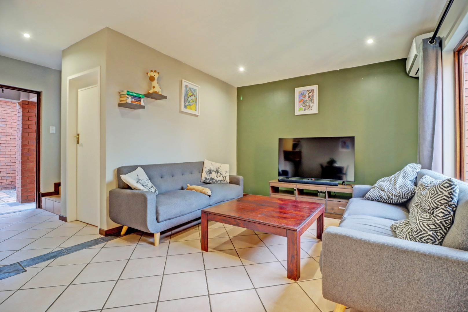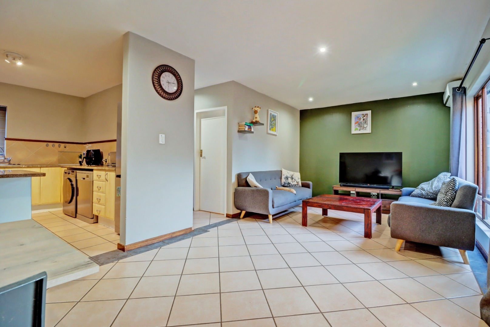 Step inside to an open-plan living and kitchen area, designed for seamless flow and interaction. The living space boasts neutral tiled flooring, an accent wall, and recessed lighting, creating a welcoming ambiance. An air conditioning unit ensures comfort year-round. The kitchen is equipped with light-coloured cabinetry and granite countertops.