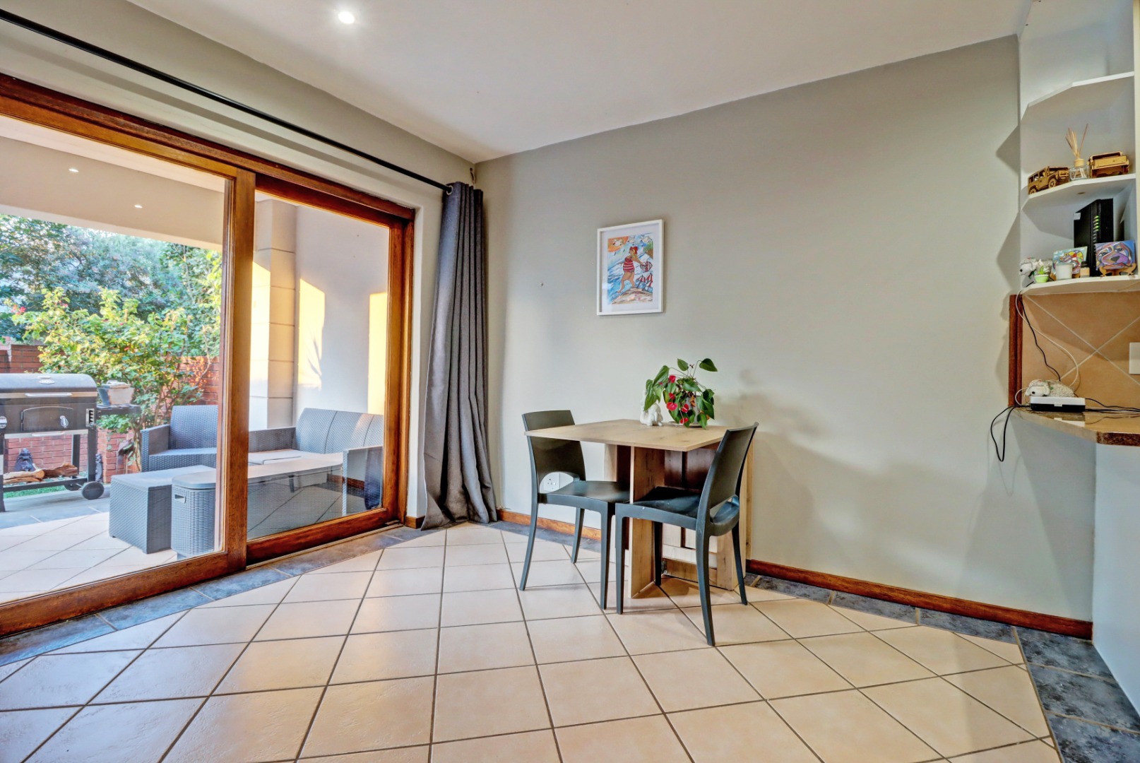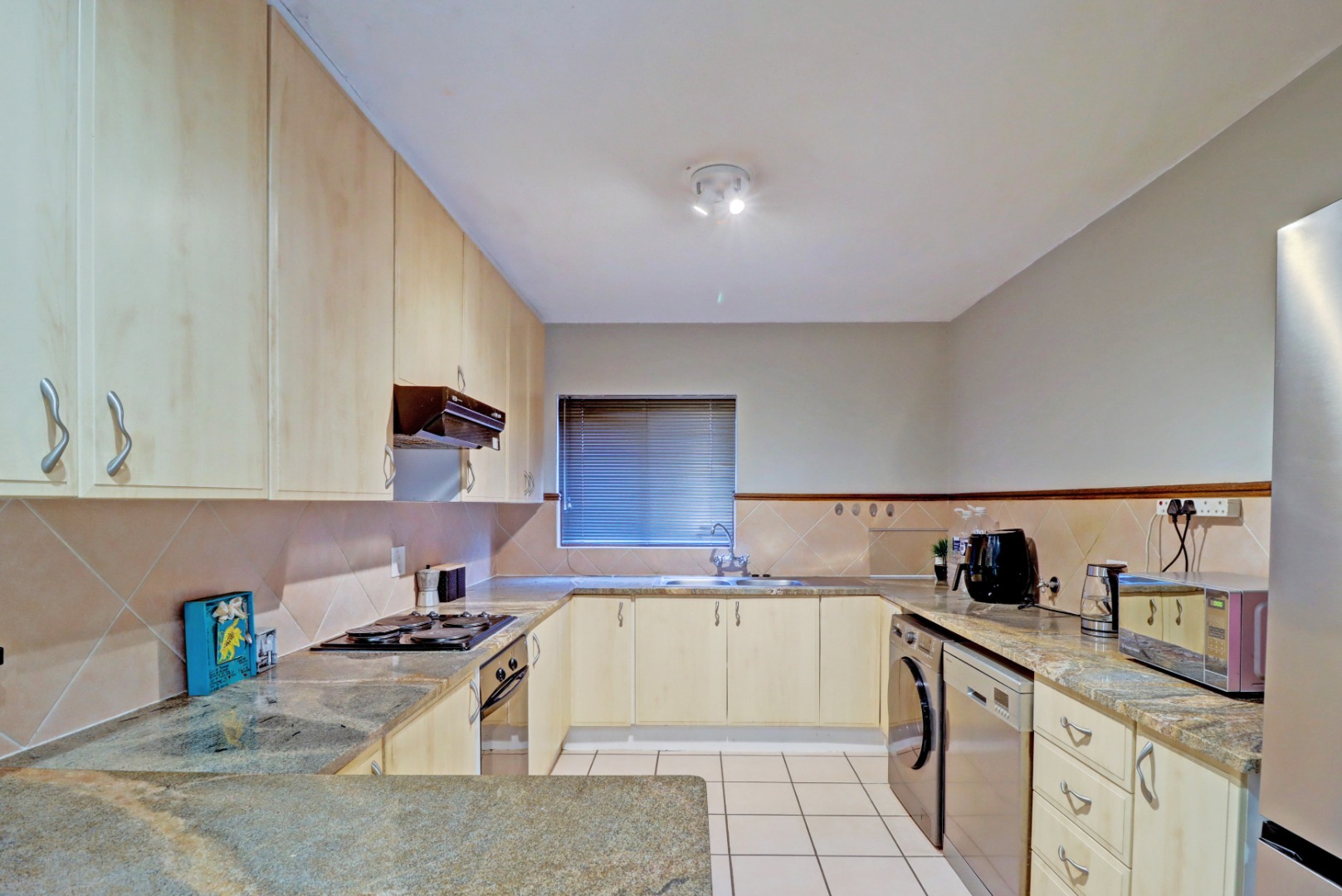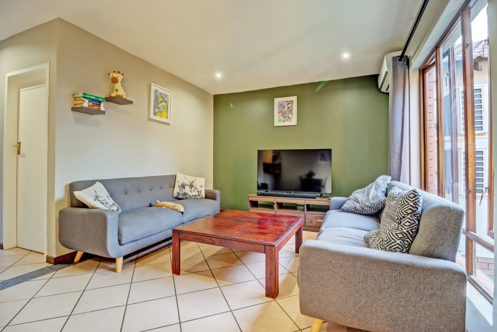 Step inside to an open-plan living and kitchen area, designed for seamless flow and interaction. The living space boasts neutral tiled flooring, an accent wall, and recessed lighting, creating a welcoming ambiance. An air conditioning unit ensures comfort year-round. The kitchen is equipped with light-coloured cabinetry and granite countertops.