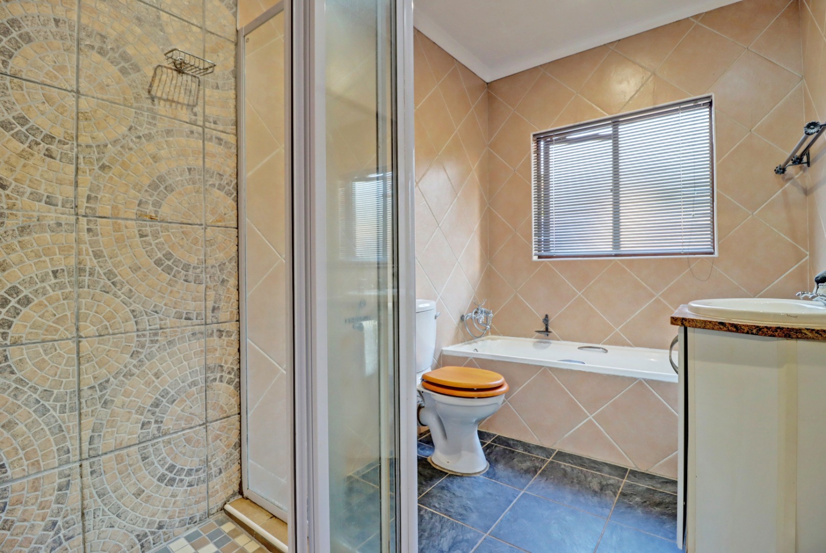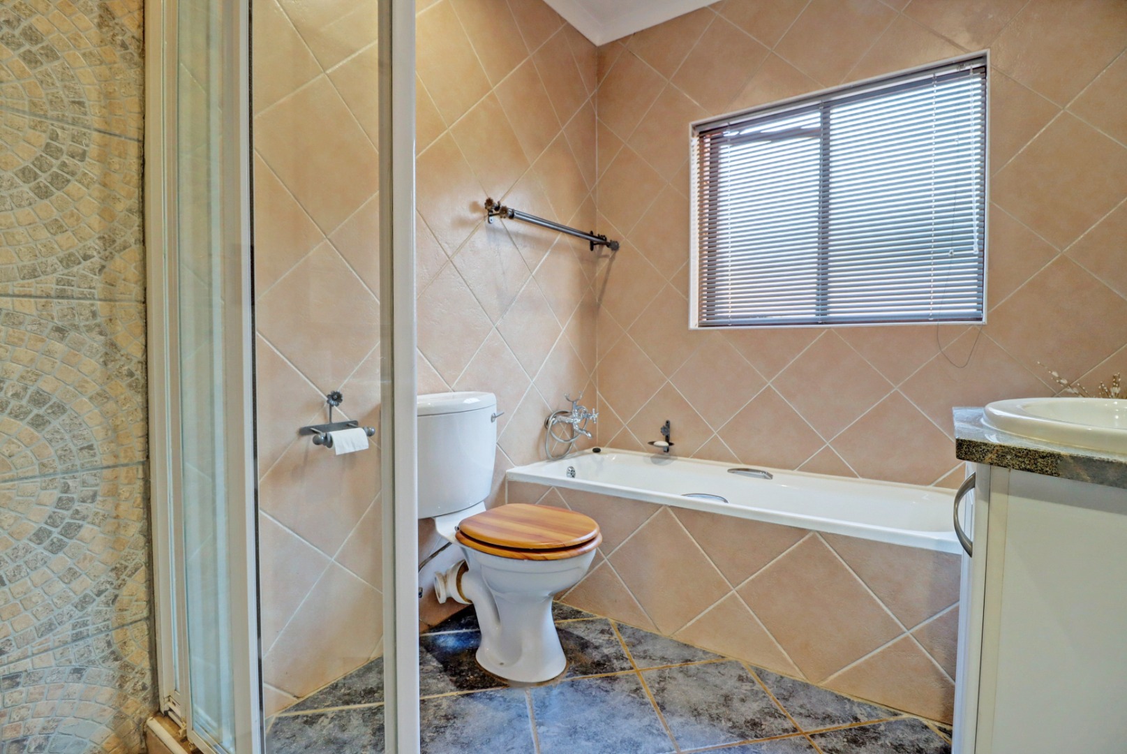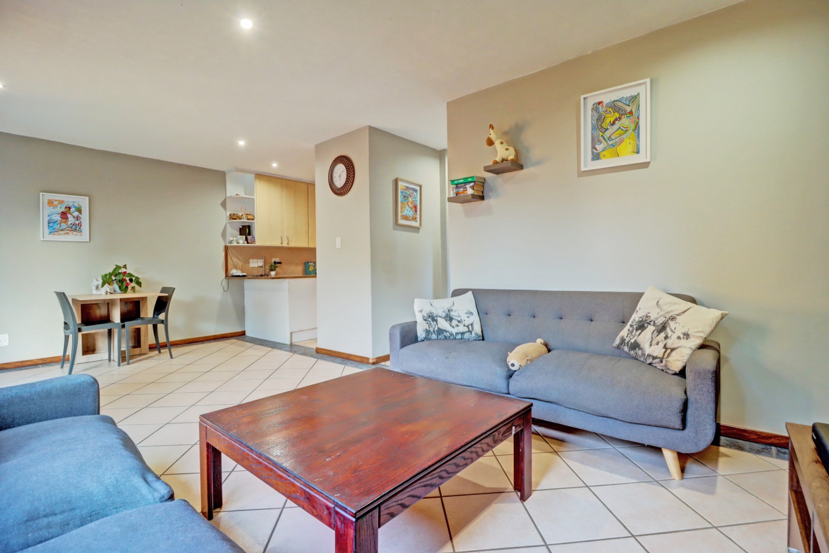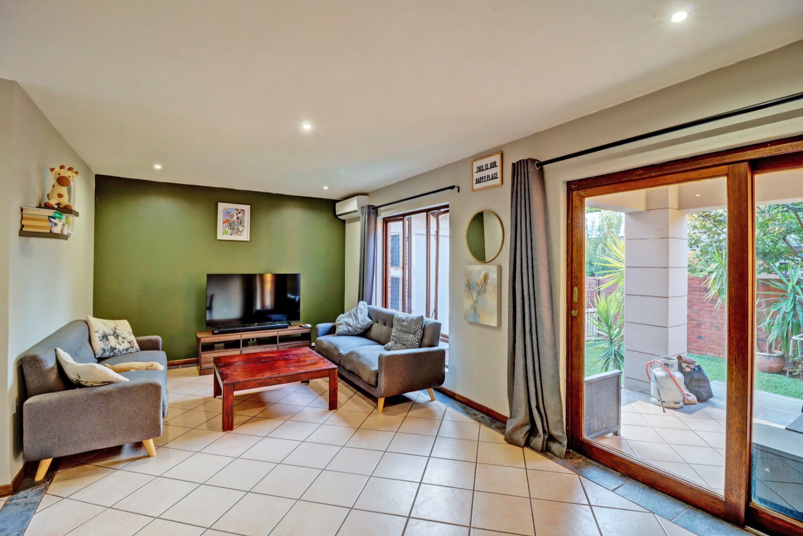 Step inside to an open-plan living and kitchen area, designed for seamless flow and interaction. The living space boasts neutral tiled flooring, an accent wall, and recessed lighting, creating a welcoming ambiance. An air conditioning unit ensures comfort year-round. The kitchen is equipped with light-coloured cabinetry and granite countertops.