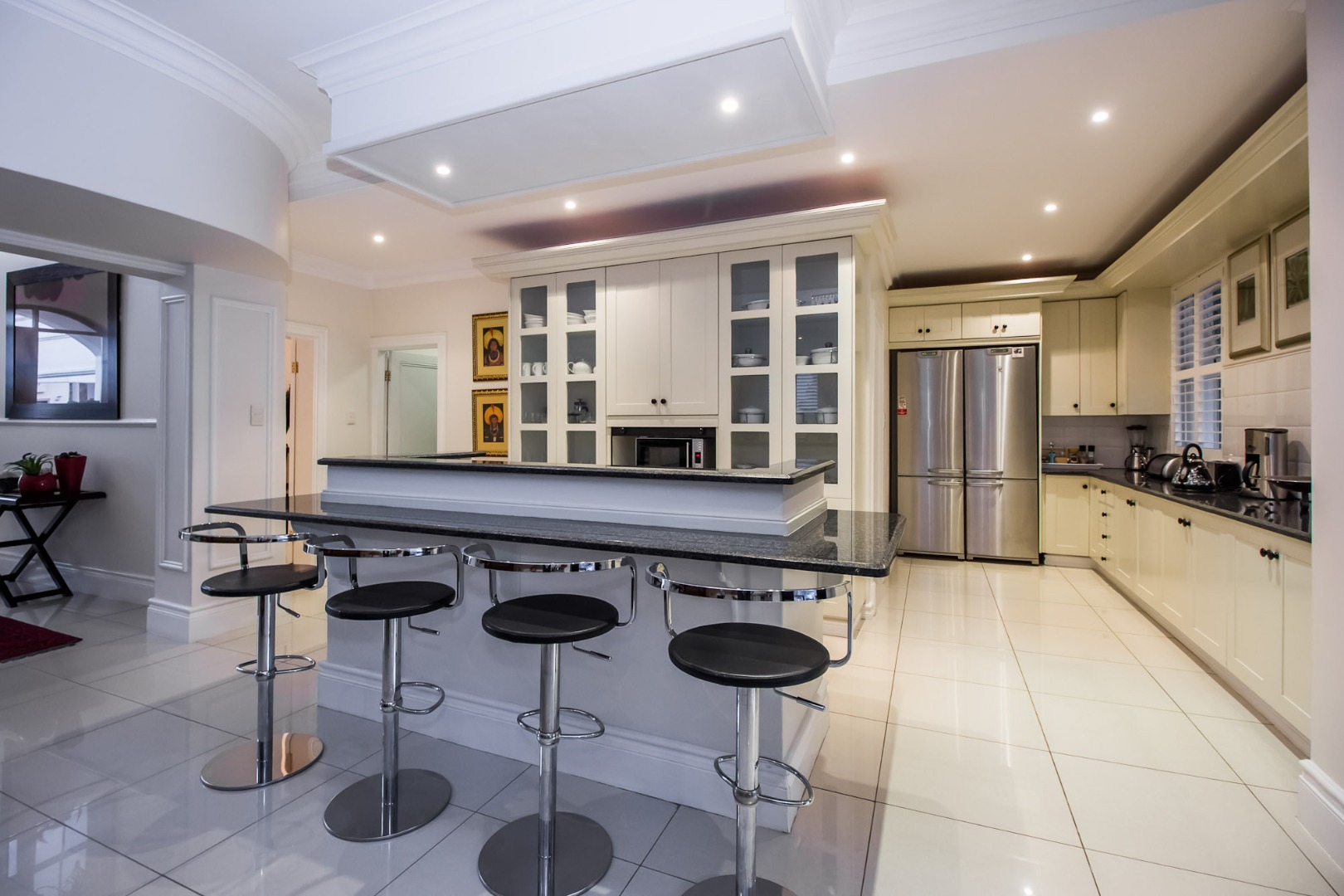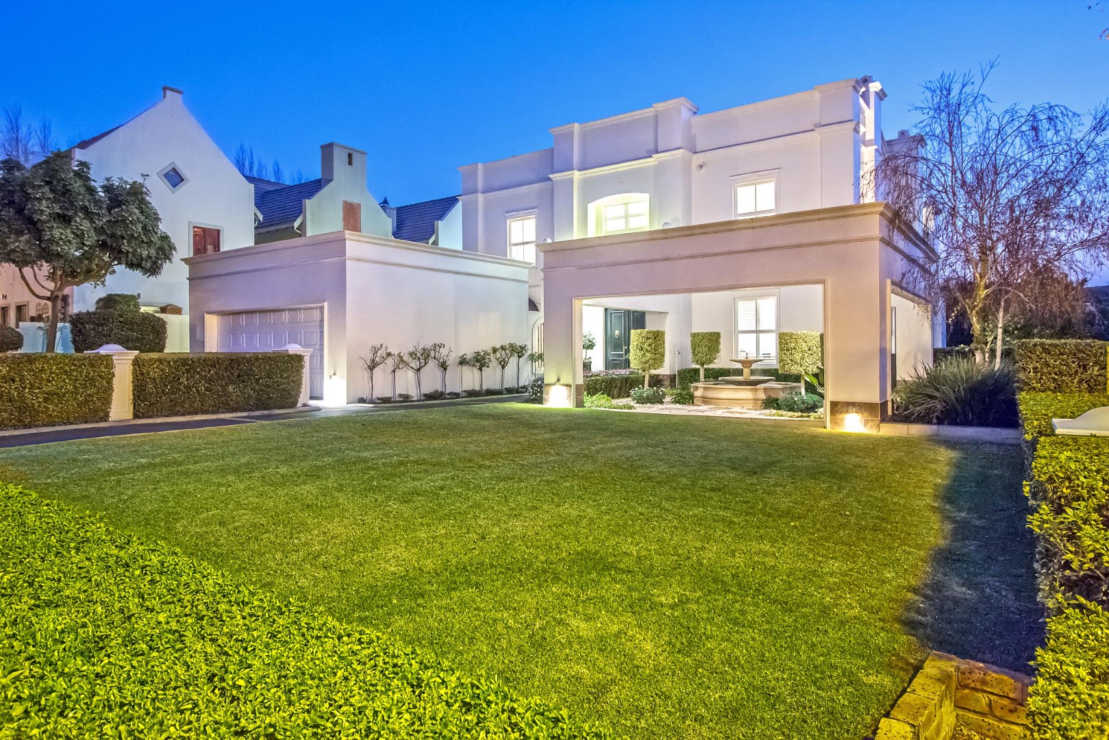 Nestled within the prestigious Boardwalk Meander security estate in Pretoria, this magnificent 425 sqm residence on an 800 sqm erf epitomises sophisticated living. From its classical architectural facade, adorned with prominent columns and elegant exterior lighting, to the meticulously manicured lawns and hedges, the property exudes an undeniable kerb appeal. A grand portico welcomes you, hinting at the luxurious interiors within, while a charming courtyard fountain adds a touch of serene elegance to the entrance.