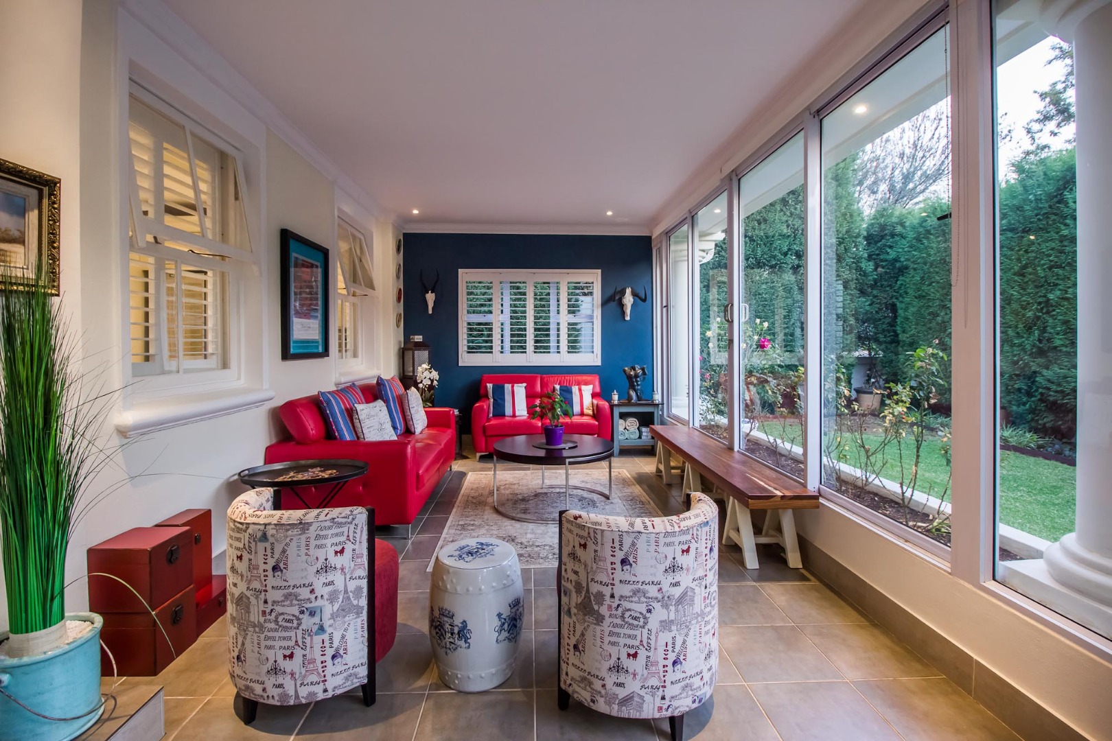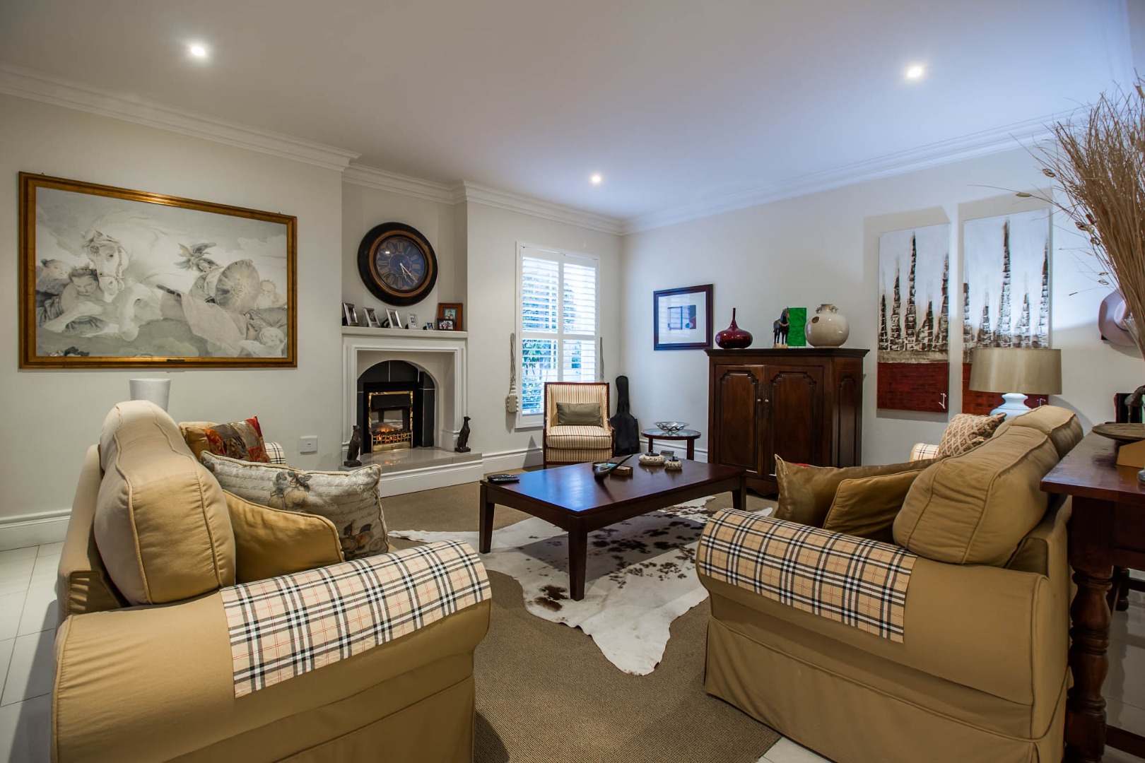 Step inside to a breathtaking entrance hall, boasting soaring ceilings and polished tiled floors that lead to an elegant staircase. The home offers two distinct lounges and a formal dining room, each designed for both grand entertaining and intimate gatherings. The main living area features a cozy fireplace, abundant natural light filtered through stylish plantation shutters, and exquisite architectural details like crown molding and wainscoting. An additional vibrant sunroom, with expansive sliding doors, seamlessly connects the indoors to the lush garden, offering picturesque scenic views and an ideal space for relaxation.The heart of this home is its spacious, open-plan kitchen, a culinary haven featuring a large central island with bar seating, extensive cream cabinetry, and sleek granite countertops. Equipped with a pantry, it is perfectly appointed for gourmet creations. The residence comprises three generously proportioned bedrooms and three luxurious bathrooms, including a private en-suite, ensuring comfort and privacy for all occupants. A dedicated study provides an ideal environment for work or contemplation, while a guest toilet and outside toilets add convenience.