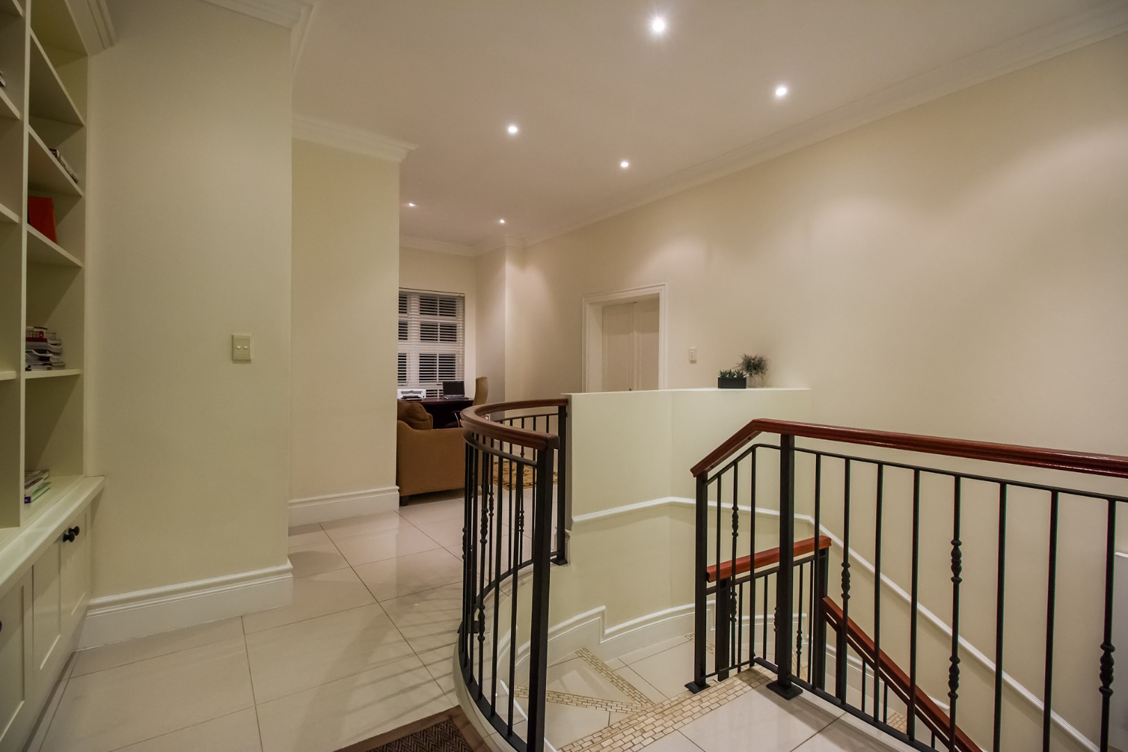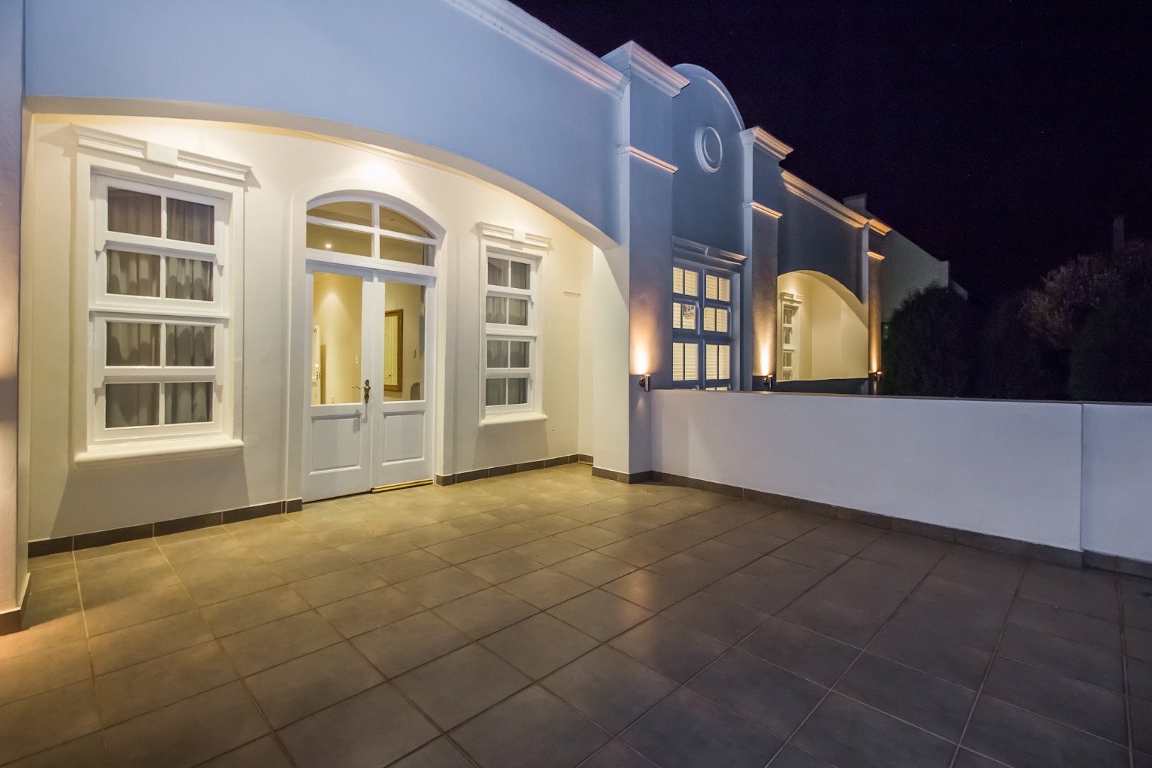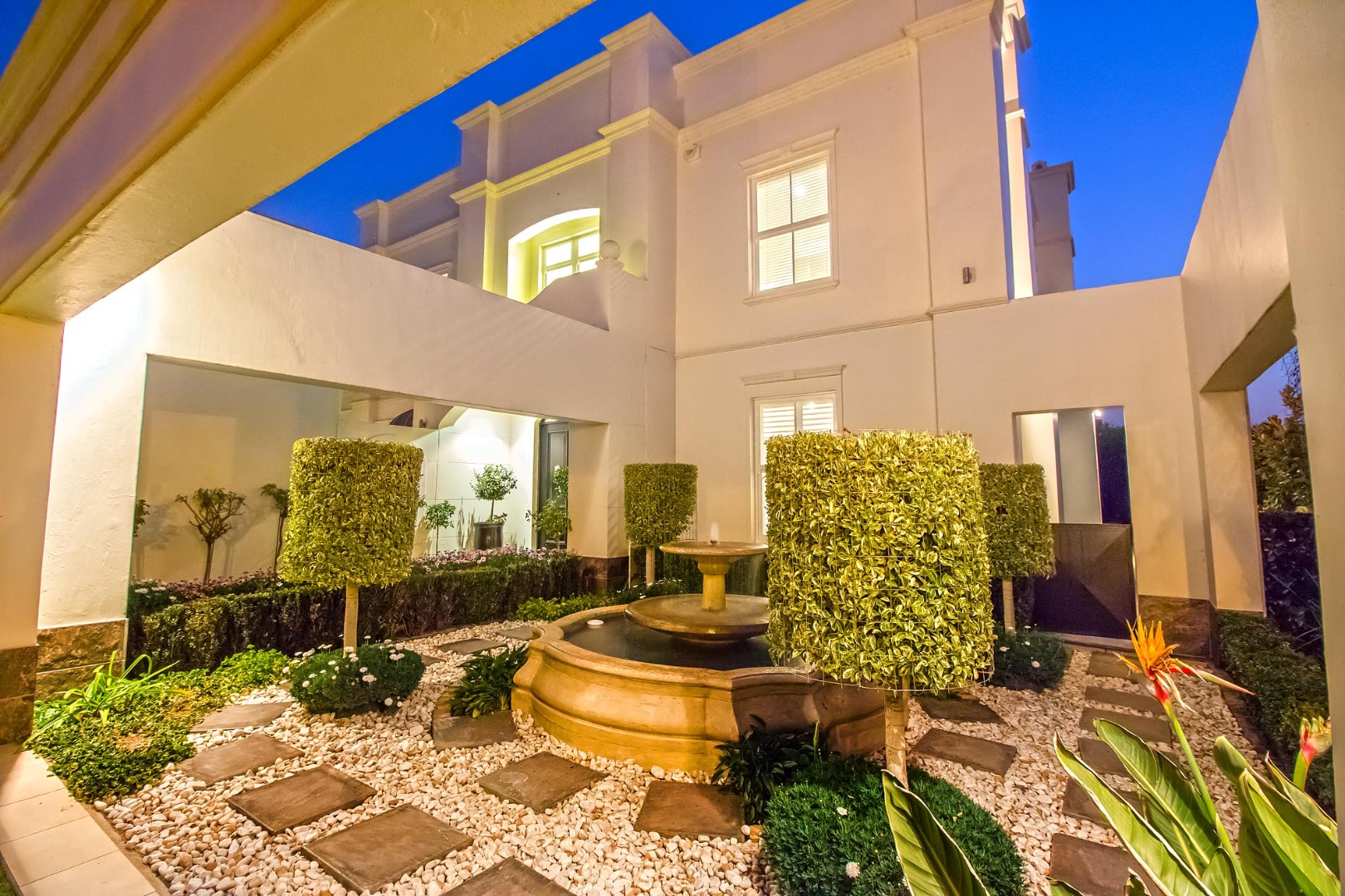 Nestled within the prestigious Boardwalk Meander security estate in Pretoria, this magnificent 425 sqm residence on an 800 sqm erf epitomises sophisticated living. From its classical architectural facade, adorned with prominent columns and elegant exterior lighting, to the meticulously manicured lawns and hedges, the property exudes an undeniable kerb appeal. A grand portico welcomes you, hinting at the luxurious interiors within, while a charming courtyard fountain adds a touch of serene elegance to the entrance.