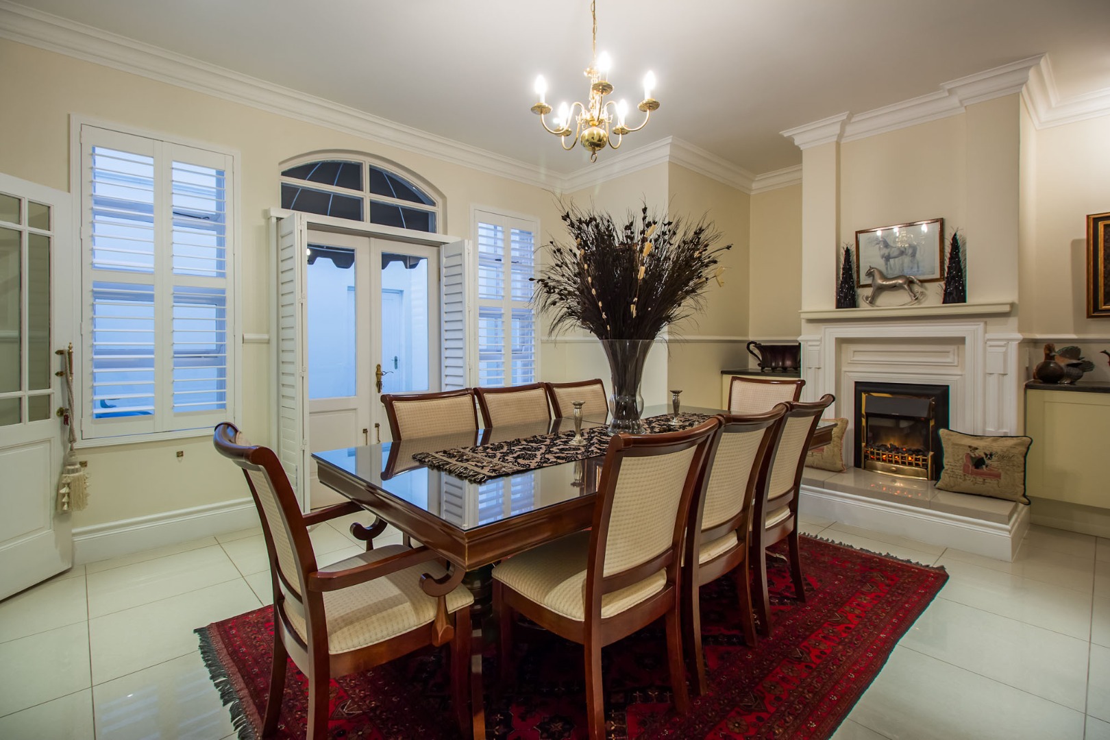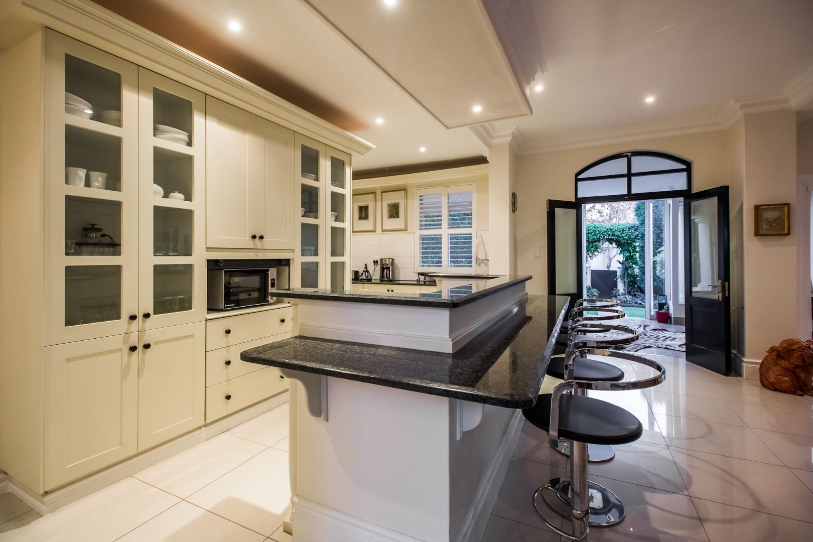 Step inside to a breathtaking entrance hall, boasting soaring ceilings and polished tiled floors that lead to an elegant staircase. The home offers two distinct lounges and a formal dining room, each designed for both grand entertaining and intimate gatherings. The main living area features a cozy fireplace, abundant natural light filtered through stylish plantation shutters, and exquisite architectural details like crown molding and wainscoting. An additional vibrant sunroom, with expansive sliding doors, seamlessly connects the indoors to the lush garden, offering picturesque scenic views and an ideal space for relaxation.The heart of this home is its spacious, open-plan kitchen, a culinary haven featuring a large central island with bar seating, extensive cream cabinetry, and sleek granite countertops. Equipped with a pantry, it is perfectly appointed for gourmet creations. The residence comprises three generously proportioned bedrooms and three luxurious bathrooms, including a private en-suite, ensuring comfort and privacy for all occupants. A dedicated study provides an ideal environment for work or contemplation, while a guest toilet and outside toilets add convenience.