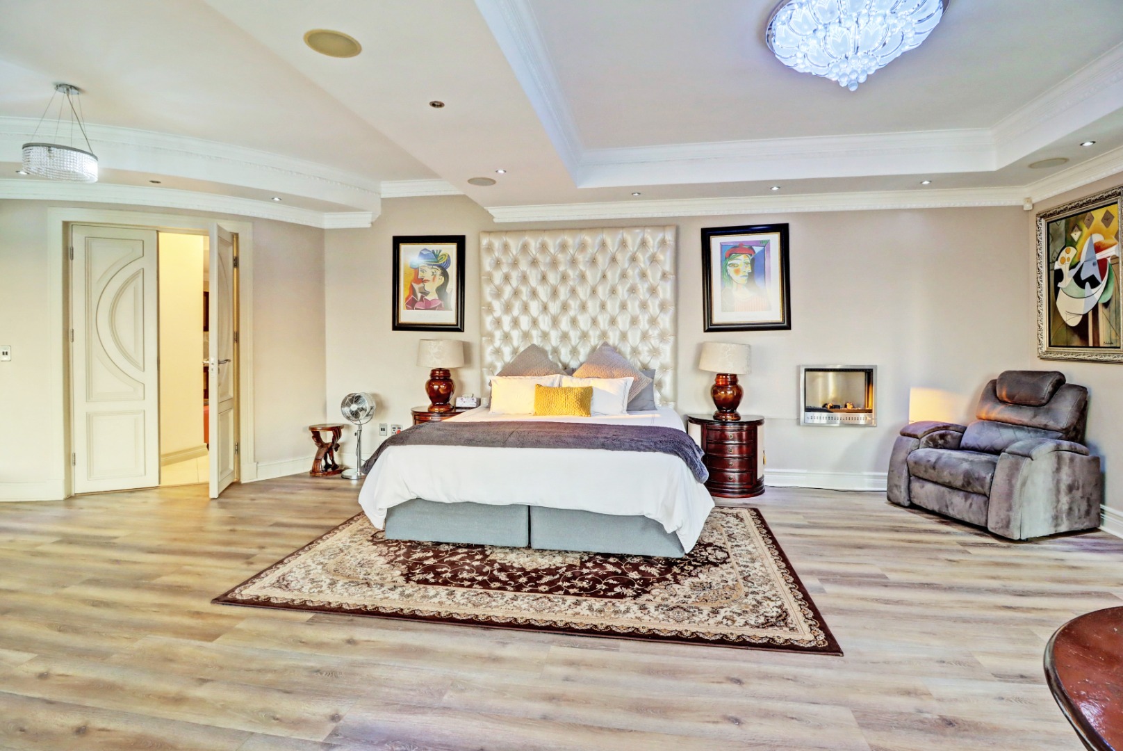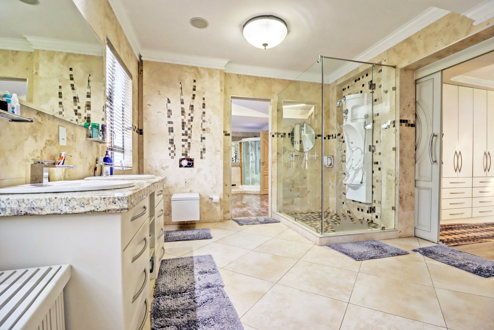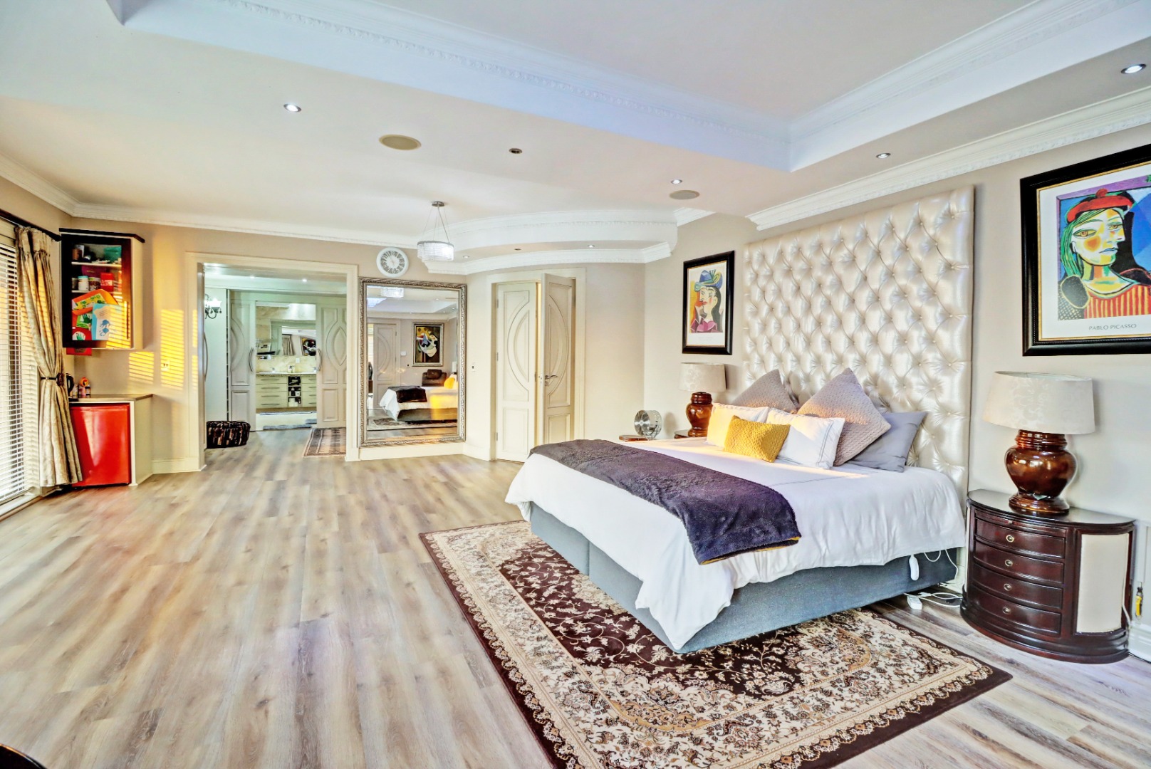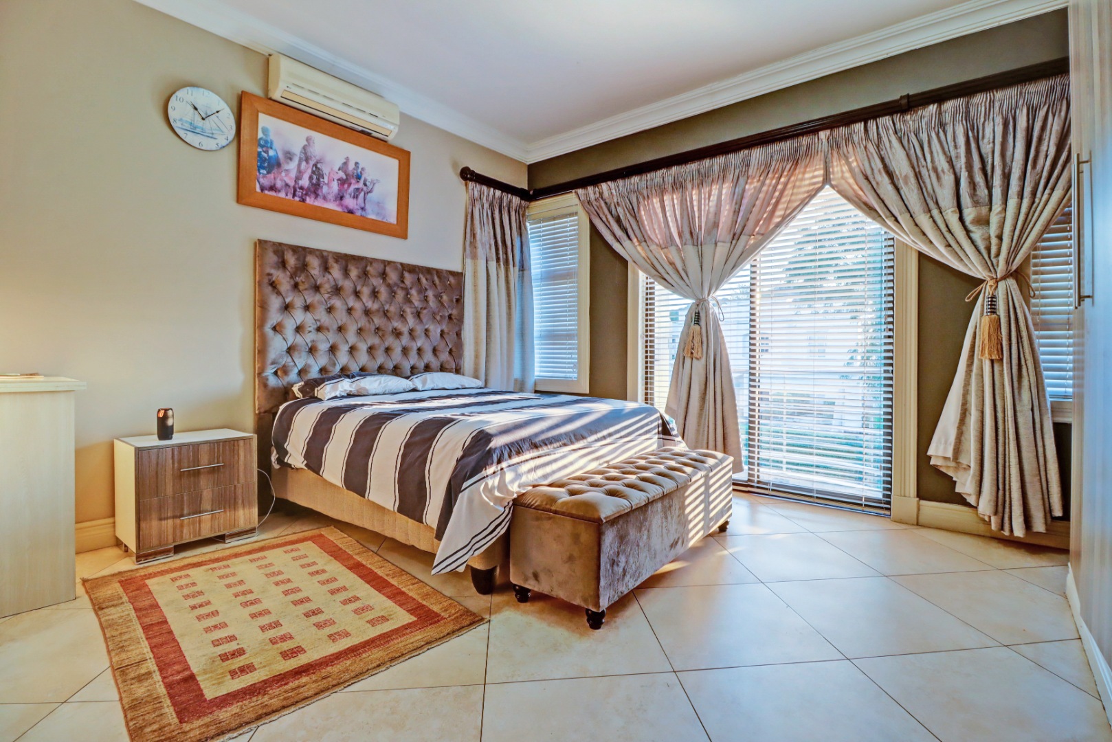 Eight opulent bedrooms, each accompanied by its own en-suite bathroom and a luxurious spa bath, ensure ultimate comfort and privacy for residents and guests alike. The property extends its allure outdoors with a pool, a meticulously landscaped garden with an irrigation system, and a built-in braai, ideal for alfresco entertaining. Four generous garages provide secure parking, complemented by staff quarters and outside toilets for convenience.