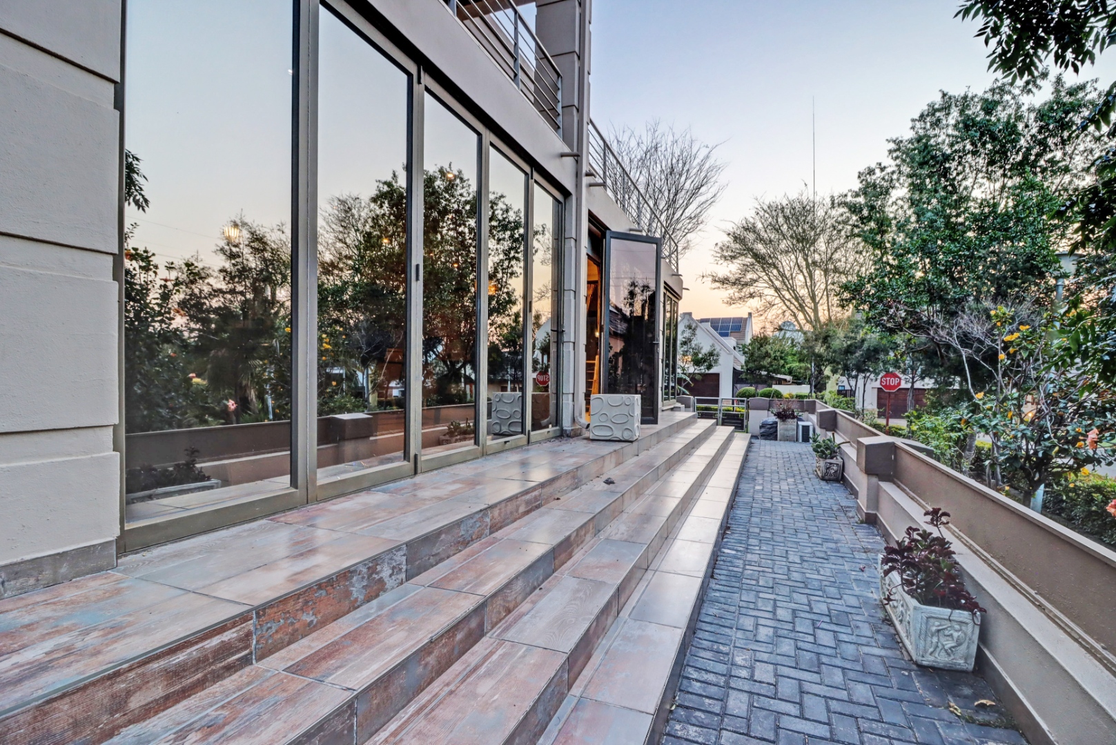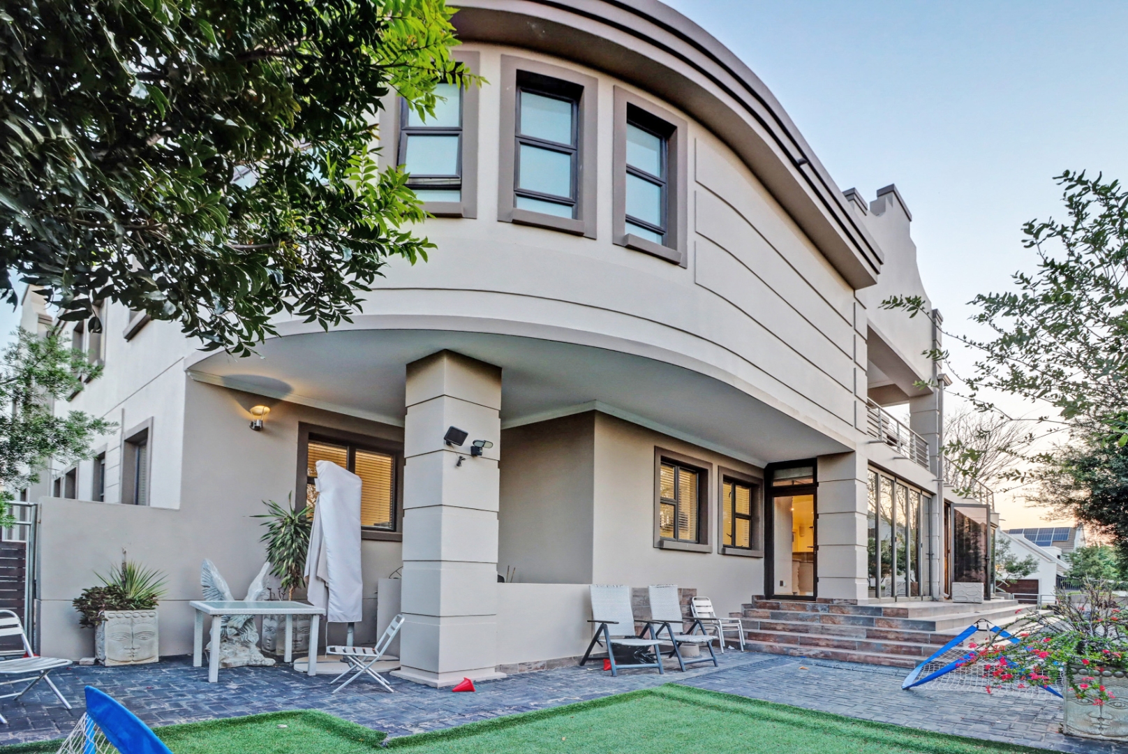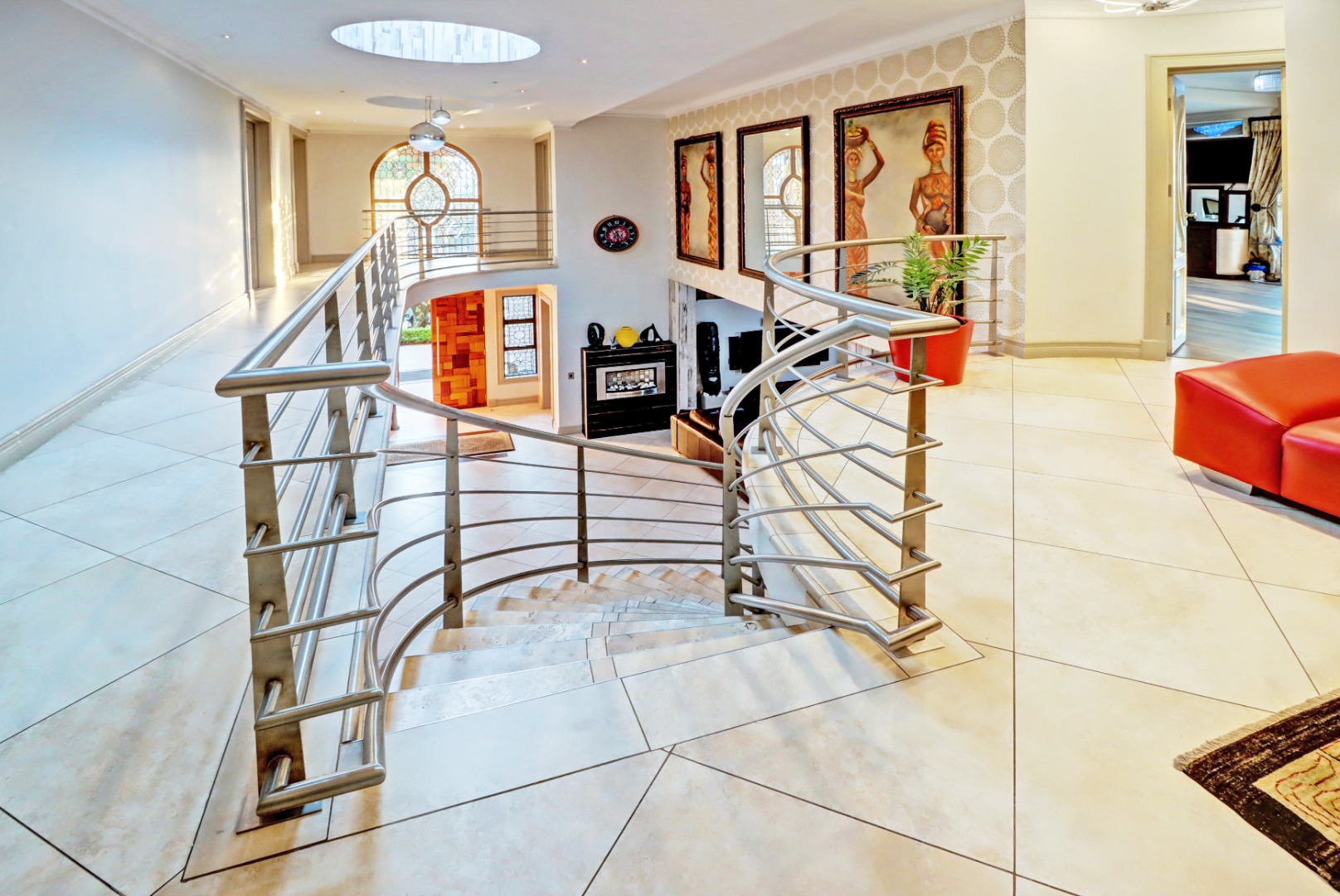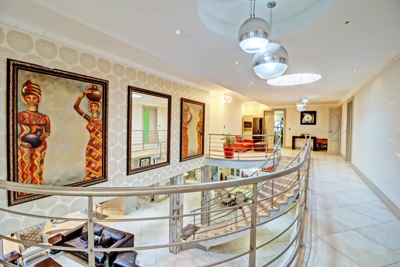 Discover an architectural marvel nestled within the prestigious Boardwalk Meander Estate in Pretoria, South Africa. This magnificent residence, spanning an impressive 800 sqm on an 826 sqm erf, presents a striking contemporary facade with elegant curved elements, expansive floor-to-ceiling windows, and multiple private balconies that invite natural light and offer serene outdoor retreats. The grand multi-level entrance immediately captivates with its modern spiral staircase, soaring ceilings, and abundant natural light from a skylight, setting a tone of sophisticated luxury.