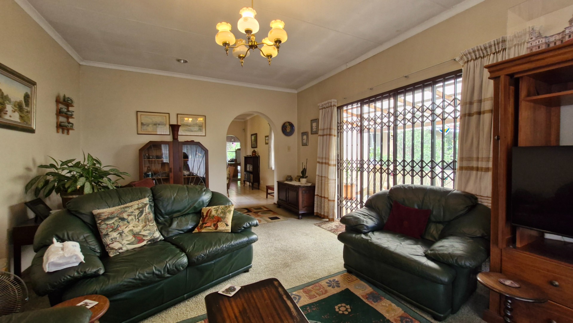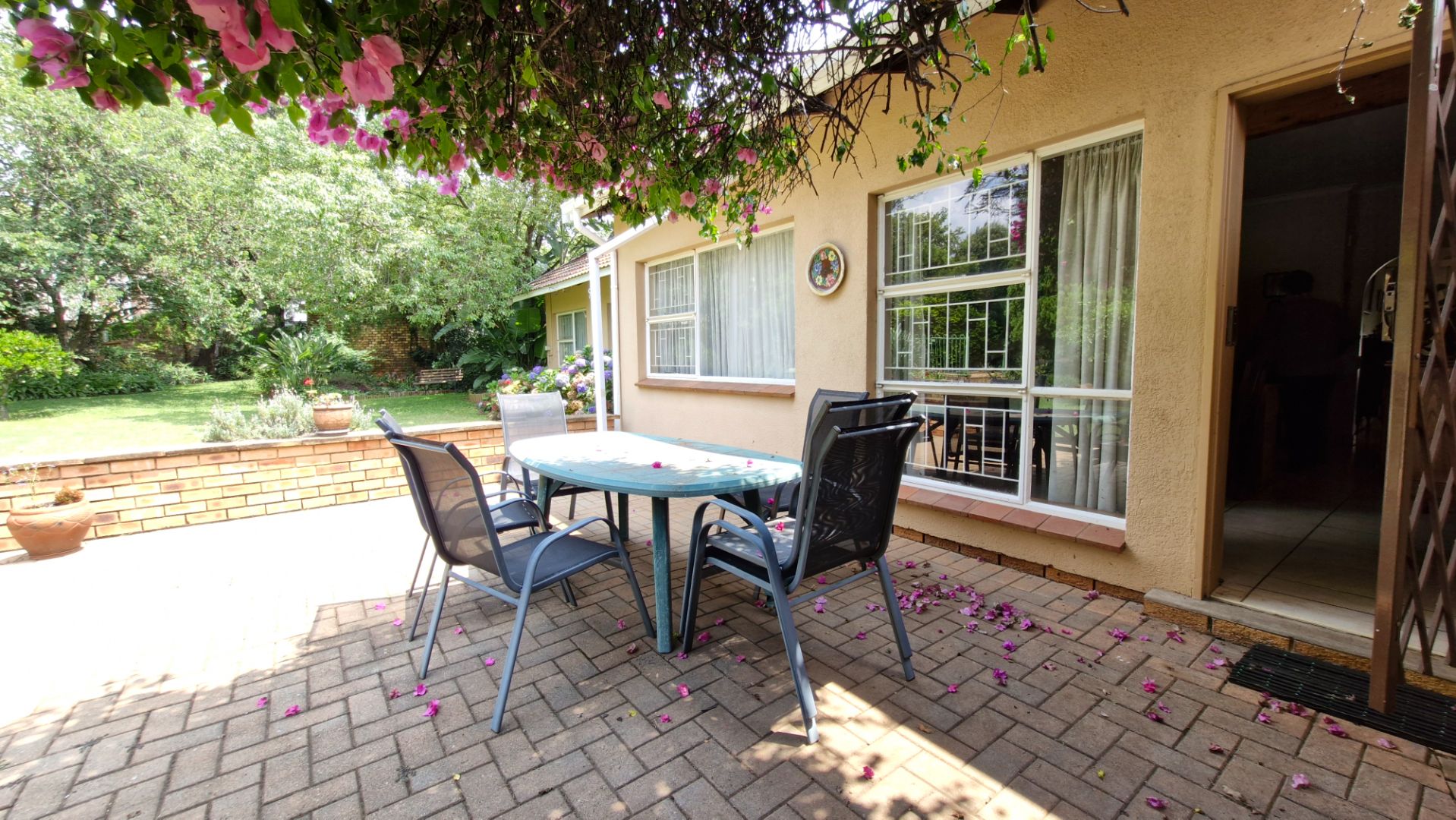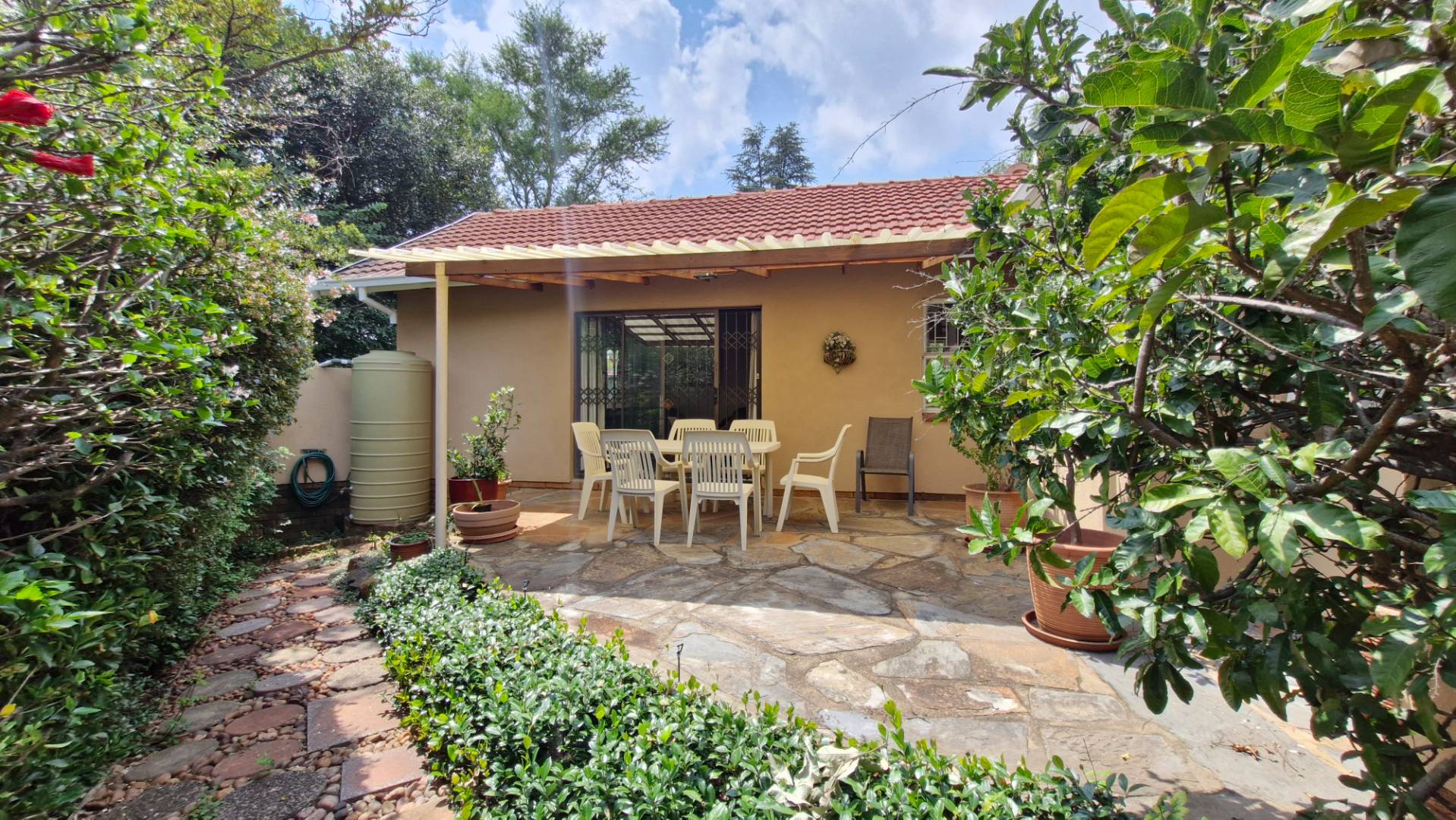 The generous 1189 sqm erf provides a private garden, a swimming pool, and two patios, perfect for outdoor entertaining. Practical amenities include a single garage, two additional covered parking spaces, staff quarters, a laundry, and outside toilet. Security is enhanced with burglar bars, an access gate, and a totally walled perimeter. The property is fibre-ready and includes water tanks for added sustainability. Pets are allowed.