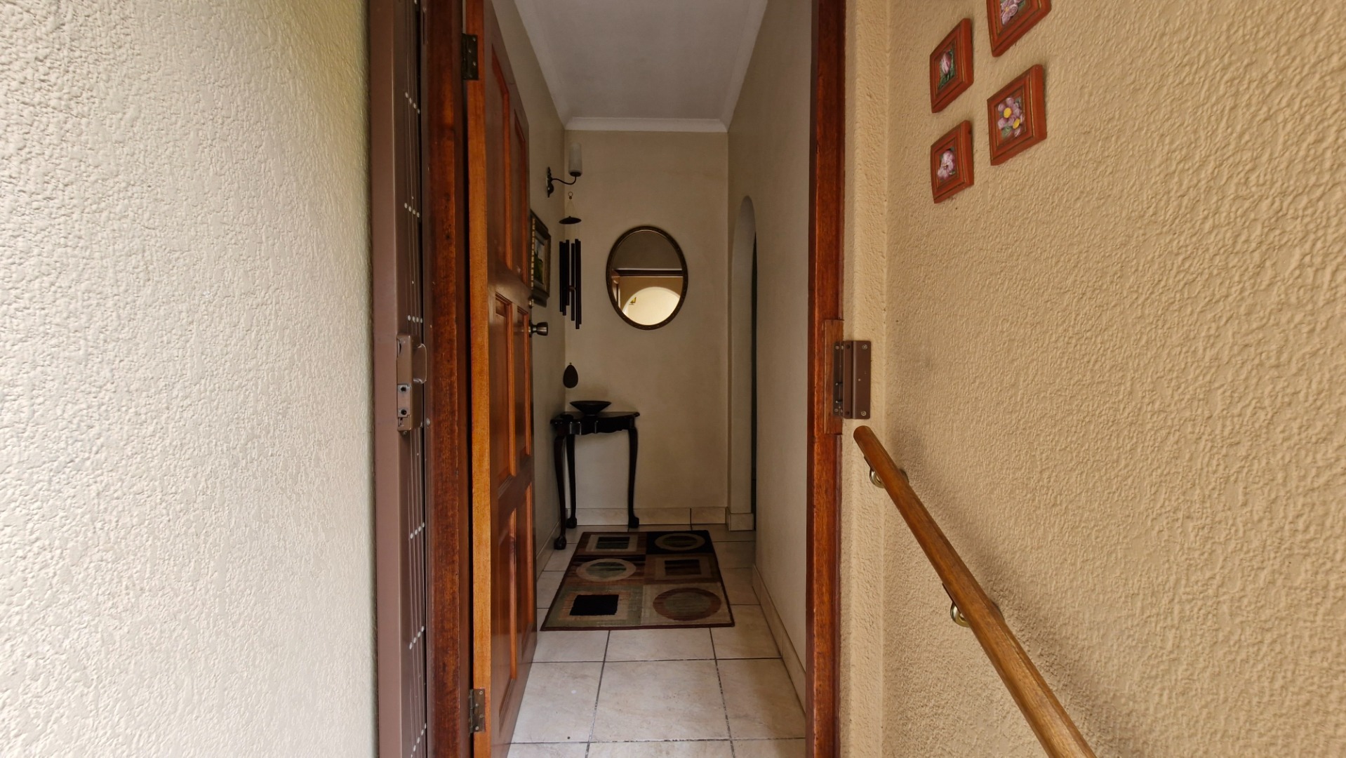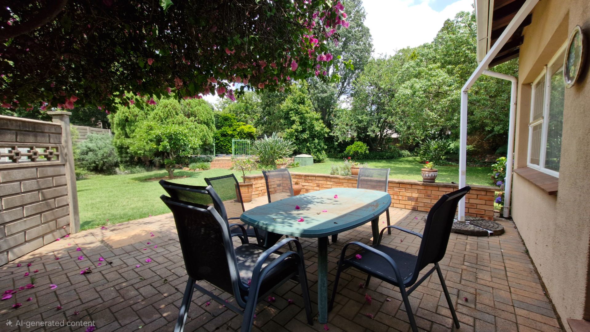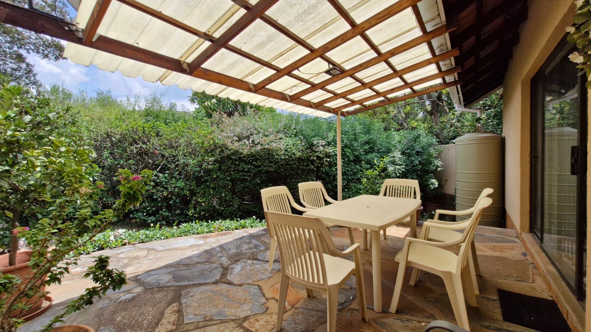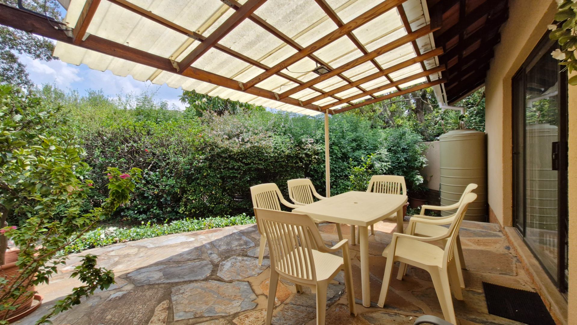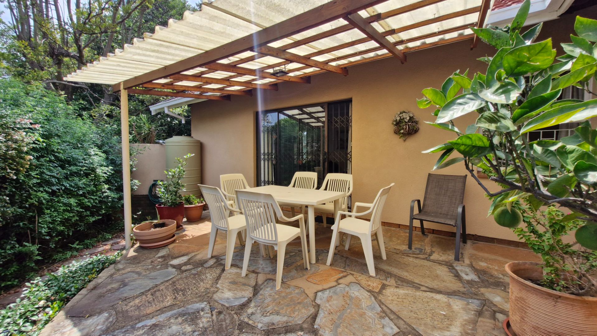 The generous 1189 sqm erf provides a private garden, a swimming pool, and two patios, perfect for outdoor entertaining. Practical amenities include a single garage, two additional covered parking spaces, staff quarters, a laundry, and outside toilet. Security is enhanced with burglar bars, an access gate, and a totally walled perimeter. The property is fibre-ready and includes water tanks for added sustainability. Pets are allowed.