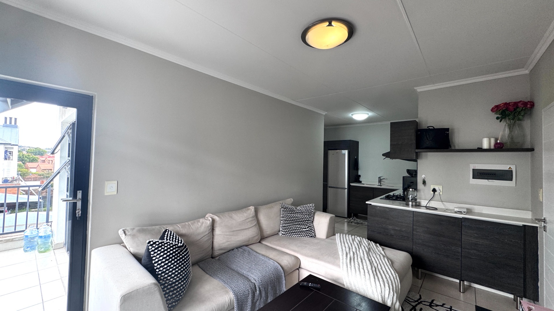 The living area flows seamlessly onto a private balcony with a built-in braai — perfect for relaxing or entertaining guests. The apartment offers one comfortable bedroom and a well-appointed bathroom fitted with a shower, toilet, and basin.