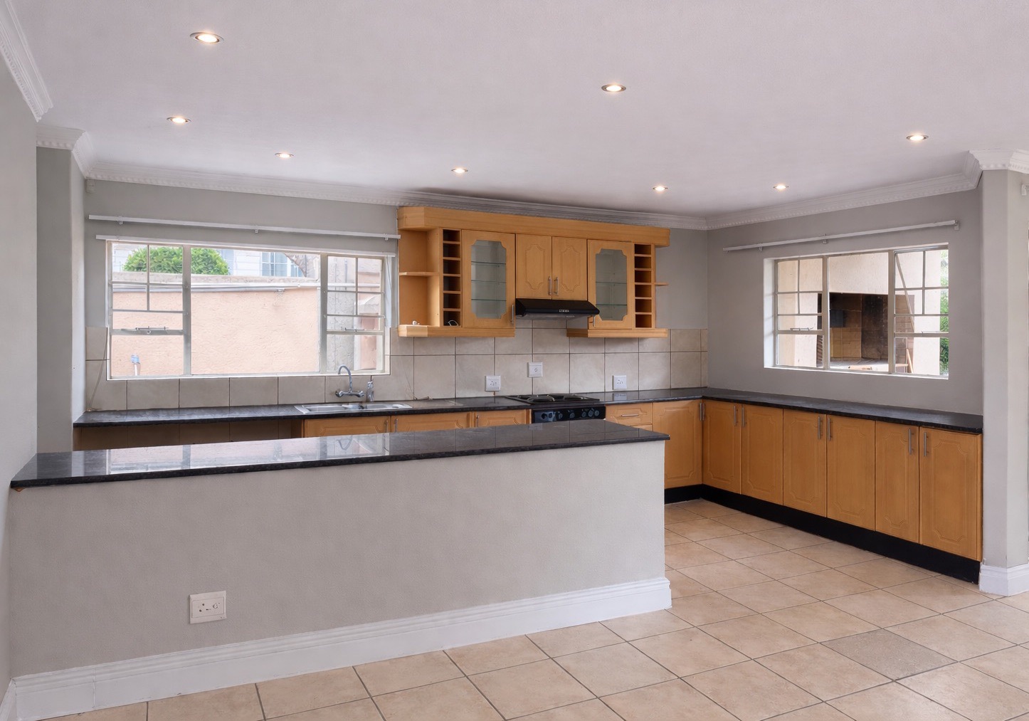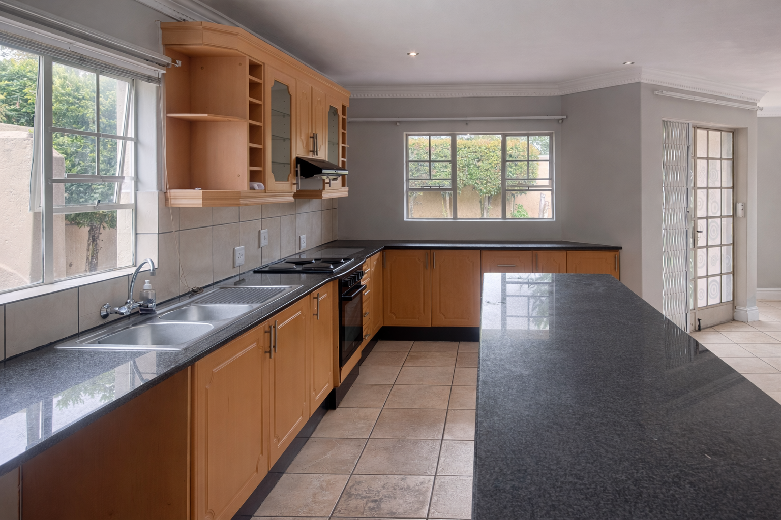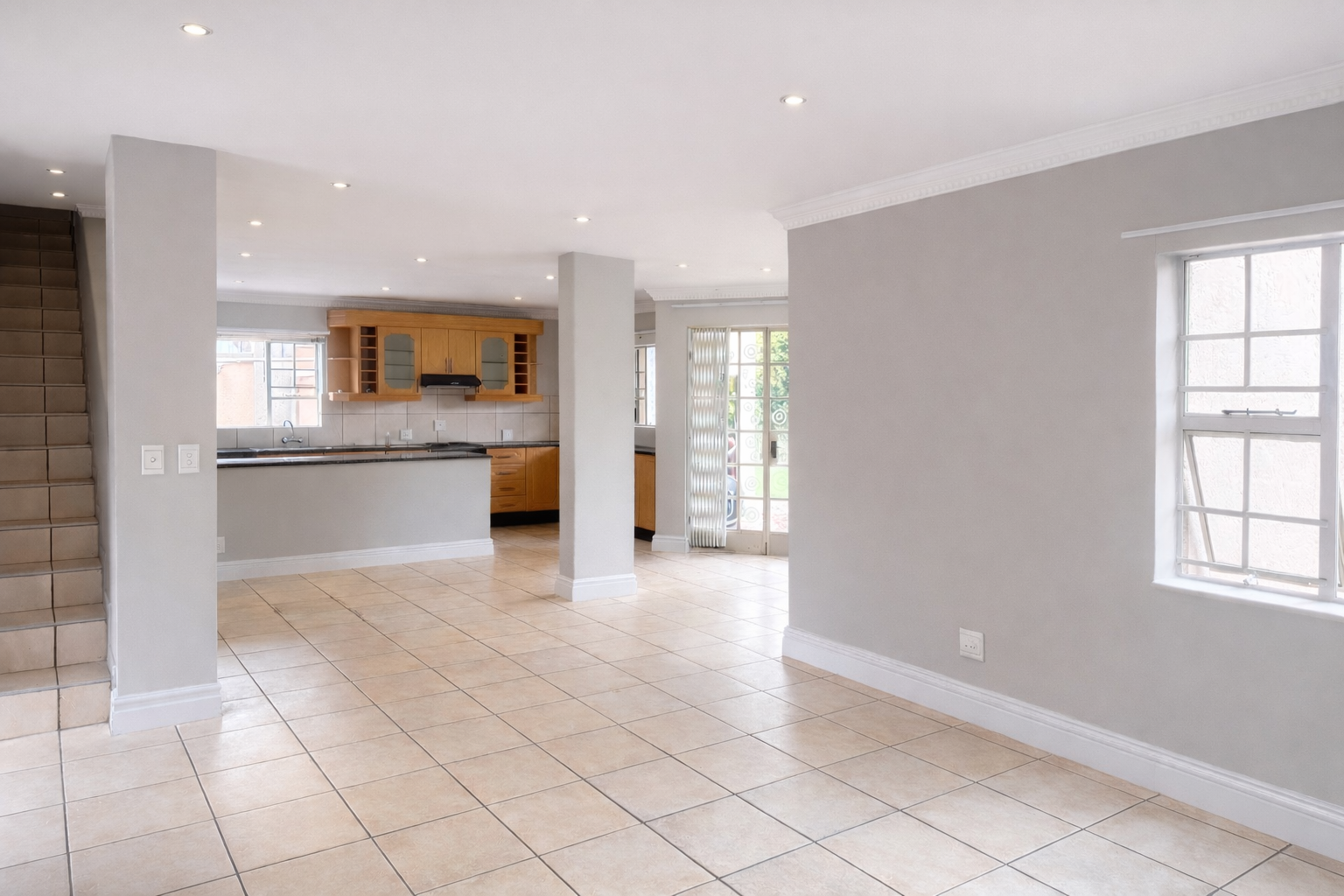 The home features a bright, open-plan layout that seamlessly combines the kitchen, living, and dining areas. The kitchen is well-appointed with ample cupboard space and under-counter capacity for two appliances.