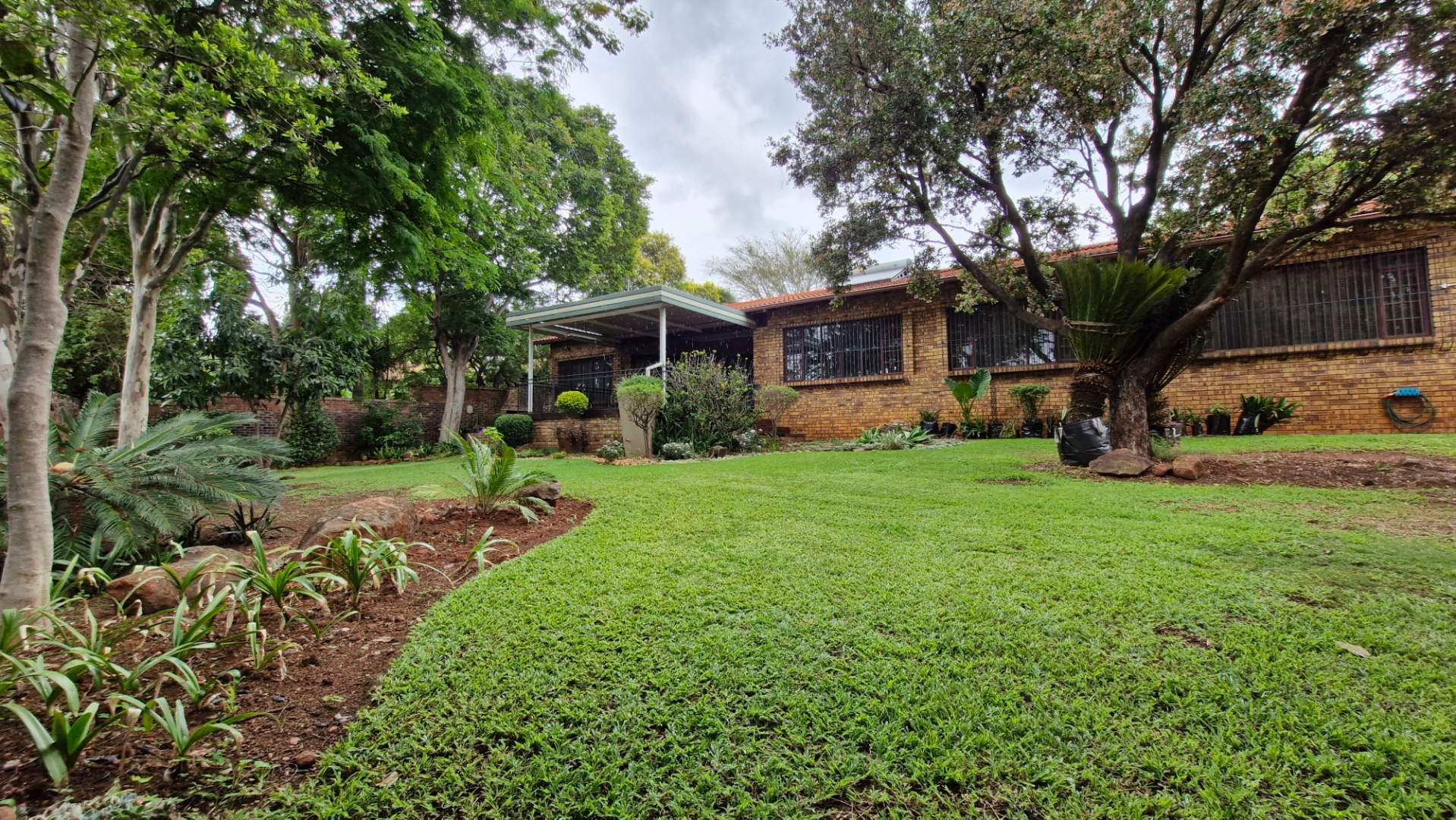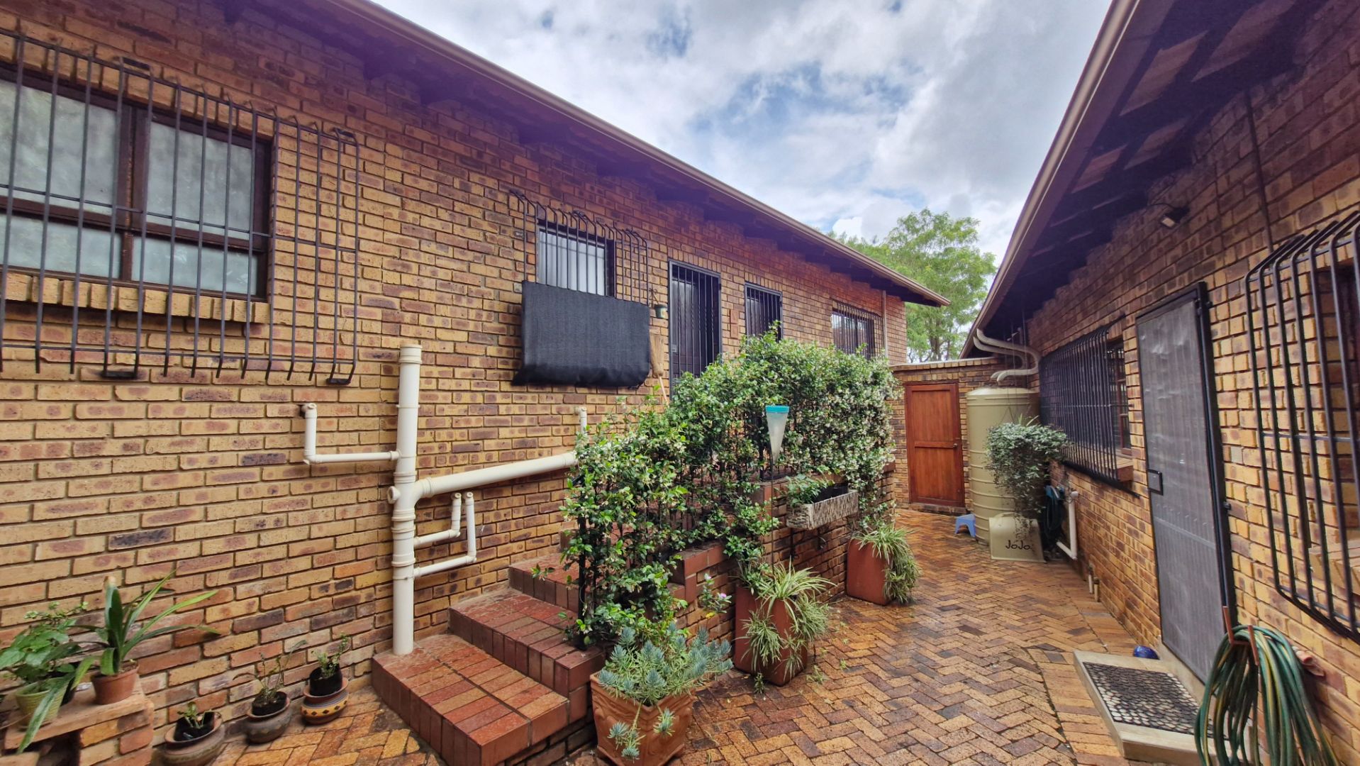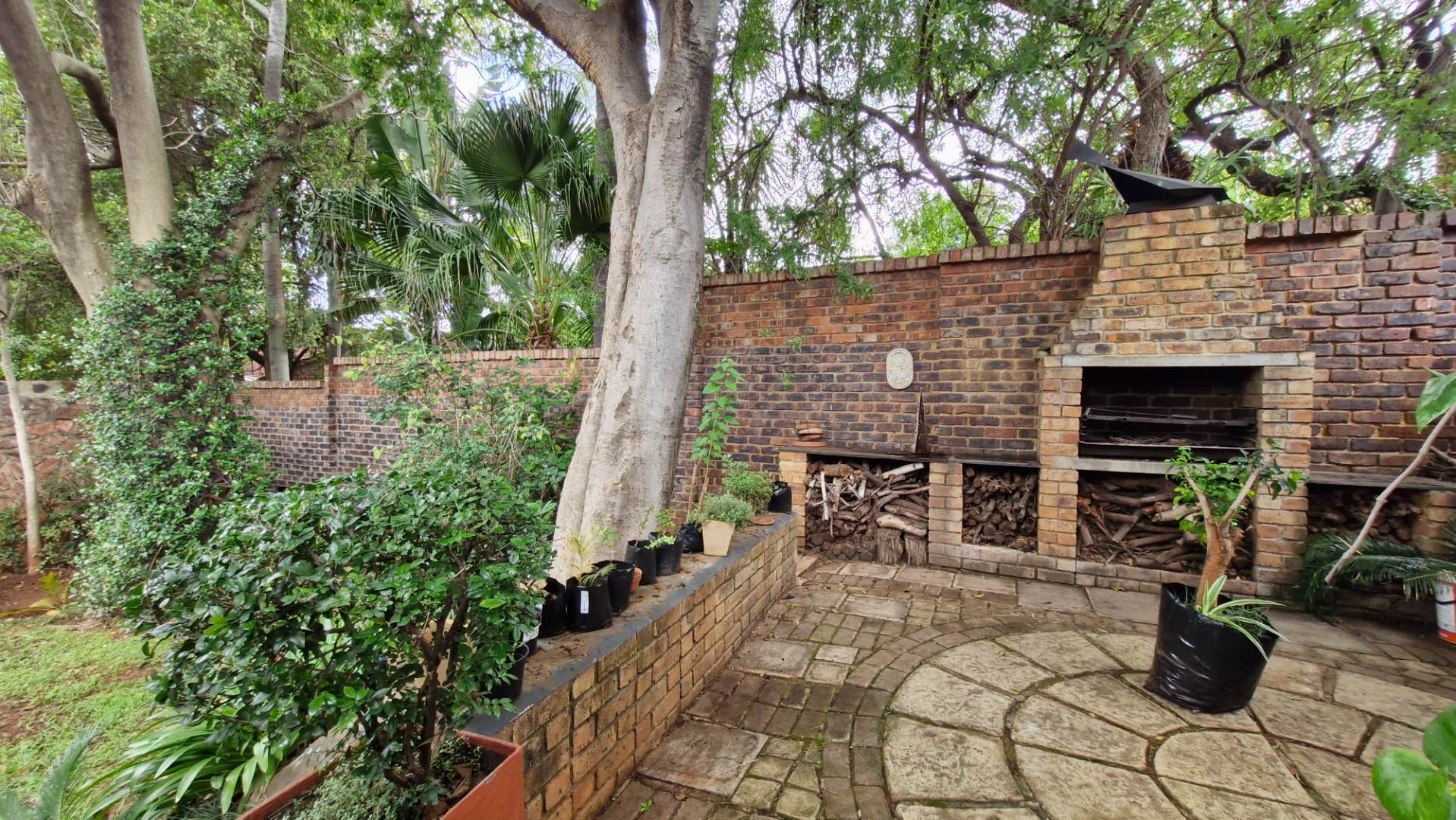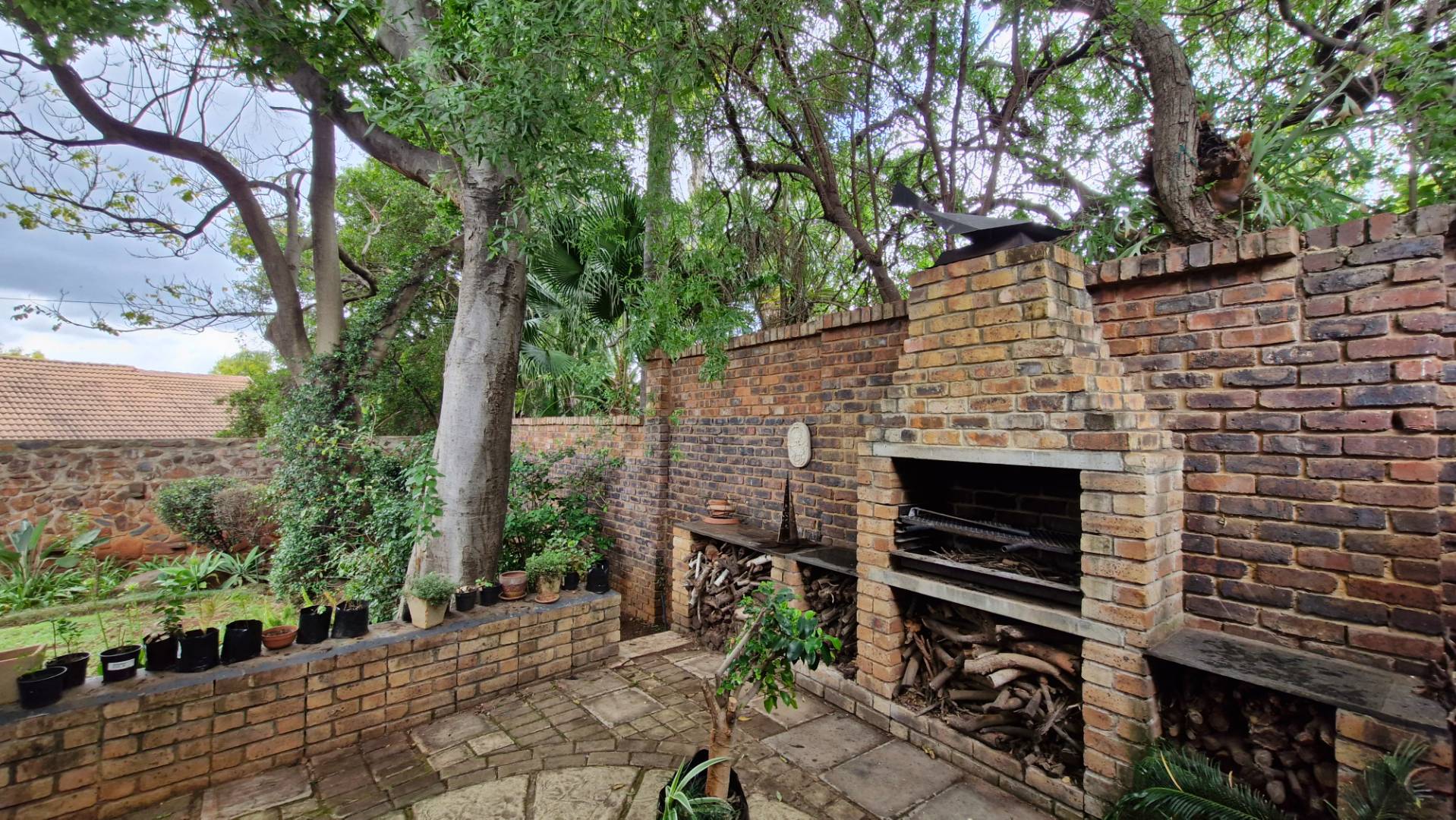 Classic touches such as wooden window frames and a terracotta tiled roof lend the home character and warmth. Outside, a patio with a louvre roof creates a versatile outdoor entertainment area. The established garden is a standout feature, with mature trees, an irrigation system, a tranquil water feature, and a built-in braai ideal for weekend gatherings.