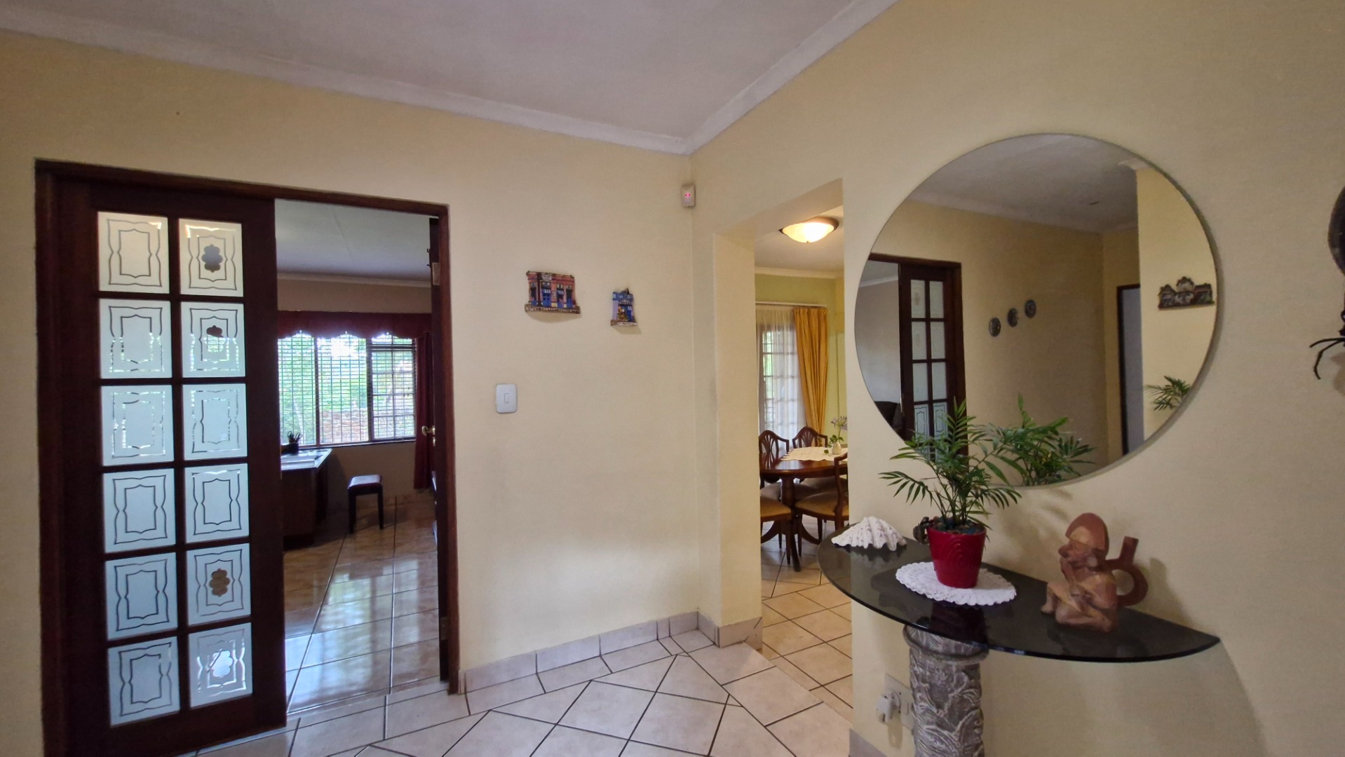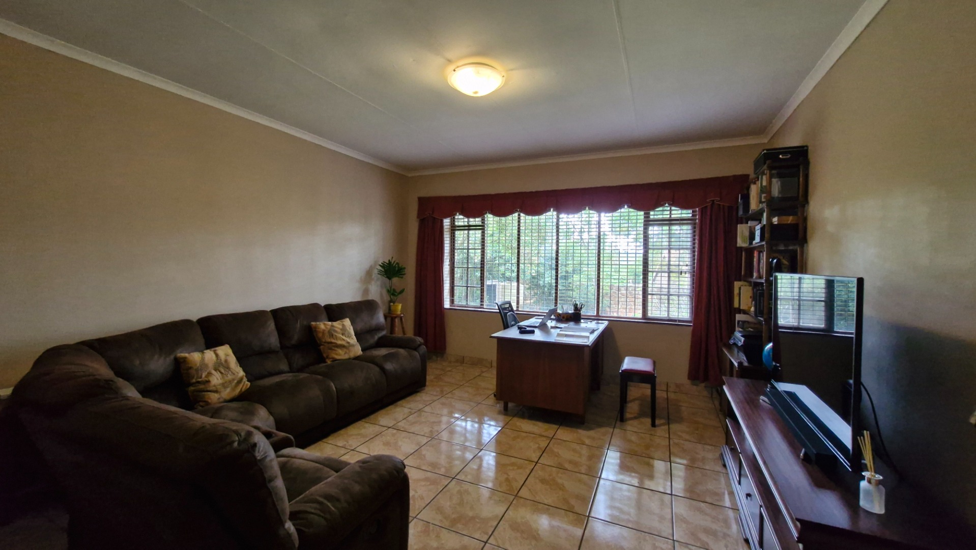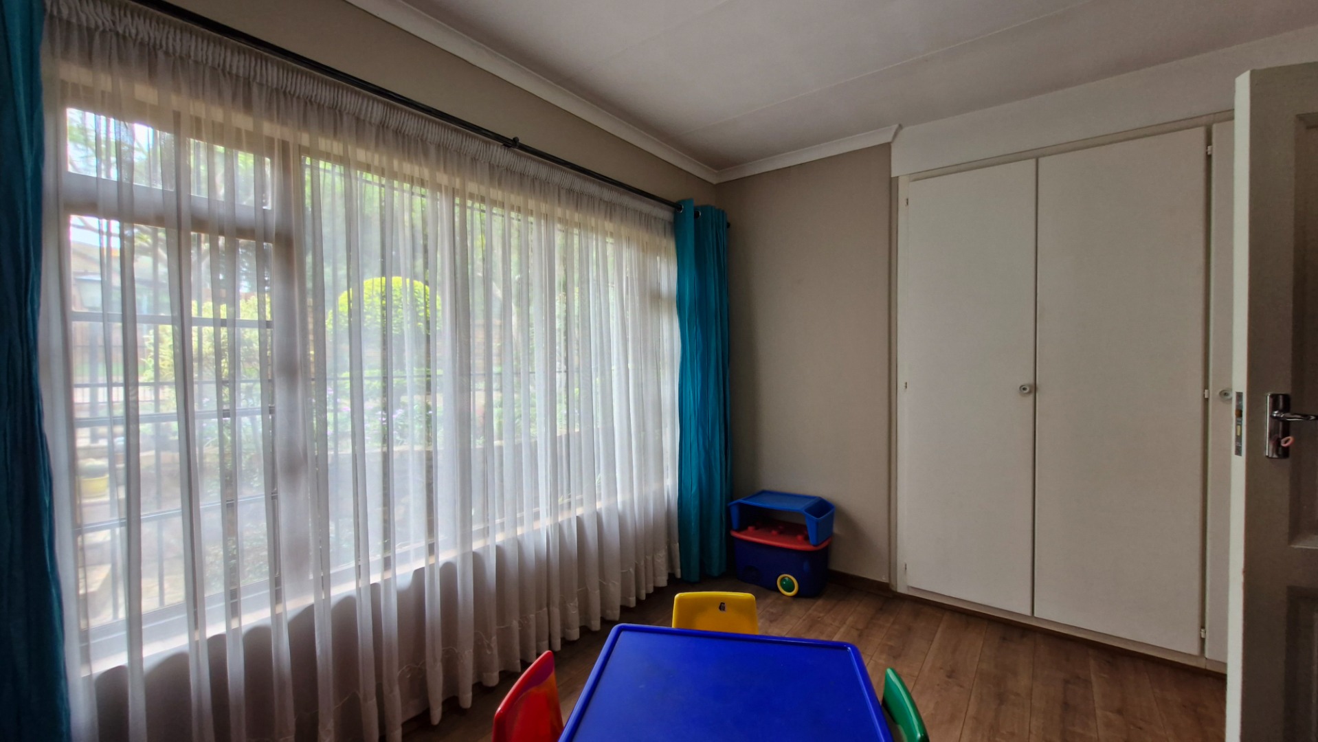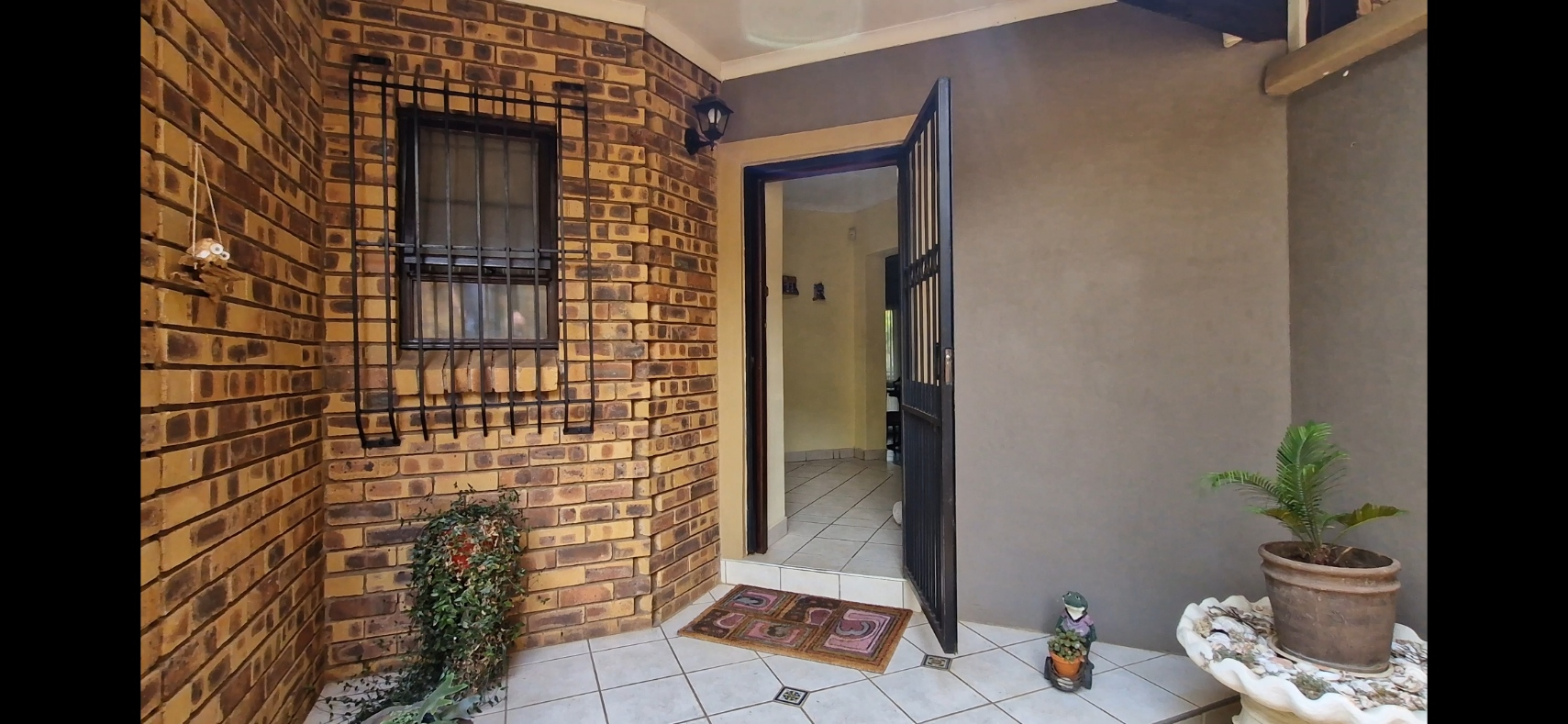 Classic touches such as wooden window frames and a terracotta tiled roof lend the home character and warmth. Outside, a patio with a louvre roof creates a versatile outdoor entertainment area. The established garden is a standout feature, with mature trees, an irrigation system, a tranquil water feature, and a built-in braai ideal for weekend gatherings.