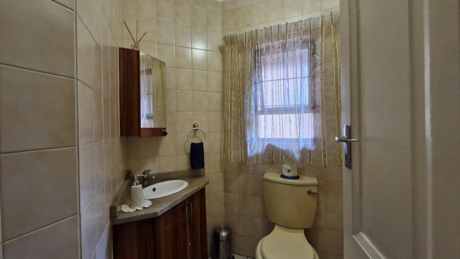 Accommodation includes three bedrooms, all with built-in cupboards and modern laminated flooring. The main bedroom is impressively large and is complemented by its own full en-suite bathroom. The remaining bedrooms are serviced by a second bathroom, and a guest toilet is positioned for easy access.