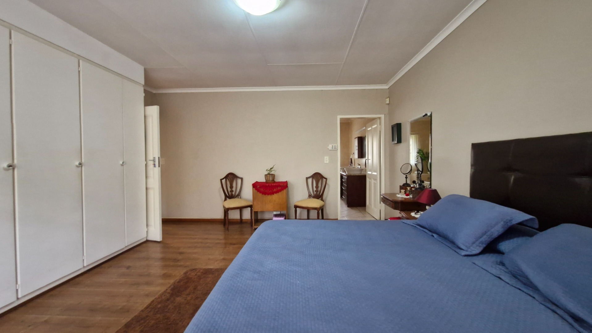 Accommodation includes three bedrooms, all with built-in cupboards and modern laminated flooring. The main bedroom is impressively large and is complemented by its own full en-suite bathroom. The remaining bedrooms are serviced by a second bathroom, and a guest toilet is positioned for easy access.
