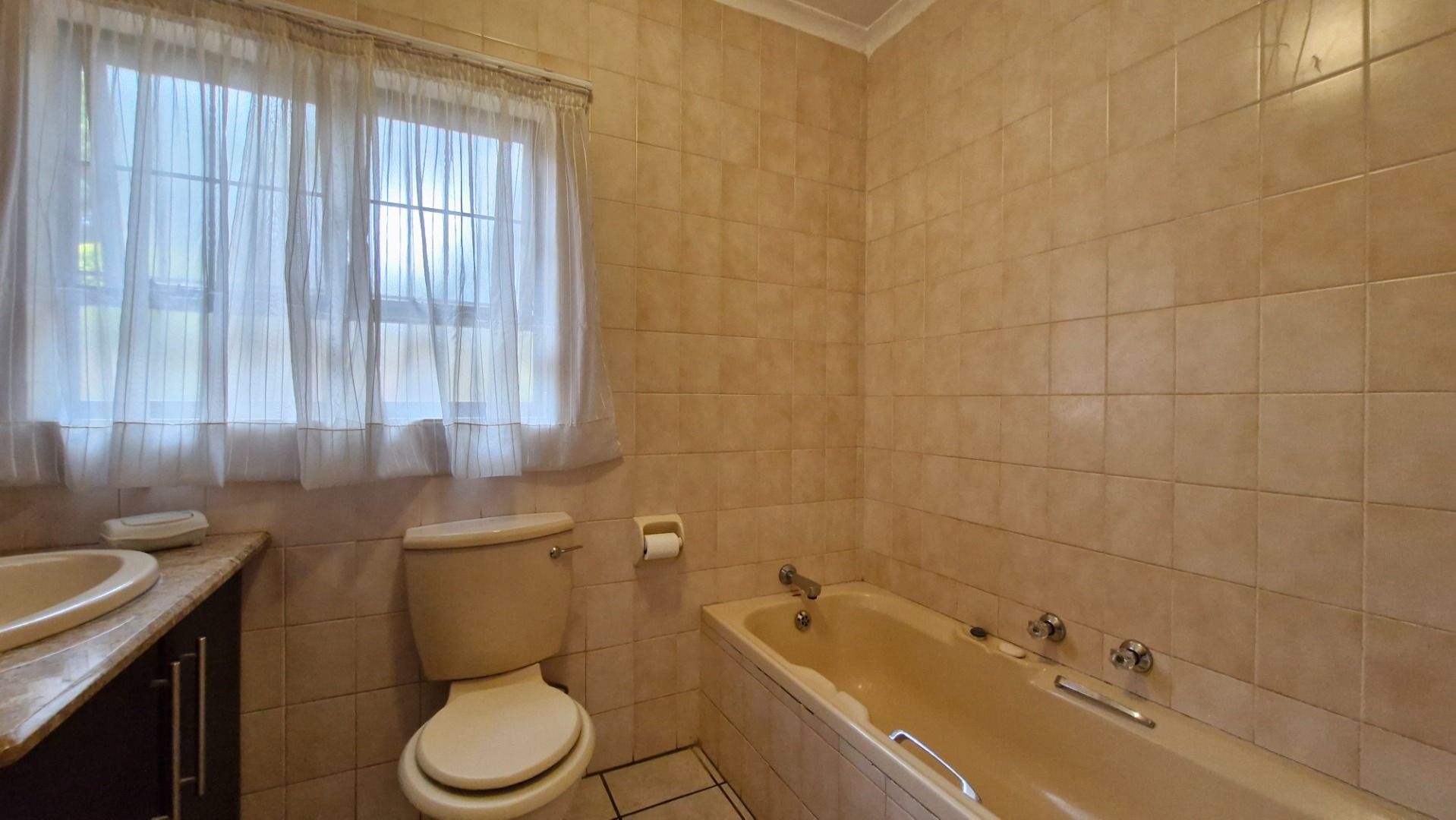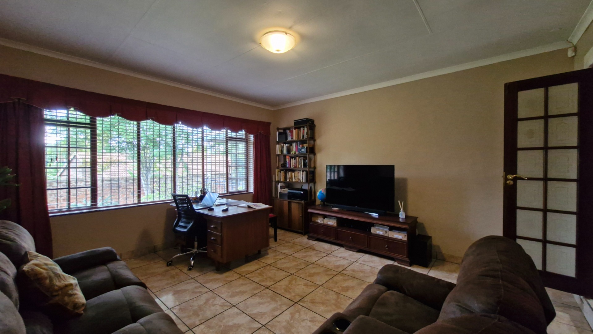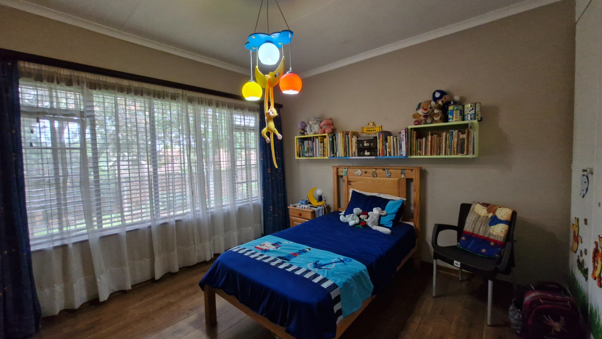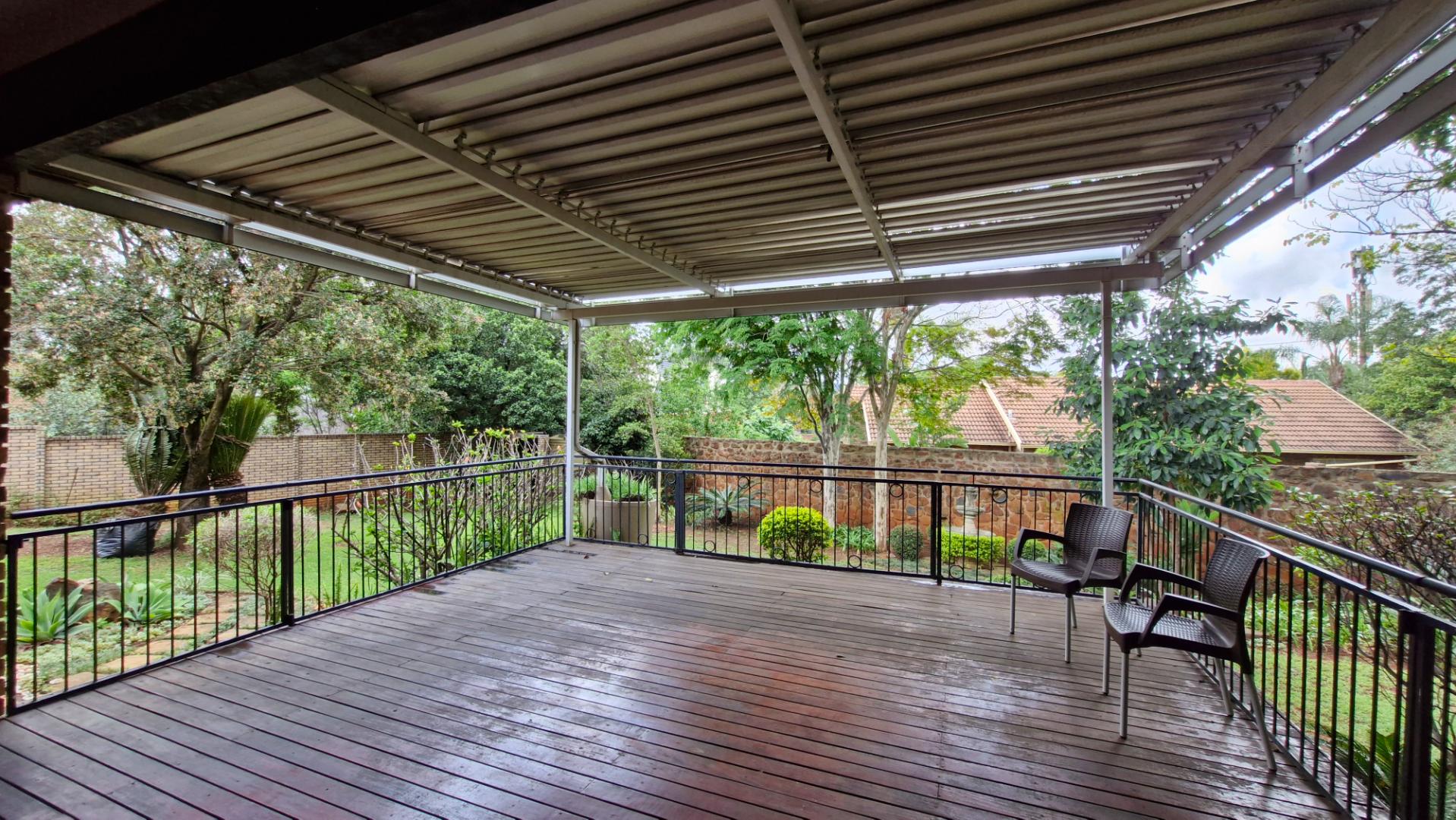 Classic touches such as wooden window frames and a terracotta tiled roof lend the home character and warmth. Outside, a patio with a louvre roof creates a versatile outdoor entertainment area. The established garden is a standout feature, with mature trees, an irrigation system, a tranquil water feature, and a built-in braai ideal for weekend gatherings.