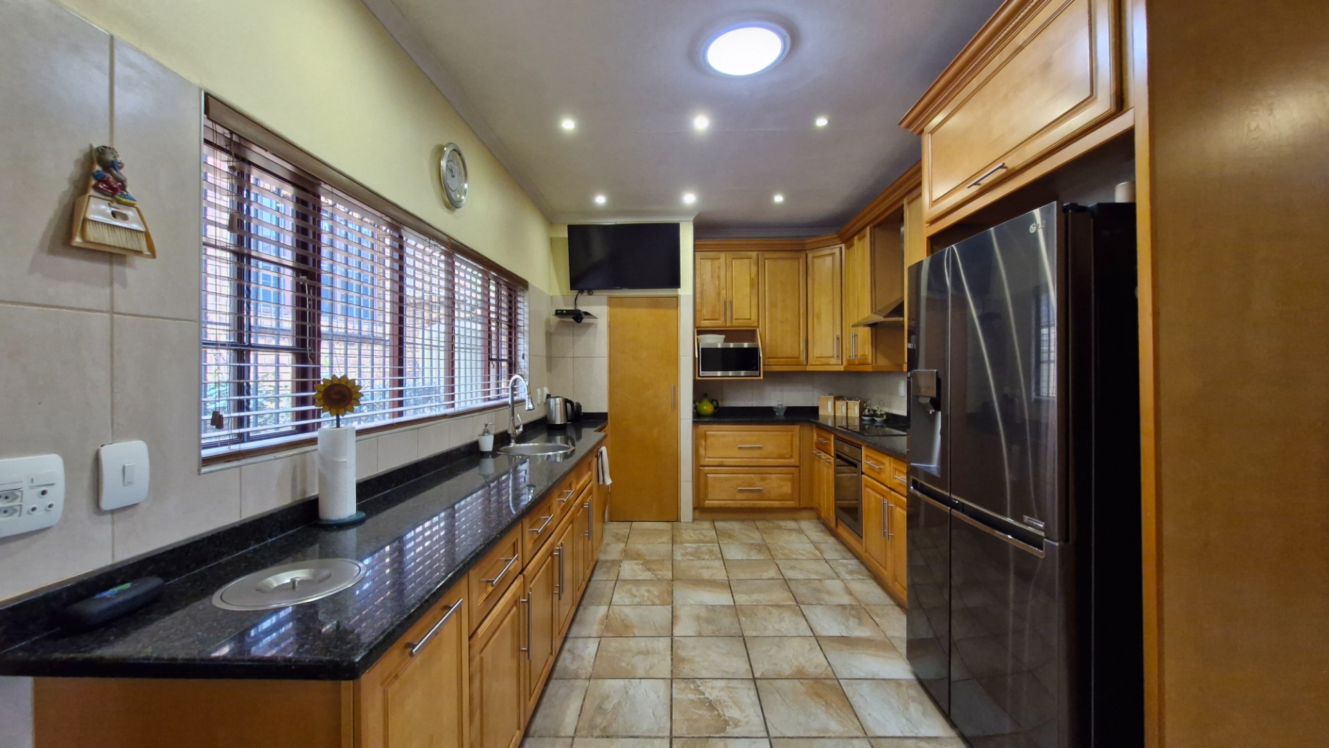 The home welcomes you through an inviting entrance hall that leads into a generously sized family room — a space that naturally becomes the heart of the home. A dedicated dining area makes hosting effortless, while the lounge provides a quieter atmosphere for relaxed evenings. The kitchen is both functional and stylish, fitted with granite countertops, solid wood cupboards, space for a double-door fridge, and a prep bowl. A scullery and a large pantry serve as thoughtful additions for day-to-day convenience.