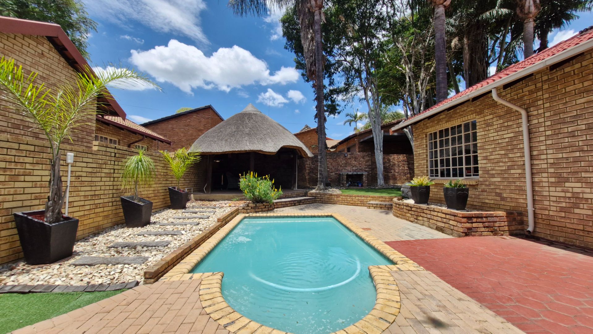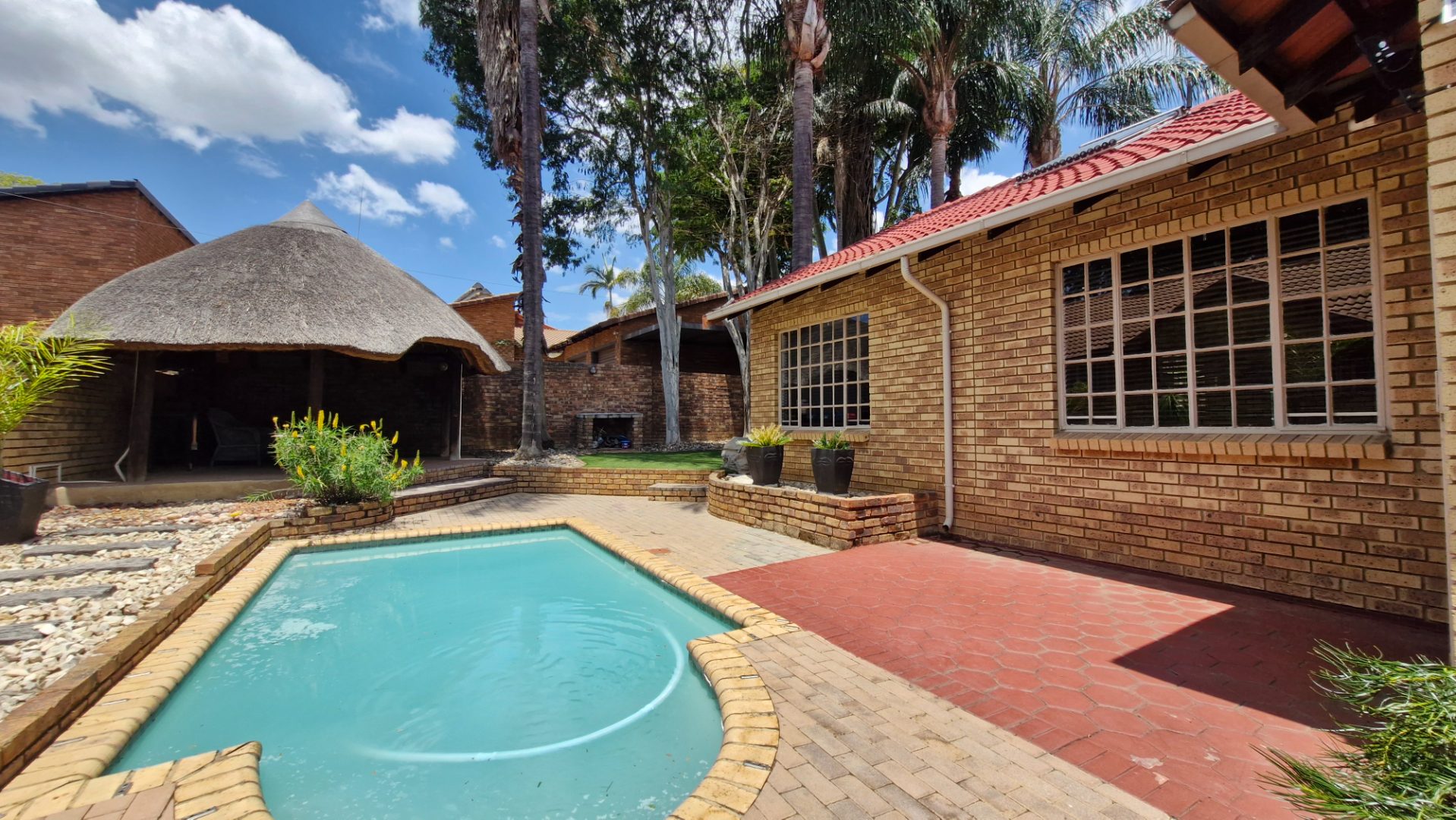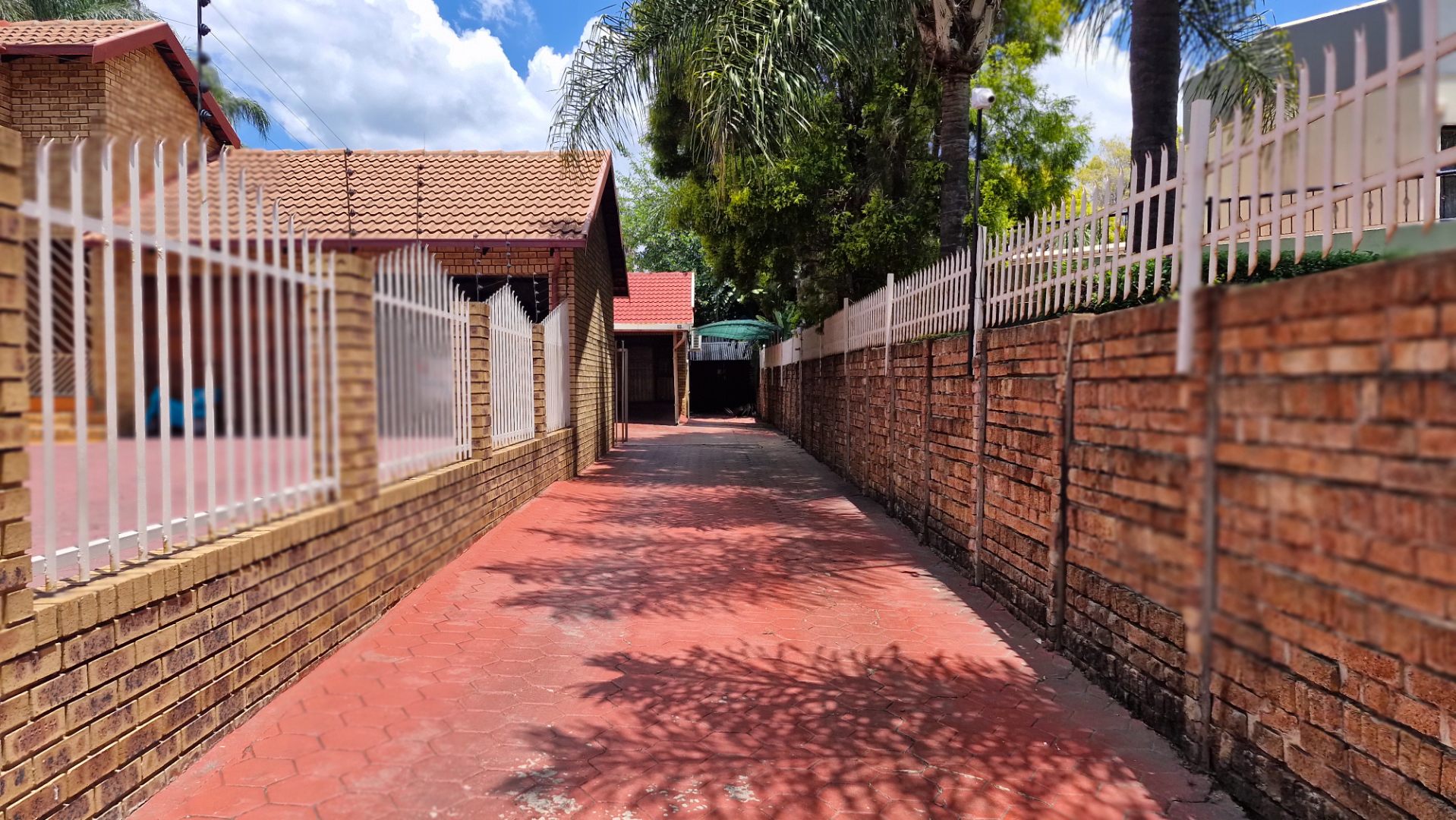 This distinguished residence, situated in the desirable suburban enclave of Faerie Glen, Pretoria, presents an exceptional opportunity for discerning homeowners. The property immediately impresses with its classic brick facade, red tiled roof, and a long, meticulously paved driveway leading to a covered carport, offering two dedicated parking spaces. Mature palm trees and lush greenery enhance the kerb appeal, complemented by robust brick boundary walls and comprehensive security features.
