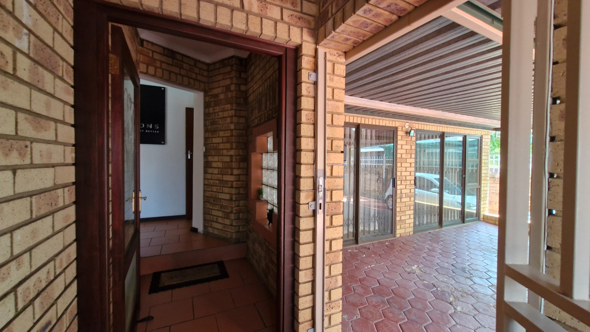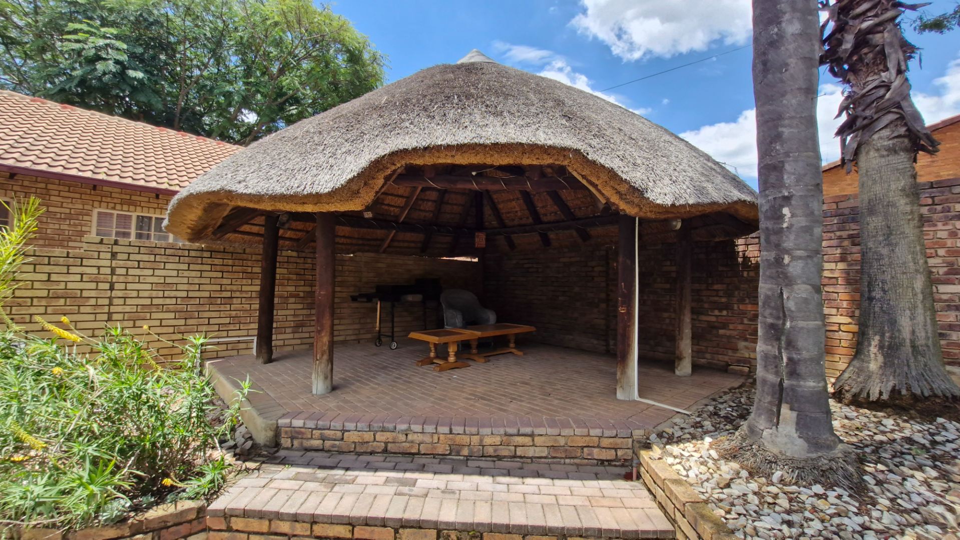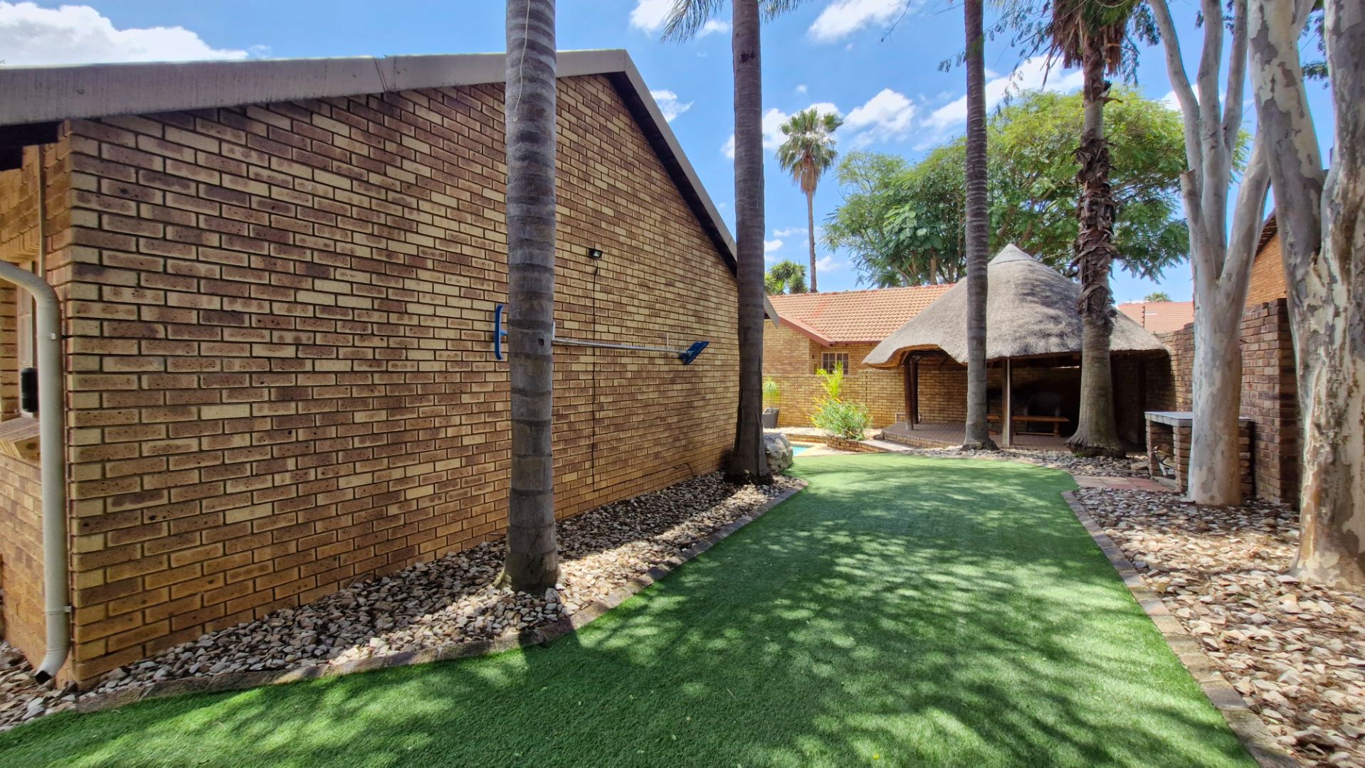This distinguished residence, situated in the desirable suburban enclave of Faerie Glen, Pretoria, presents an exceptional opportunity for discerning homeowners. The property immediately impresses with its classic brick facade, red tiled roof, and a long, meticulously paved driveway leading to a covered carport, offering two dedicated parking spaces. Mature palm trees and lush greenery enhance the kerb appeal, complemented by robust brick boundary walls and comprehensive security features.