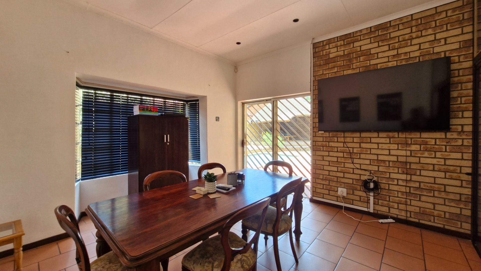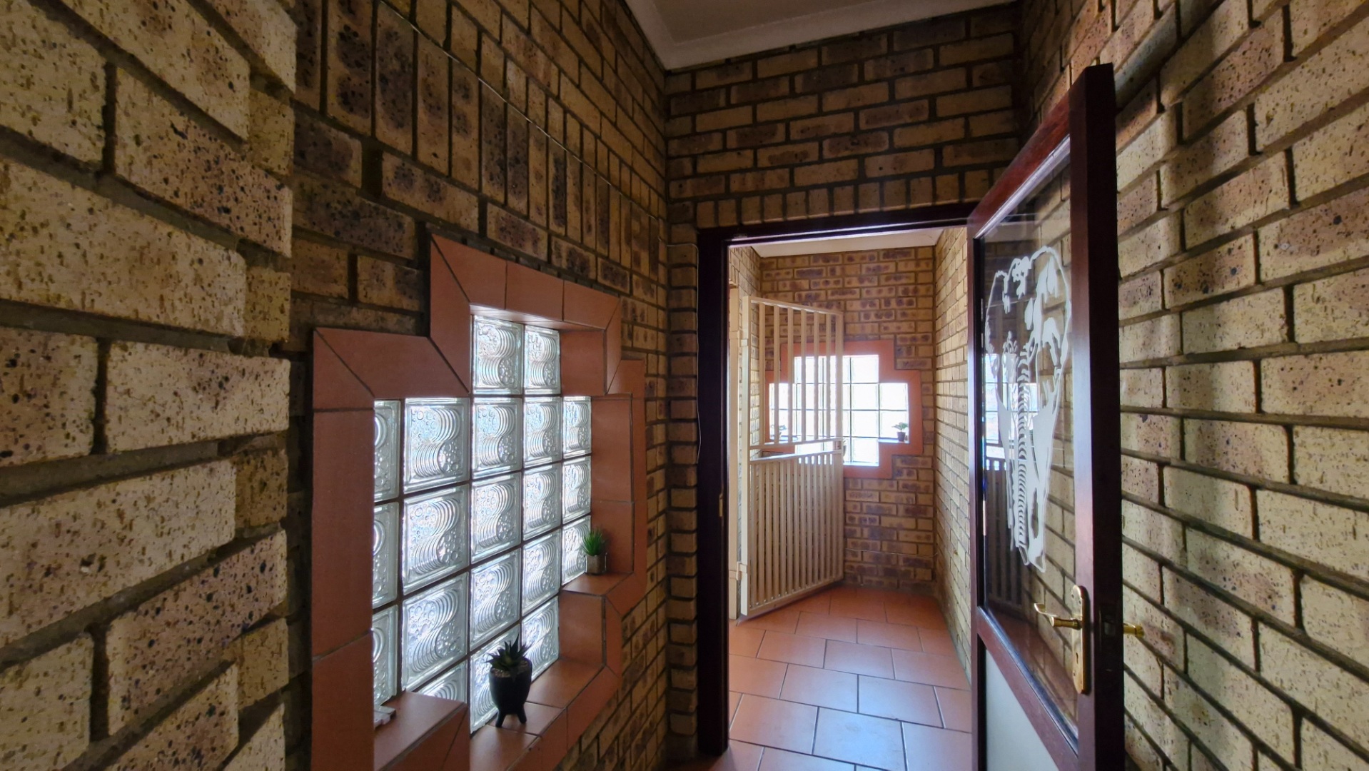 Upon entry, an inviting entrance hall leads into an intelligently designed interior spanning 206 square metres. The open-plan layout seamlessly connects the lounge, dining room, and dedicated family TV room, creating a comfortable flow ideal for everyday living and entertaining. Striking exposed brick feature walls, terracotta-style tiled flooring, and elegant glass block windows amplify the home’s character, while recessed lighting enhances the ambience. Climate control is ensured through air conditioning, and a charming fireplace adds warmth and atmosphere. A functional kitchen and dedicated study further elevate day-to-day convenience.