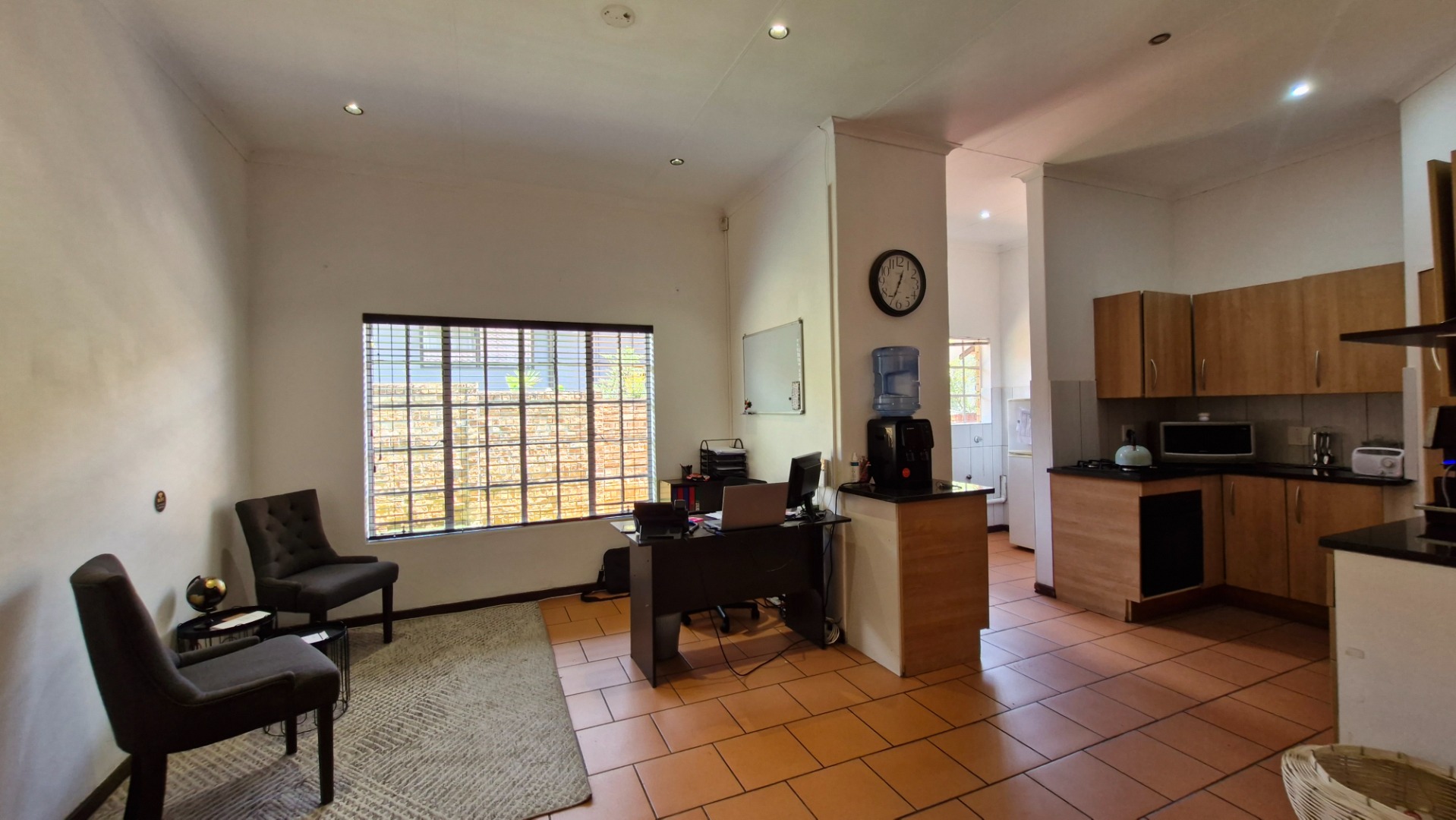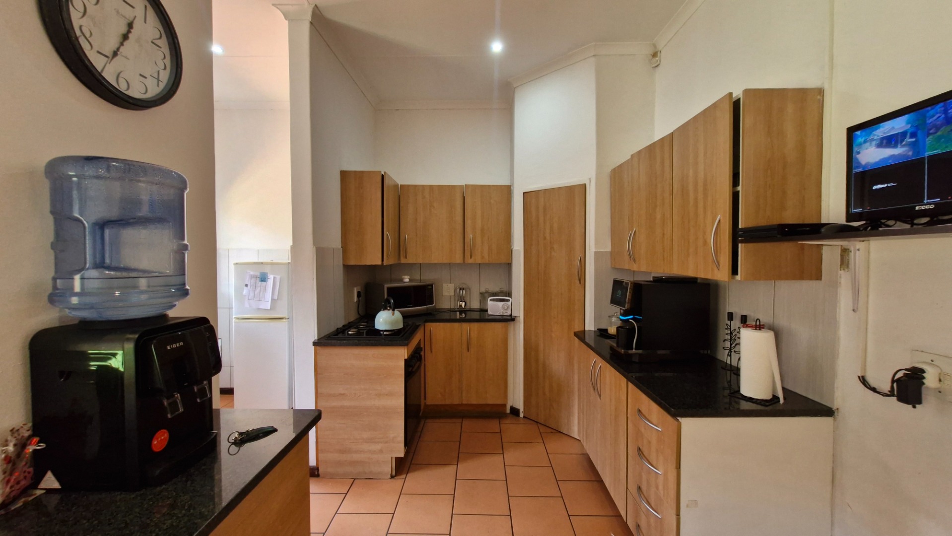 Security is paramount, with an alarm system, multiple security gates, window bars, an electric fence, and a security camera ensuring peace of mind. The entire perimeter is totally walled, providing an enhanced sense of privacy and protection. Modern living is further supported by fibre connectivity, catering to contemporary digital demands. Pets are permitted, making this an ideal family home.
