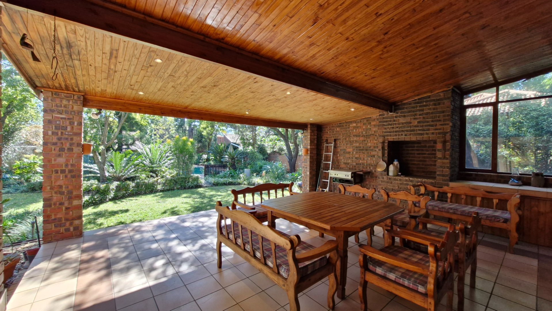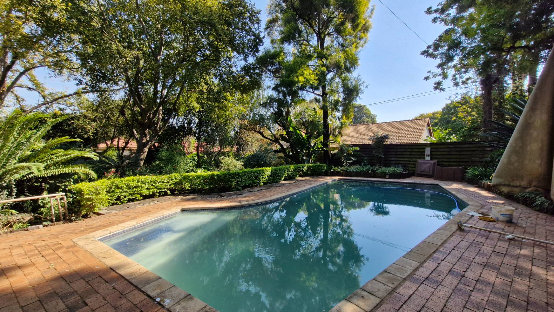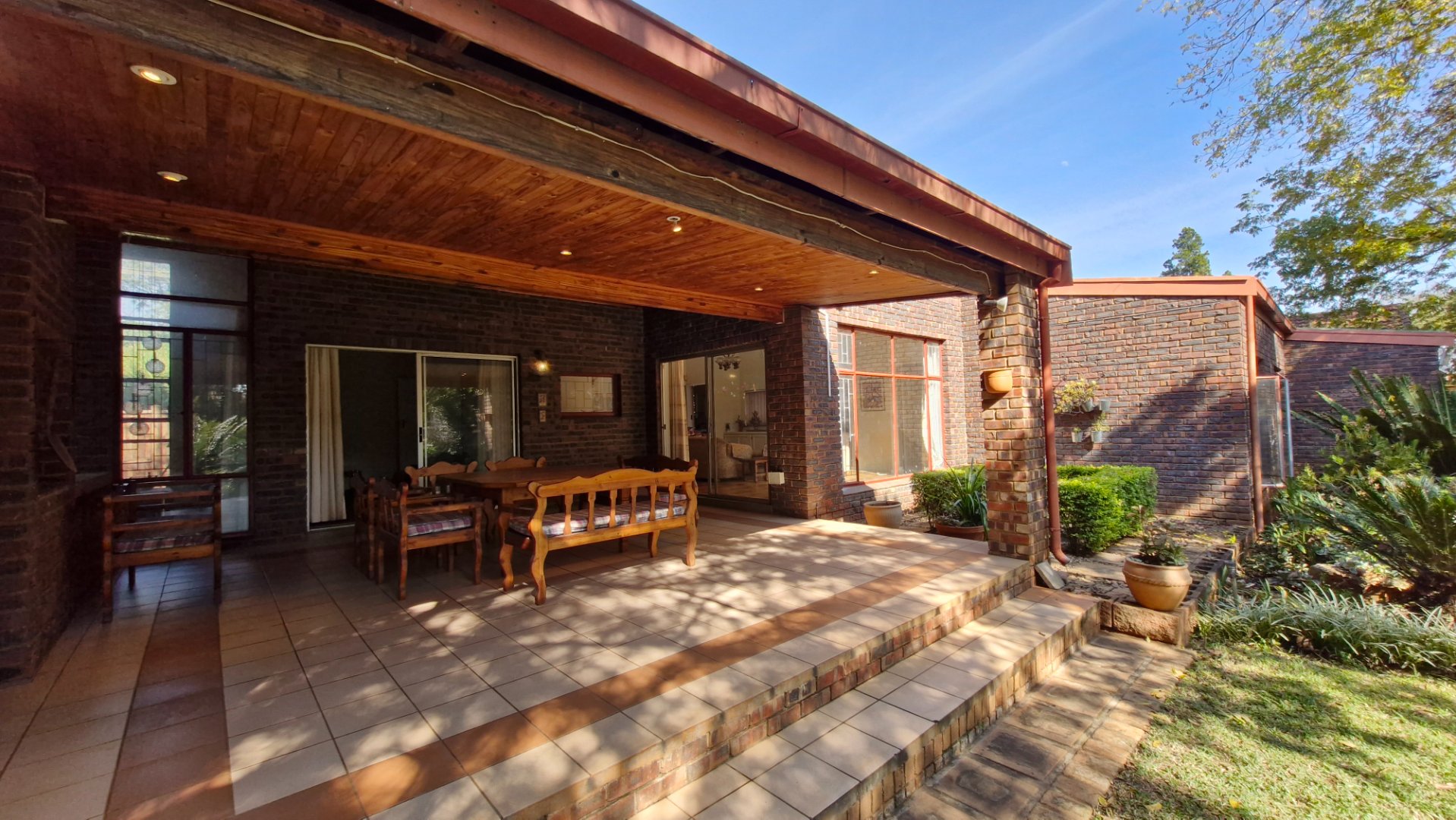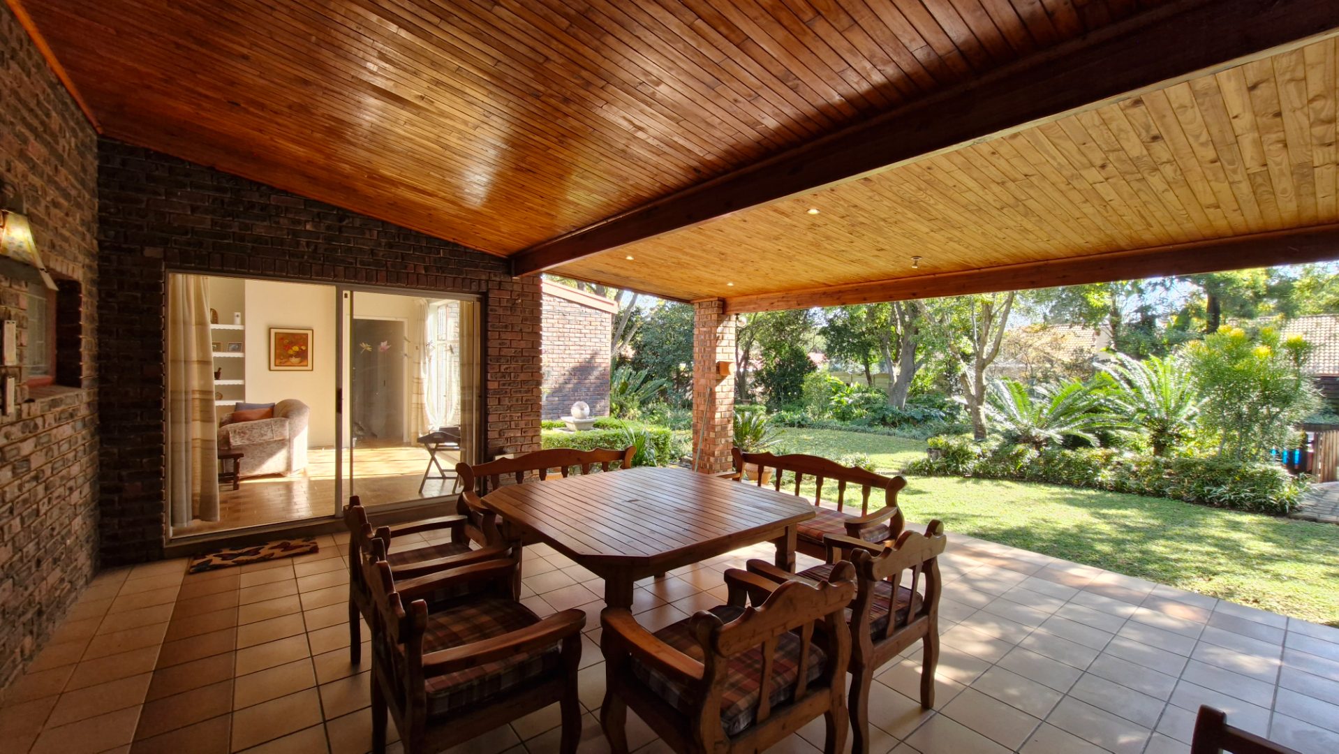 Vast, shaded patio overlooks a sparkling pool and mature, irrigated gardens fed by a strong borehole—a rare asset in Lynnwood Park.