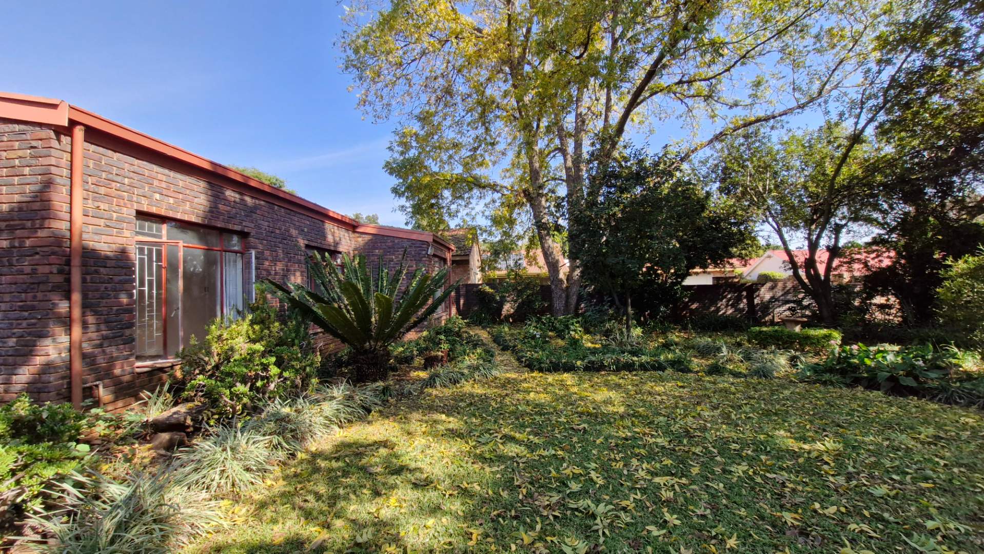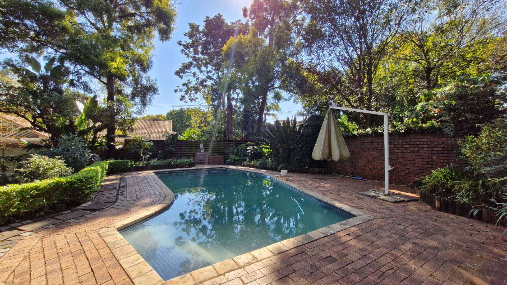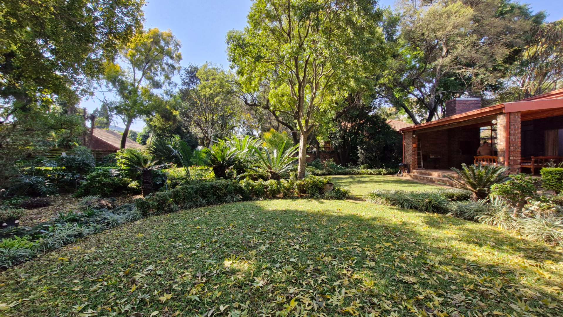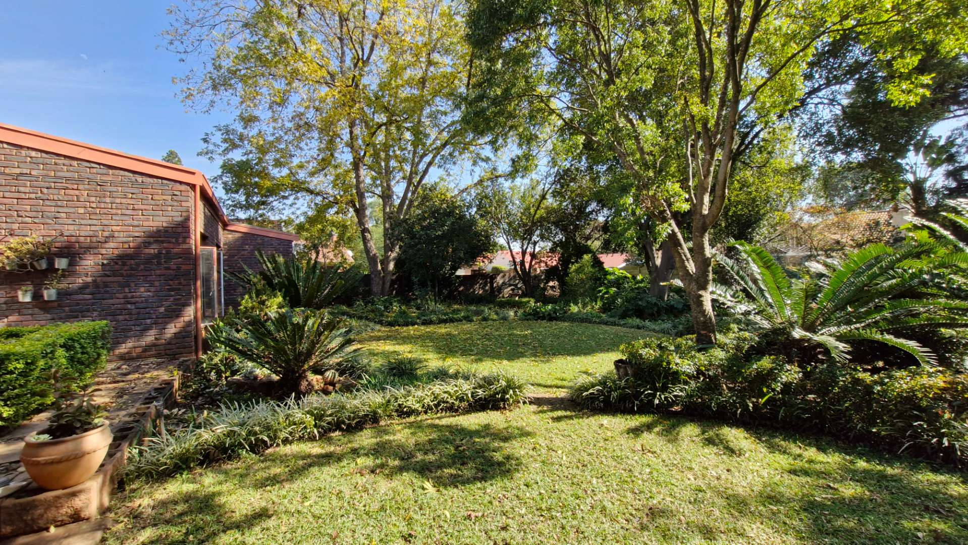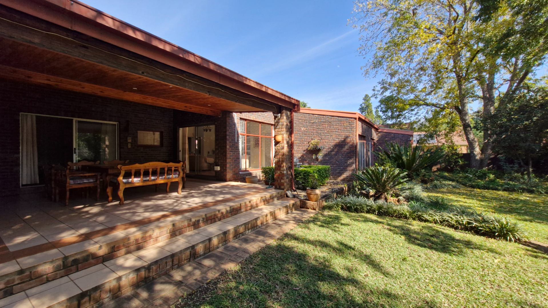 Vast, shaded patio overlooks a sparkling pool and mature, irrigated gardens fed by a strong borehole—a rare asset in Lynnwood Park.