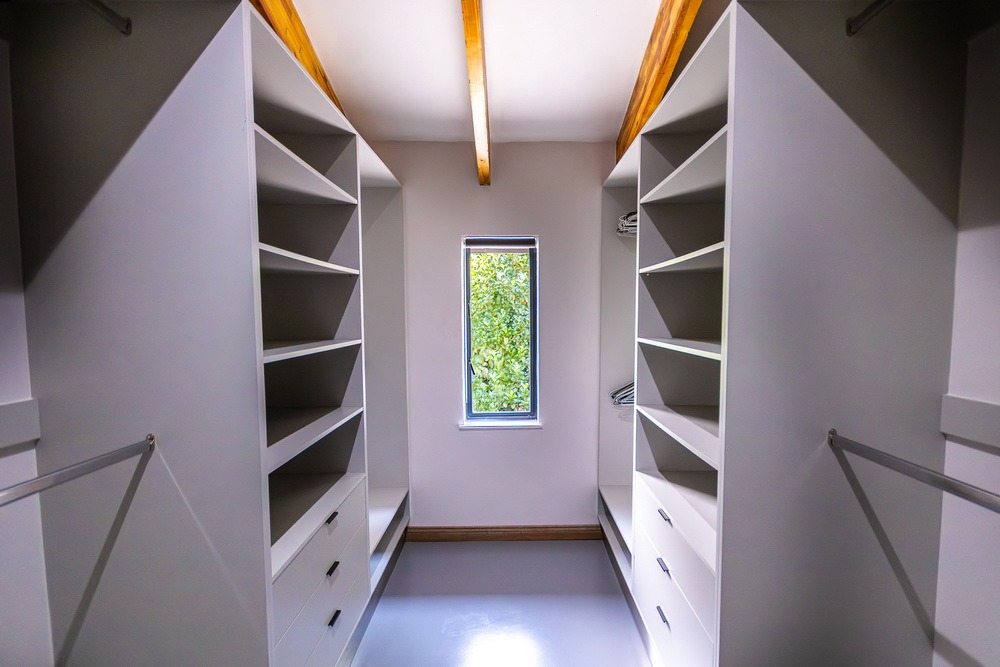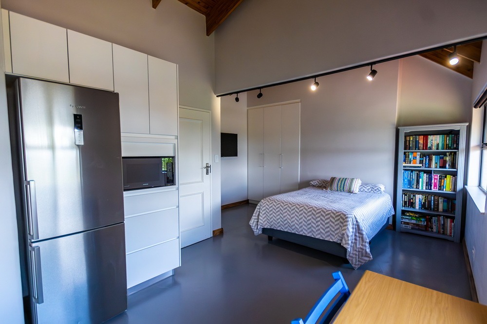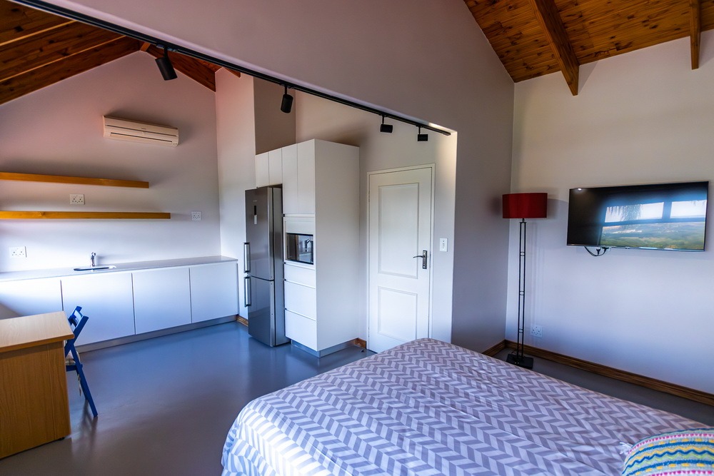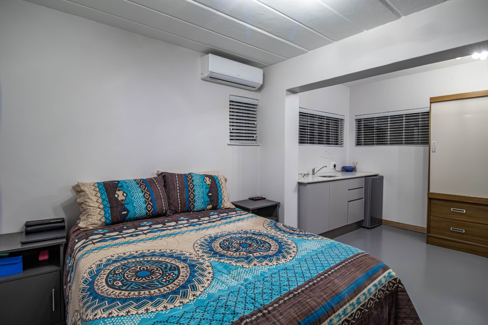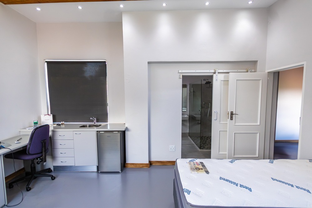 - A bedroom suite with built-in cupboards, a desk, a kitchenette (with a bar fridge), and an en-suite bathroom