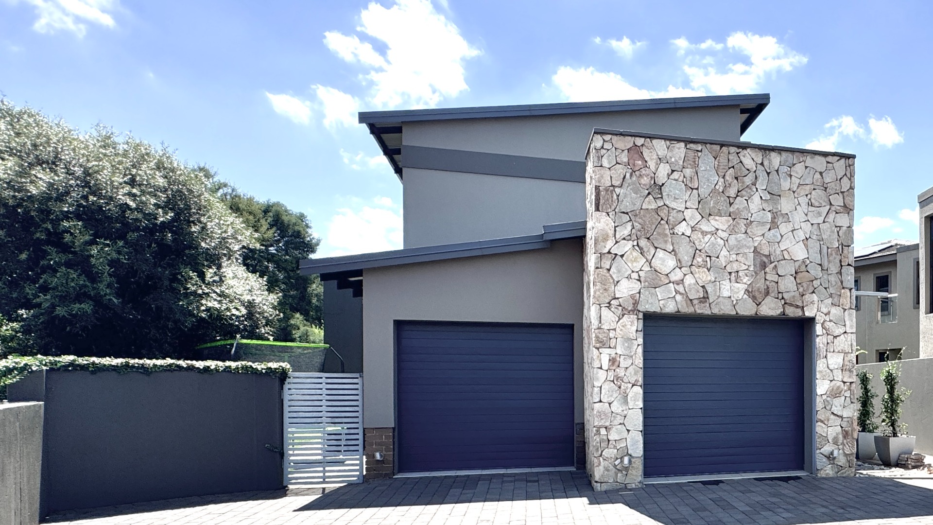 Nestled within the highly regarded Newmark Estate in Pretoria East, this contemporary residence makes an immediate impression with its striking natural stone cladding, sophisticated dark walls, and bold angular rooflines. Positioned in a quiet cul-de-sac, the home offers a rare combination of privacy, exclusivity, and refined estate living.