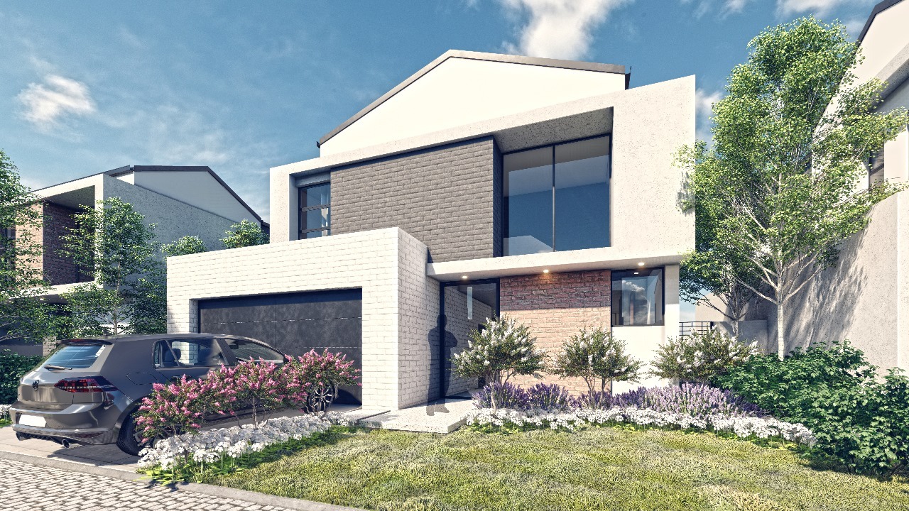 · Modern architecture with white brick, dark grey, and natural brick finishes