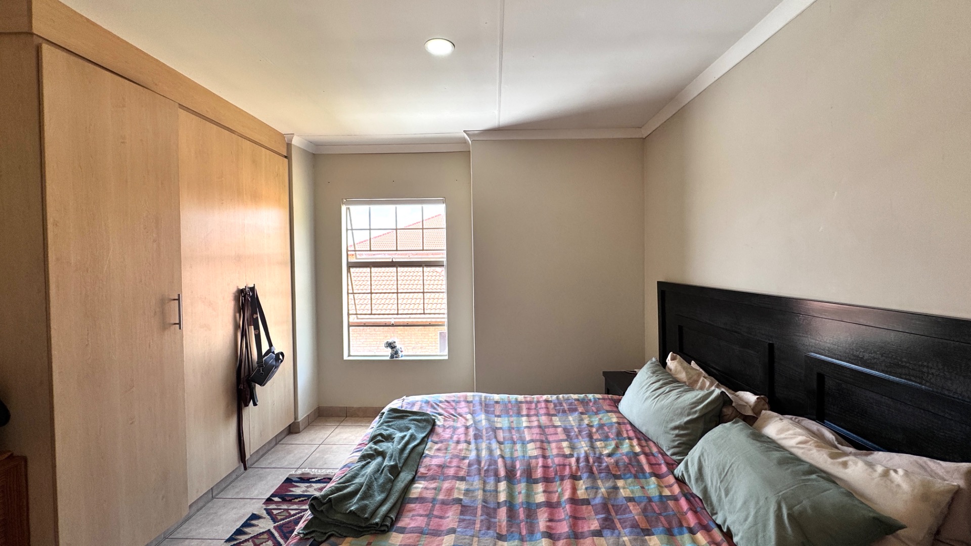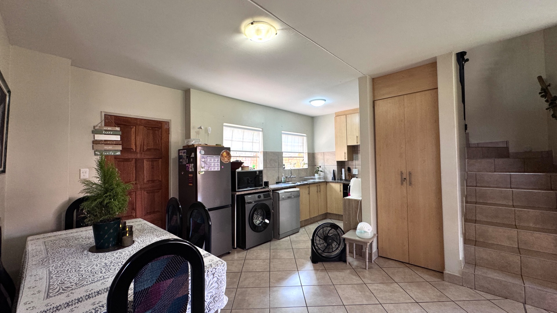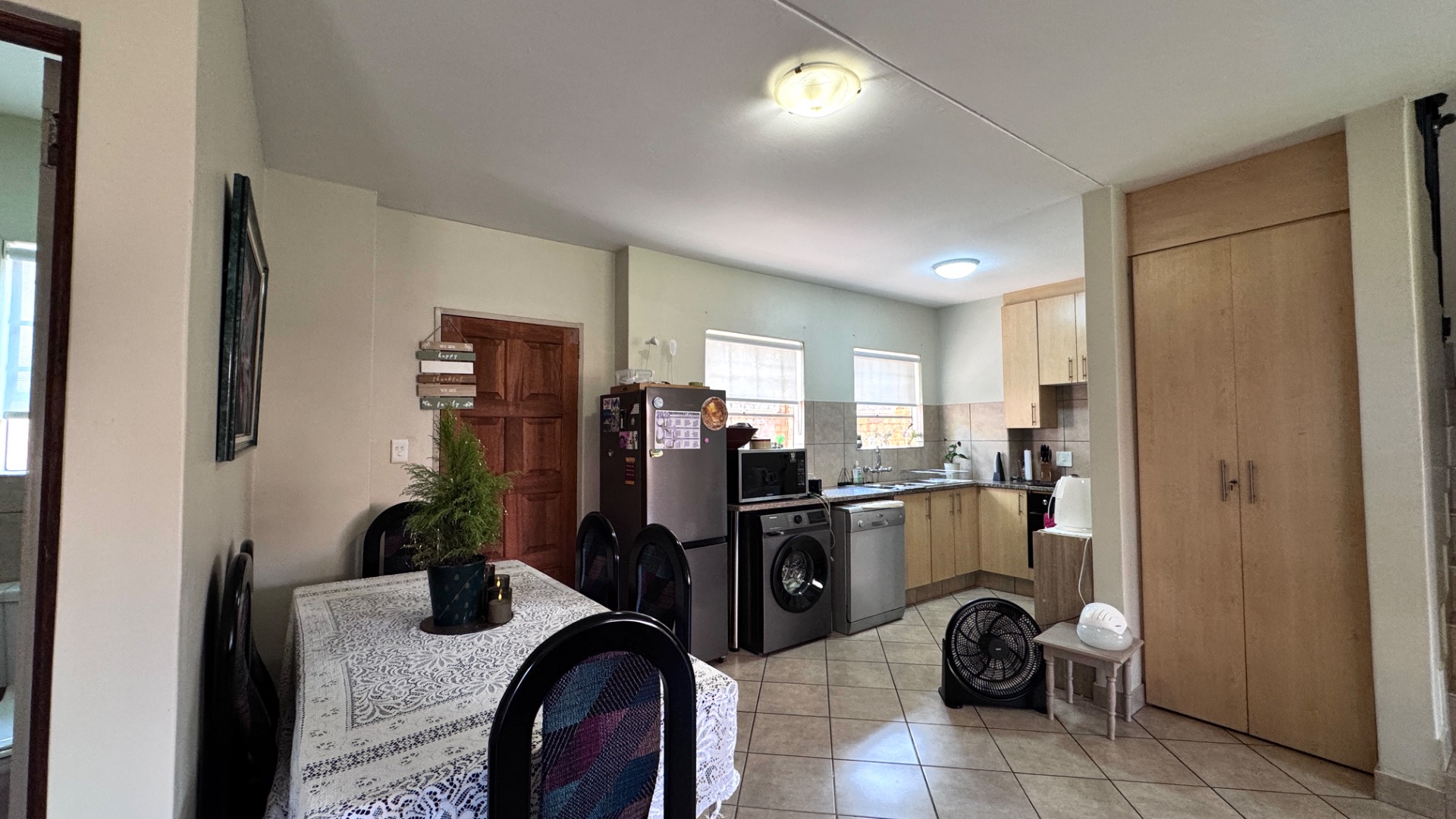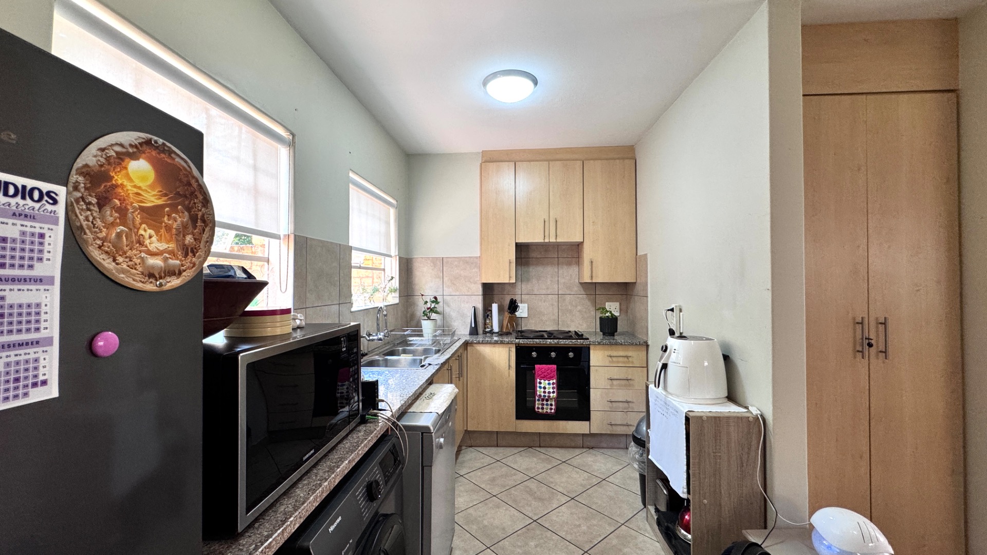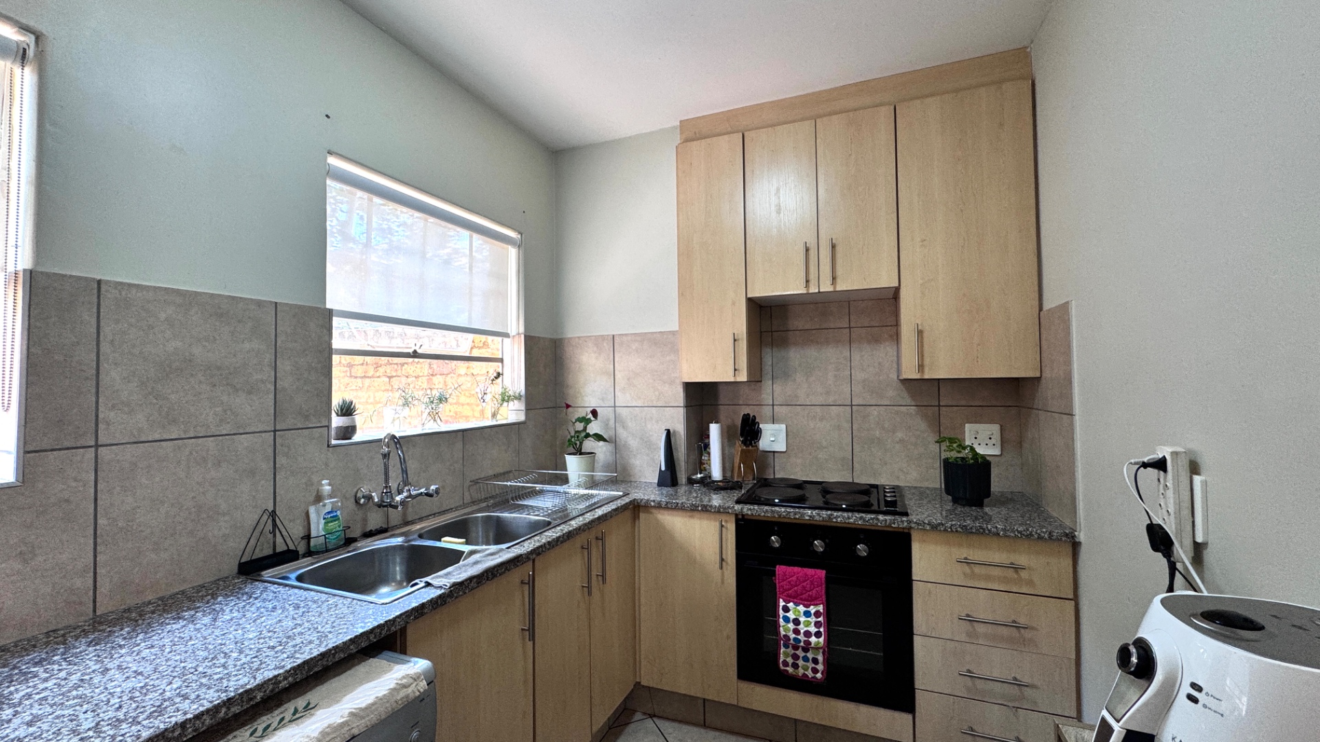 Step inside to an open-plan living and dining area, characterized by tiled flooring and neutral wall colours, creating a bright and airy atmosphere. Large windows and sliding doors ensure abundant natural light, enhancing the sense of space. The functional L-shaped kitchen is equipped with light wooden cabinets, granite-look countertops, a built-in oven and hob, and ample space for appliances, including a washing machine. An open-plan design seamlessly connects the kitchen to the dining area, perfect for everyday living and entertaining.