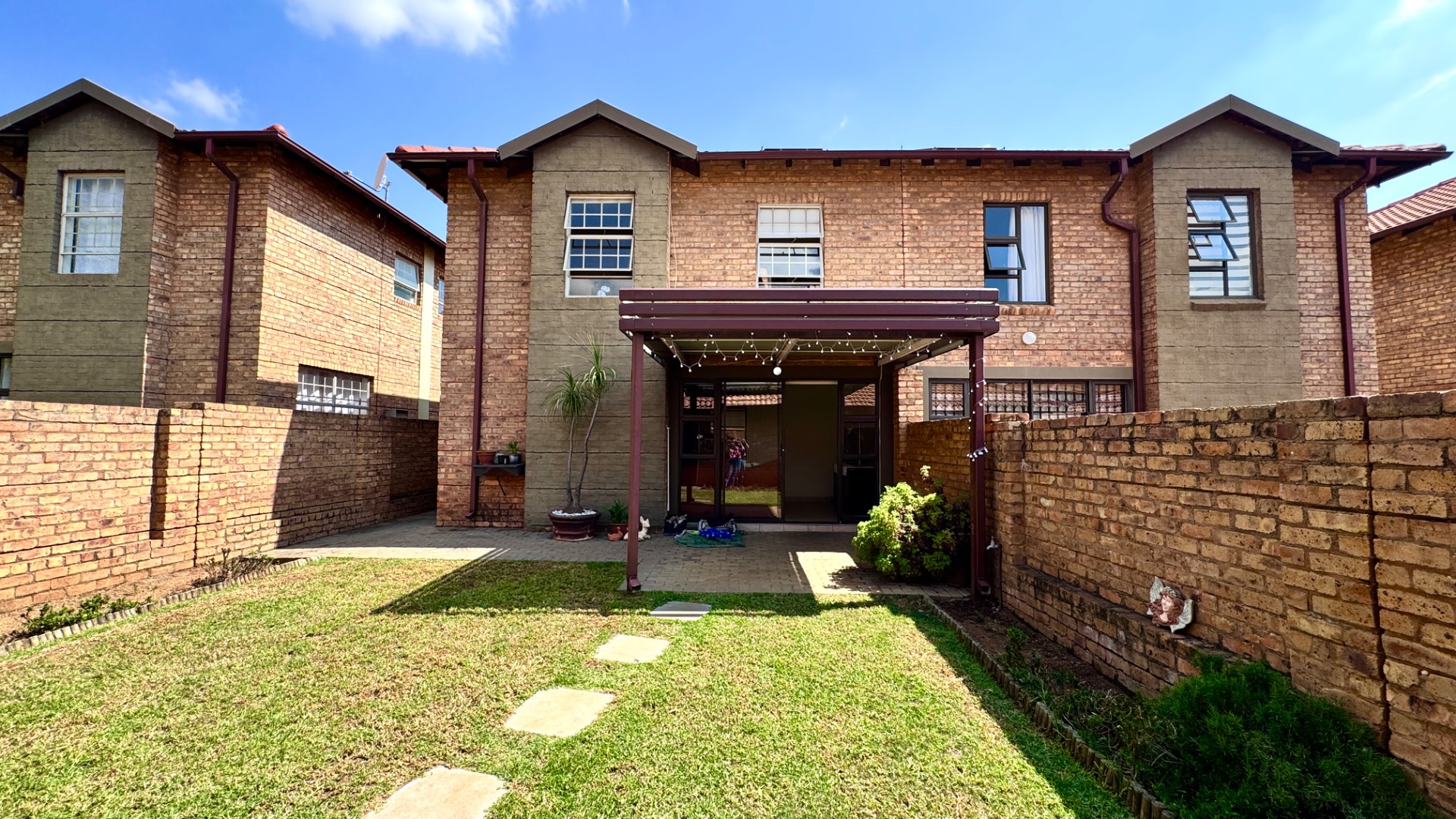 Outside, a private, walled garden with a small, well-maintained lawn and a paved patio under a pergola offers a tranquil space for relaxation or outdoor dining. The property includes a double garage, providing secure parking and storage. Pets are allowed, making this an ideal home for animal lovers. Enjoy the benefits of a security estate with 24-hour security, access gates, and fibre connectivity.
