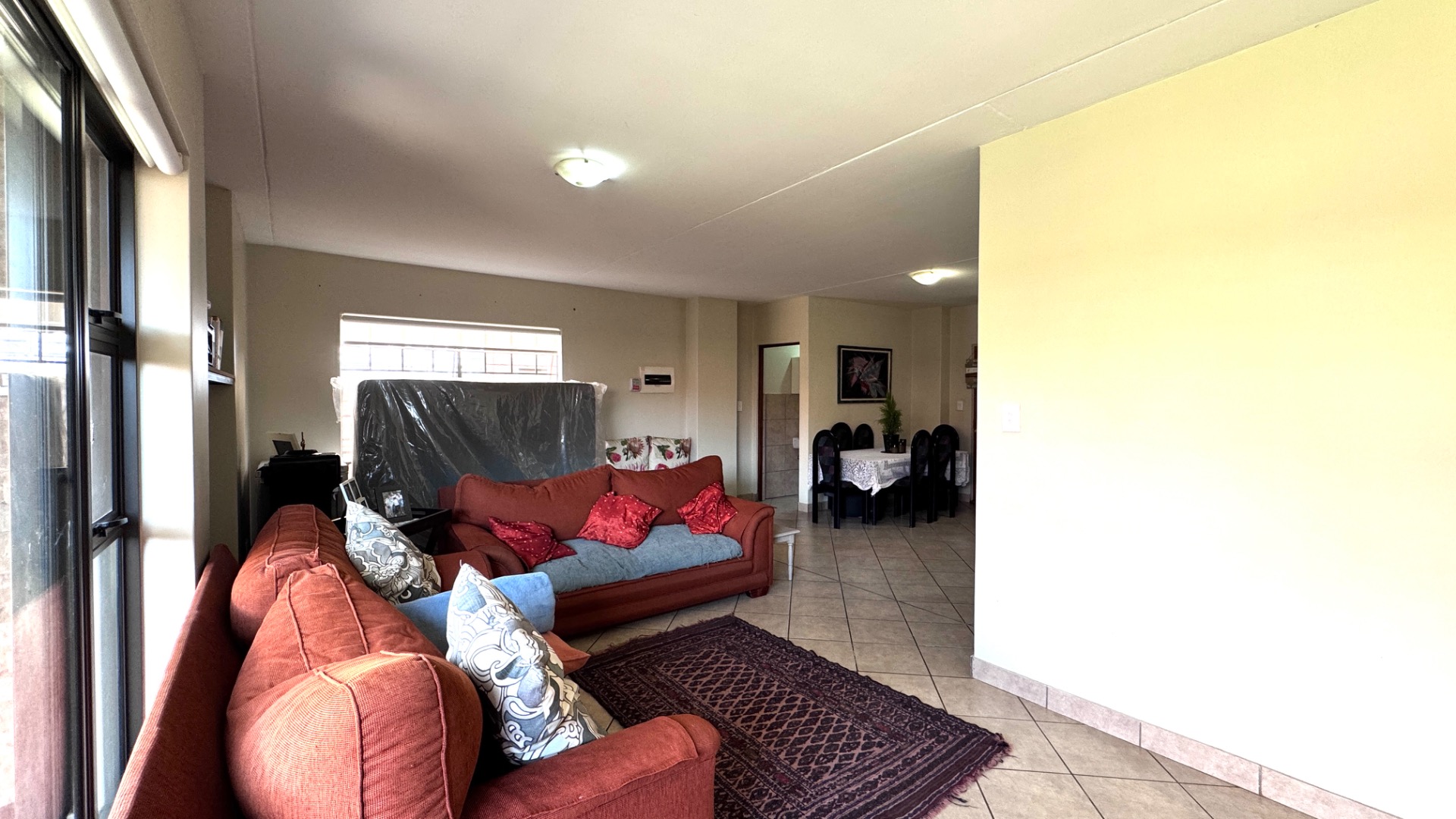 Step inside to an open-plan living and dining area, characterized by tiled flooring and neutral wall colours, creating a bright and airy atmosphere. Large windows and sliding doors ensure abundant natural light, enhancing the sense of space. The functional L-shaped kitchen is equipped with light wooden cabinets, granite-look countertops, a built-in oven and hob, and ample space for appliances, including a washing machine. An open-plan design seamlessly connects the kitchen to the dining area, perfect for everyday living and entertaining.
